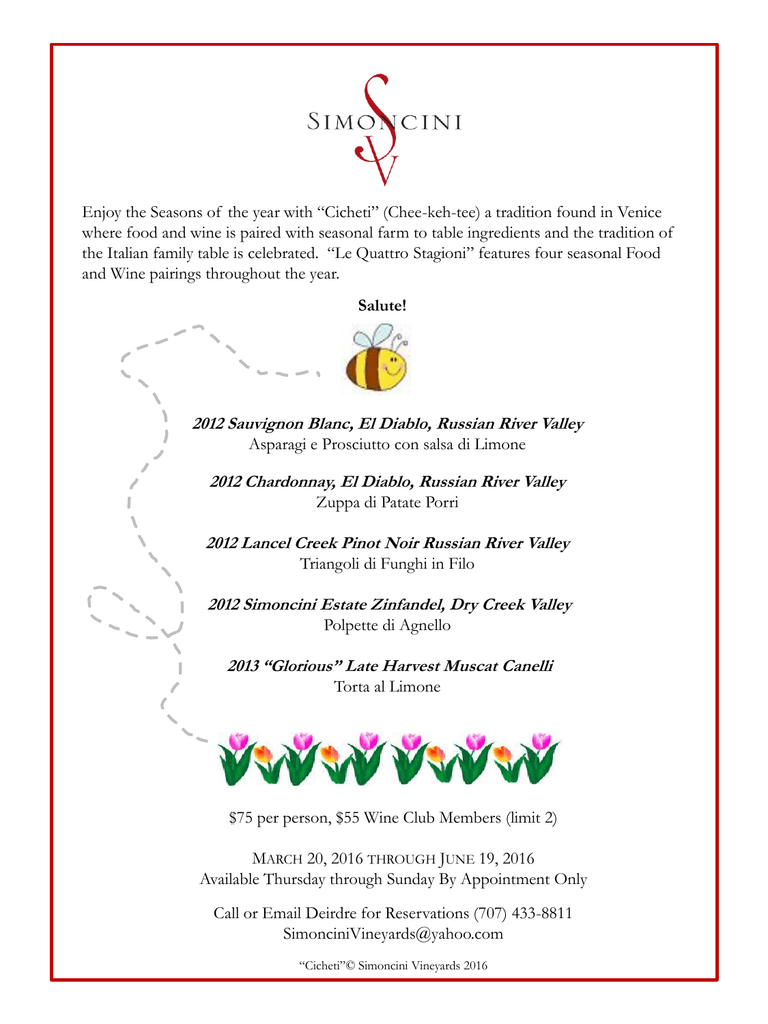 Enjoy the Seasons of the year with “Cicheti” (Chee-keh-tee) a tradition found in Venice where food and wine is paired with seasonal farm to table ingredients and the tradition of the Italian family table is celebrated. “Le Quattro Stagioni” features four seasonal Food and Wine pairings throughout the year. Salute! 2012 Sauvignon Blanc, El Diablo, Russian River Valley Asparagi e Prosciutto con salsa di Limone 2012 Chardonnay, El Diablo, Russian River Valley Zuppa di Patate Porri 2012 Lancel Creek Pinot Noir Russian River Valley Triangoli di Funghi in Filo 2012 Simoncini Estate Zinfandel, Dry Creek Valley Polpette di Agnello 2013 “Glorious” Late Harvest Muscat Canelli Torta al Limone $75 per person, $55 Wine Club Members (limit 2) MARCH 20, 2016 THROUGH JUNE 19, 2016 Available Thursday through Sunday By Appointment Only Call or Email Deirdre for Reservations (707) 433-8811 [email protected] “Cicheti”© Simoncini Vineyards 2016