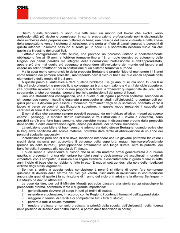 Confederazione Generale Italiana del Lavoro _______________________________________________________________________________ Dietro queste tendenze ci sono due fatti reali: un mondo del lavoro che evolve verso professionalità più ricche e complesse, in cui la preparazione professionale non è disgiungibile dalla ricchezza della preparazione culturale di base; una crescita del livello culturale e delle attese della popolazione verso il sistema di istruzione, che porta al rifiuto di canali separati e percepiti di qualità inferiore. Insomma nessuno si sente più in serie B, e soprattutto nessuno vuole più che quello sia il destino dei propri figli. L’attuale configurazione della scuola, che prevede un percorso unitario e scolasticamente obbligatorio fino ai 15 anni, e l’obbligo formativo fino ai 18, un ruolo decisivo ed autonomo delle Regioni nei canali paralleli ma integrati della Formazione Professionale e dell’apprendistato, appare più che mai quello più adeguato a rispondere all’evoluzione del mondo del lavoro e ad essere un solido "mattone" per la costruzione di un sistema formativo europeo. Ma la cosa meno comprensibile della proposta Bertagna è proprio l’idea di mantenere i 18 anni come termine dei percorsi scolastici, mantenendo però il ciclo di base sui due canali separati delle elementari e delle medie di 5 e 3 anni. A questo punto è l’aritmetica a dare qualche problema. Se gli anni di scuola sono 12 (dai 6 ai 18), e il ciclo primario ne prevede 8, la conseguenza è una contrazione a 4 anni del ciclo superiore, che potrebbe avvenire, a meno di non proporsi di ledere la "maestà" quinquennale dei licei, solo separando, anche per durata, i percorsi tecnici e professionali dai percorsi liceali. Con una straordinaria conseguenza, che è quella di allungare i percorsi scolastici secondari di chi comunque (come i liceali) è destinato a proseguire gli studi nell’Università, e contraendoli per quelli per cui il diploma può essere il momento "terminale" degli studi scolastici, orientato verso il lavoro o verso percorsi di qualificazione superiore, in questo modo mettendo il suggello sul carattere di serie B di questo percorso. E non si dica che saranno sempre possibili passaggi da un indirizzo all’altro, magari attraverso esami: i passaggi, la mobilità dentro l’istruzione e fra l’istruzione e il lavoro e viceversa, sono possibili se c’è una forte base comune, che verrebbe messa in discussione proprio dalla precocità delle scelte, e dalla dualizzazione rigida, anche per durata, dei percorsi successivi. La soluzione possibile e di buon senso, è adombrata dallo stesso Bertagna, quando scrive che la frequenza certificata alla scuola materna, potrebbe dare diritto all’abbreviazione di un anno dei percorsi scolastici successivi. Incredibilmente però non ci dice dove, lasciando intendere che un giovane potrebbe far valere i crediti della materna per abbreviare il percorso della superiore, magari tecnico-professionale (perché no della laurea?), presupponendo arditamente una lunga durata, oltre la pubertà, dei benefici della frequenza alla scuola dell’infanzia. Il buon senso e l’esperienza ci dicono che la scuola materna ormai generalizzata e di buona qualità, ci presenta in prima elementare bambini svegli e decisamente più acculturati, in grado di cimentarsi con il computer, la musica e la lingua straniera, e assolutamente in grado di fare in sette anni il ciclo di base che noi abbiamo fatto in otto. E magari sottraendosi alla noia delle ripetizioni cicliche degli stessi argomenti. Se non si arriva a questa logica conclusione è perché si ritiene di dover fare comunque qualcosa di diverso dalla riforma dei cicli già varata, rischiando di invischiarsi in contraddizioni ancora più gravi di quelle ( la contrazione di 1 anno del ciclo primario) che la riforma Berlinguer – De Mauro ha dovuto affrontare. Le cose da fare, per cui il Ministro Moratti potrebbe passare alla storia senza stravolgere la precedente riforma, sarebbero tante e di grande importanza: 1. generalizzare davvero gli stage in tutti gli ordini di scuola; 2. estendere e potenziare, in accordo con le Regioni, i contenuti formativi dell’apprendistato; 3. rileggere in termini di crediti e di competenze tutti i titoli di studio; 4. portare a tutti la scuola materna; 5. rendere praticata e non solo predicata la priorità della scuola, dell’Università, della ricerca nelle politiche di Bilancio del nostro Paese, a partire dalla finanziaria in corso; www.cgil.it Confederazione Generale Italiana del Lavoro _______________________________________________________________________________ 6. porre in essere un grande progetto per la crescita professionale – ed economica – degli insegnanti italiani. Tutte cose che richiedono grandi doti di coraggio e di umiltà; e che soprattutto richiedono di escludere dal proprio orizzonte politico e psicologico ogni volontà di rivincita. Andrea Ranieri www.cgil.it