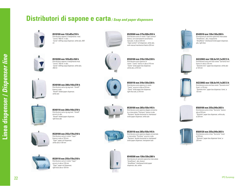 Linea dispenser / Dispenser line Distributori di sapone e carta / Soap and paper dispensers 8510100 mm 132x85x210 h 8520500 mm 275x300x355 h 8540510 mm 130x130x280 h Distributore sapone a riempimento mod. “Levita” 900 ml. in abs “Levita” refilling soap dispenser, white abs, 900 ml. Distributore carta in rotolo “Capri control” bianco, con avanzamento automatico manuale, in abs ø 220 mm “Capri control” roll dispenser, white abs, with manual mechanical feed ø 220 mm Distributore di salviette igieniche intercalate “Amalfitano”, abs, trasparente “Amalfitano” interleaved toilet paper dispenser, abs, light blue 8510200 mm 109x82x160 h 8550100 mm 310x130x330 h AG32002 mm 138,6x141,1x287,5 h Distributore sapone a riempimento mod. “Levita” 350 ml. in abs “Levita” refilling soap dispenser, white abs, 350 ml. Distributore carta igienica in rotolo “ Cantù” bianco in abs ø 310 mm “Cantù” toilet paper box dispenser, white abs, ø 310 mm Distributore carta mini box rotolo “Sorrento mini” bianco in abs ø 125 mm “Sorrento mini” paper box dispenser, white abs ø 125 mm 8550110 mm 310x130x330 h AG33002 mm 138,6x141,1x287,5 h Distributore carta igienica in rotolo “Cantù” azzurro in abs ø 310 mm “Cantù” toilet paper box dispenser, light blue abs, ø 310 mm Distributore carta mni box rotolo “Sorrento mini” fume’, ø 125 mm “Sorrento mini” paper box dispenser, fume’, ø 125 mm 8540100 mm 280x140x370 h Distributore carta zig zag mod. “Amalfi” bianco in abs “Amalfi” folded paper dispenser, white abs 8540110 mm 280x140x370 h Distributore carta zig zag mod. “Amalfi” azzurro in abs “Amalfi” folded paper dispenser, light blue abs 8520100 mm 255x170x210 h Distributore carta in rotolo “Capri” bianco in abs ø 130 mm “Capri” paper roll dispenser, white abs ø 130 mm 8520110 mm 255x170x210 h Distributore carta in rotolo “Capri” azzurro in abs ø 130 mm “Capri” paper roll dispenser, light blue abs ø 130 mm 22 8530100 mm 285x150x145 h 8560100 mm 255x240x365 h Distributore carta igienica doppio orizzontale o intercalata “Positano” bianco in abs “Positano” double horizontal or interleaved toilet paper dispenser, white abs Distributore carta in box “Sorrento” bianco abs ø 220 mm “Sorrento” paper box dispenser, white abs, ø 220 mm 8530110 mm 285x150x145 h 8560120 mm 255x240x365 h Distributore carta igienica doppio orizzontale o intercalata “Positano” azzurro in abs “Positano” double horizontal or interleaved toilet paper dispenser, transparent abs Distributore carta in box “Sorrento” fume’ ø 220 mm “Sorrento” paper box dispenser fume’, ø 220 mm 8540500 mm 130x130x280 h Distributore di salviette igieniche intercalate “Amalfitano”, abs, bianco “Amalfitano” interleaved toilet paper dispenser, abs, white IPC Euromop Linea dispenser/ Dispenser line Diffusori Air freshener and insecticide dispensers Accessori bagno Bath accessories Portarotoli industriali Industrial paper roll holders AH60002 mm 268,3x134x66 h 8590100 mm 91x108x240 h 8500500 mm 220x60x290 h Porta salviette da viso “Cortese” bianco in abs “Cortese” face napkins dispenser, abs, white Diffusore automatico insetticida e profumo “New matik” “New matik” electronic dispenser air-freshner and insecticide Dispenser igen wc in abs bianco Wc seat cover dispenser, abs, white 8500100 mm 100x90x150 h AKA2002 AM30002 mm 153x63x135 h 7009020.01 mm 410x345x350 h Distributore salviette da tavolo “Hygen bar”, abs, trasparente azzurrato “Hygen bar” napkins dispenser, abs, light blue Deodorante aerosol ml. 250 profumo odor neutralizer Air-freshener refill, ml. 250 odor neutralizer AKA2003 Deodorante aerosol ml. 250 profumo lavanda Air-freshener refill, ml. 250, lavanda scent AKA2004 Deodorante aerosol ml. 250 agrumi/pompelmo Air-freshener refill, ml. 250 citruses/grapefruit scent Distributore sacchetti igienici “Igen bags” per assorbenti “Igen bags” sanitary towel bag dispenser ricarica / refill: AM30150 sacchetti di carta zig zag in conf. da 1000 pz. (n. 25 sacchetti x 40) 25 bags, “z” folded x 40 packages = 1000 bags Portarotolo “Security” a muro e da tavolo certificato h.a.c.c.p. ø 310 mm in abs “Security” wall and standing paper holder, certificated h.a.c.c.p. ø 310 mm, abs 8500100.06 mm 100x90x150 h AZINS02 7151900 mm 112x120x385 h Distributore salviette da tavolo “Hygen bar”, abs, grigio 428 c “Hygen bar” napkins dispenser, abs, grey 428 c Insetticida aerosol ml. 250, 7% piretro Insecticide refill, ml. 250, 7% piretro Porta scopino “Gironet” terra & parete, bianco in polipropilene “Gironet” wc brush, on floor and on wall, polypropylene, white ricarica / refill: 8940010 igen wc / package 2000pcs (nr.200x10) 8500100.05 BLUE 296 C 8500100.02 RED 188 C 8500100.03 GREEN 3165 C 7009010.0101 mm 294x210x170 h Portarotolo a muro “Capri combi roll” in abs con aggancio coda di rondine e kit di fissaggio ø 170 mm “Capri combi roll” abs wall paper holder complete with dovetail joint and fixing kit ø 170 mm Asciugamani ad aria e asciugacapelli - Air hand dryers and hair dryers 8770100 mm 283x225x222 h 8570100 mm 283x225x222 h 8580100 mm 100x110x220 h Asciugamani “Arial” inox con fotocellula w 2300 “Arial” hand dryer with photo cell, stailess steel, w 2300 Asciugamani “Arial” acciaio laccato bianco con fotocellula w 2300 “Arial” hand dryer with photo cell, lacquered steel, white, w 2300 Asciugacapelli “Capriccio” con supporto a muro in abs w 1200 “Capriccio” hair dryer with wall support, white abs, w 1200 6800002 mm 400x275x220 h Portacarta “Parete” in metallo verniciato bianco ”Wall” paper holder, metal, white varnished IPC Euromop 8770110 mm 283x225x222 h 8570110 mm 283x225x222 h AB50002 mm 180x110x550 h Asciugamani “Arial” inox con pulsante w 2300 “Arial” hand dryer with push button, stainless steel, w 2300 Asciugamani “Arial