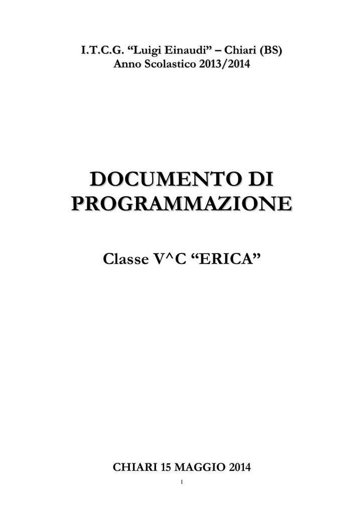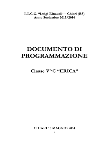 I.T.C.G. “Luigi Einaudi” – Chiari (BS) Anno Scolastico 2013/2014 DOCUMENTO DI PROGRAMMAZIONE Classe V^C “ERICA” CHIARI 15 MAGGIO 2014 1 INDICE DEL DOCUMENTO DEL 15 MAGGIO DELLA CLASSE 5C ERICA Composizione del Consiglio di Classe p. 2 PARTE PRIMA: profilo professionale previsto dall’indirizzo di studi E.R.I.C.A. p. 3 PARTE SECONDA: profilo della classe - presentazione della classe: composizione storia e profilo - obiettivi trasversali p. 4 p. 5 - simulazioni delle prove d’esame p. 5 - commissari interni p. 5 - area progetto p. 5 PARTE TERZA: programmazione disciplinare - Lingua e Letteratura Italiana p. 6 - Storia p. 8 - Matematica Applicata P. 9 - ELEA - Elementi di Legislazione ed Economia per l’Azienda p. 10 - Inglese p. 12 - Tedesco p. 15 - Spagnolo p. 16 - Storia dell’Arte p. 18 - Geografia Generale ed Antropica p. 20 - Educazione Fisica p. 20 - Religione p. 22 PARTE QUARTA: attività curricolari, extracurricolari ed integrative p. 23 PARTE QUINTA: la valutazione P. 24 PARTE SESTA: considerazioni finali del Consiglio di Classe p. 25 Allegati - Allegato 1: Prima Simulazione Terza Prova 12-03-2014 - Allegato 2: Seconda Simulazione Terza Prova 06-05-2014 2 COMPOSIZIONE DEL CONSIGLIO DELLA CLASSE 5C ERICA A.S. 2013-2014 DISCIPLINA INSEGNANTE Lingua e Letteratura Italiana prof. Zamboni Vittoria Storia prof. Zamboni Vittoria Inglese prof. Vertua Cristina Tedesco prof. Masseroni Roberto Spagnolo prof. Baroni Fulvia Conversazione Tedesca prof. Hageneder Sonja Conversazione Spagnola prof. Cukjati Angela Matematica Applicata prof. Calabria Silvana ELEA prof. Begni Silvano Geografia Generale ed Antropica prof. Piemontese Aldo Storia dell’Arte prof. Mega Ciro Educazione Fisica prof. Renda Silvana Religione prof. Amighetti Giovanni Coordinatore: prof.ssa Cristina Vertua 3 PARTE PRIMA Profilo professionale previsto dall’indirizzo di studi E.R.I.C.A. (Educazione alla Relazione Interculturale nella comunicazione Aziendale) Il diplomato del progetto E.R.I.C.A., oltre a possedere conoscenze globali dei processi che caratterizzano l’azienda dal punto di vista economico, giuridico e organizzativo, possiederà una solida cultura generale, competenza linguistica comunicativa e capacità logiche. Sarà inoltre in grado di stabilire e mantenere rapporti tra l’azienda e l’ambiente in cui opera svolgendo funzioni connesse alla comunicazione d’impresa rivolta verso l’esterno. CONOSCENZE · Solida cultura generale accompagnata da capacità linguistico-comunicative e logico-interpretative; · conoscenze globali del sistema azienda e dei processi che caratterizzano la gestione aziendale nell’aspetto economico, giuridico ed organizzativo; · conoscenza dei rapporti che intercorrono fra azienda e l’ambiente esterno, sia nazionale che estero, per gestire gli aspetti della comunicazione e produrre atti comunicativi; · conoscenza della cultura e degli assetti istituzionali delle nazioni straniere di cui usa la lingua; · conoscenza del patrimonio artistico e ambientale per organizzare attività connesse con il turismo. COMPETENZE Il dilpomato E.R.I.C.A. sa: · comunicare, utilizzando i linguaggi settoriali, nelle lingue straniere studiate, oltre che in lingua italiana, sia dal punto di vista ricettivo che da quello produttivo; · organizzare e gestire gli aspetti della comunicazione relativi alla lettura dell’ambiente e dell’opera d’arte inquadrati nel loro contesto storico-culturale; · elaborare dati e rappresentarli, utilizzando strumenti informatici; · affrontare e risolvere problematiche aziendali, sia in ambito giuridico che economico. CAPACITA’ Il diplomato del corso E.R.I.C.A è in grado di: · documentare con precisione il proprio lavoro; · tradurre e redigere la corrispondenza commerciale; · tenere relazioni esterne di vario livello con enti, aziende, sia nazionali che estere; · analizzare testi e fonti di informazione economica italiani e stranieri; · organizzare attività connesse con il turismo; · effettuare scelte e prendere decisioni ricercando ed assumendo le opportune informazioni; · partecipare al lavoro organizzativo, individualmente o in gruppo, accettando ed esercitando il coordinamento. 4 PARTE SECONDA Profilo della classe PRESENTAZIONE DELLA CLASSE: COMPOSIZIONE, STORIA E PROFILO La classe è composta da 19 alunni, di cui 5 maschi e 14 femmine, tutti provenienti da Chiari e paesi limitrofi. L’attuale classe è frutto di un'evoluzione cha a partire dal primo anno di corso ha visto il mutarsi della propria composizione per via di alcuni abbandoni, bocciature e per l'acquisizione di nuovi studenti provenienti da altre classi. Il nocciolo grosso della classe è comunque rimasto lo stesso e quindi rappresenta la maggioranza numerica. Infatti nell'arco del quinquennio la classe non ha sostanzialmente modificato la propria identità e fisionomia. Per quanto riguarda l’aspetto della continuità didattica, va segnalato che per alcune discipline questa è stata garantita per cinque anni consecutivi (Inglese, Tedesco, Educazione Fisica); in altri casi è stata assicurata per tre anni (Italiano, Storia, E.L.E.A., Geografia); in altri ancora invece gli studenti hanno visto l'alternarsi di docenti diversi per ogni anno del triennio (Spagnolo, Matematica e Storia dell'Arte). La maggior parte degli alunni ha avuto un percorso di studi regolare. La classe ha mediamente mantenuto un impegno abbastanza continuo, anche se una maggiore tenacia da parte di alcuni avrebbe potuto produrre, in generale, risultati migliori. L’interesse mostrato per il percorso di studi seguito è stato buono; altrettanto dicasi per l’attenzione e la disponibilità nei confronti delle attività extracurricolari, soprattutto da parte di alcuni studenti. Durante il triennio i risultati ottenuti sono stati i seguenti: · nel terzo anno, la classe era composta da 24 alunni di cui: - 12 sono stati promossi a pieni voti; - 8 sono stati promossi con debito in almeno una materia; - 4 no