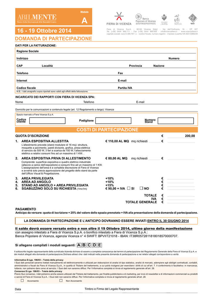 Modulo A 006/2013 HNTG13E 16 - 19 Ottobre 2014 Fiera di Vicenza S.p.A. - 36100 Vicenza [Italy] - Via dell’Oreficeria, 16 - CP 327 Tel. [+39] 0444 969.111 - Fax [+39] 0444 969.000 - [email protected] - www.vicenzafiera.it capitale sociale: euro 6.489.767 i.v. - codice fiscale, numero registro - imprese e partita IVA 00515900249 DOMANDA DI PARTECIPAZIONE DATI PER LA FATTURAZIONE: Ragione Sociale Indirizzo Numero CAP Località ProvinciaNazione TelefonoFax InternetE-mail Codice fiscale Partita IVA N.B.: I dati anagrafici sopra riportati sono validi agli effetti della fatturazione. INCARICATO DEI RAPPORTI CON FIERA DI VICENZA SPA: Nome Telefono E-mail Domicilio per le comunicazioni a contenuto legale (art. 12 Regolamento a tergo): Vicenza Spazio riservato a Fiera Vicenza S.p.A. Codice cliente Numero Stand Padiglione COSTI DI PARTECIPAZIONE QUOTA D’ISCRIZIONE € 1. AREA ESPOSITIVA ALLESTITA € 110,00 AL MQ mq richiesti € 2. AREA ESPOSITIVA PRIVA DI ALLESTIMENTO € 80,00 AL MQ mq richiesti € 3. 4. 5. 6. AREA PRIVILEGIATA AREA AD ANGOLO STAND AD ANGOLO + AREA PRIVILEGIATA SGABUZZINO SOLO SU RICHIESTA (1mx1m) +10% +10% +15% € 90,00 + IVA SI NO € € € € L’allestimento prevede (stand modulare di 16 mq): struttura, moquette a pavimento, pareti divisorie, grafica, presa elettrica di servizio da 500 W, 3 fari a scarica da 150 W, l’allacciamento elettrico e relativi consumi fino ad un massimo di 1 KW. . Comprende: superficie espositiva e quadro elettrico industriale (allaccio a carico dell’espositore) e consumi fino ad un massimo di 1 KW. L’assegnazione dell’area è a completa discrezione di Fiera di Vicenza e avverrà solo previa approvazione del progetto dello stand da parte dell’Ufficio Visual & Progettazione. TOTALE IVA TOTALE GENERALE 200,00 € € € PAGAMENTO Anticipo da versare: quota di iscrizione + 25% del valore dello spazio prenotato + IVA alla presentazione della domanda di partecipazione. LA DOMANDA DI PARTECIPAZIONE E L’ANTICIPO DOVRANNO ESSERE INVIATI ENTRO IL 30 GIUGNO 2014 Il saldo dovrà essere versato entro e non oltre il 19 Ottobre 2014, ultimo giorno della manifestazione con assegno intestato a Fiera di Vicenza S.p.A. o bonifico intestato a Fiera di Vicenza S.p.A.: Banca Popolare di Vicenza, agenzia Vicenza n° 4 SWIFT: BPVIIT21018 - IBAN: IT38R0572811818018570000707. Si allegano compilati i moduli seguenti: A B C D E Il sottoscritto legale rappresentante della suindicata Azienda dichiara di essere a completa conoscenza dei termini di partecipazione del Regolamento Generale della Fiera di Vicenza S.p.A. e dei moduli allegati alla domanda di partecipazione.Dichiara altresì che i dati indicati nella presente domanda di partecipazione e nei relativi allegati corrispondono a verità. Informativa D.Lgs. 196/03 – Tutela della privacy I Suoi dati personali saranno trattati manualmente ed elettronicamente e utilizzati per elaborazioni di analisi di tipo statistico, analisi di mercato, adempiere agli obblighi contrattuali, contabili, amministrativi e fiscali da Fiera di Vicenza S.p.A., in qualità di Titolare del trattamento, a cui potrà rivolgersi per esercitare i diritti di cui all’art. 7. Il conferimento è facoltativo: in mancanza, tuttavia, non potremo dare corso al servizio. I Suoi dati non saranno diffusi. Per l’informativa completa si rinvia al regolamento generale all’art. 28. Consenso D.Lgs. 196/03 – Tutela della privacy Previo Suo consenso, i dati potranno anche essere utilizzati dal Titolare del trattamento, per finalità pubblicitarie e di marketing, per invio di newsletter e di informazioni commerciali su prodotti e servizi di Fiera di Vicenza S.p.A.. I Suoi dati non saranno diffusi. Per l’informativa completa si rinvia al regolamento generale all’art. 28. Data Acconsento Non Acconsento Timbro e Firma del Legale Rappresentante Abilmente - TERMINI DI PARTECIPAZIONE Denominazione La denominazione ufficiale della manifestazione è ABILMENTE, Mostra-Atelier Internazionale della Manualità Creativa Date e orari della manifestazione Giovedì 16 ottobre 2014 Venerdì 17 Ottobre 2014 Sabato 18 Ottobre 2014 Domenica 19 Ottobre 2014 9:30 - 19:00 9:30 - 19:00 9:30 - 19:00 9:30 - 19:00 Orario di apertura agli espositori Nei giorni di manifestazione gli espositori avranno diritto ad entrare un’ora prima del pubblico e potranno rimanere nei padiglioni fino a mezz’ora dopo la chiusura per il pubblico. Organizzatore Fiera di Vicenza S.p.A. Viale della Oreficeria, 16 36100 Vicenza Tel. 0444 969111 - Fax 0444 969000 - [email protected]. T1 - Domanda di partecipazione La domanda di partecipazione dovrà essere debitamente compilata, completa in ogni sua parte e firmata dal Legale Rappresentante con l’indicazione della data e del timbro della Società. Una volta compilata dovrà essere inviata a Fiera di Vicenza Spa (d’ora in avanti anche “Organizzatore”) nel rispetto dei termini vigenti. Non sarà consentita l’ammissione alla Manifestazione di soggetti che siano debitori a qualsiasi titolo nei confronti dell’Organizzatore. I termini di presentazione della domanda sono: Lunedì 30 Giugno 2014 La Ditta che, per comprovata impossibilità non fosse in grado d’intervenire all’Esposizione, può chiedere agli Organizzatori lo scioglimento dell’impegno assunto inoltrando richiesta scritta a mezzo raccomandata A.R., che dovrà pervenire entro il perentorio termine del 31 Luglio 2014. In questo caso viene rimborsato, detratte le imposte e l’importo per l’iscrizione, il 50% dell’acconto versato. Se la rinuncia perviene agli organizzatori dopo tale termine, il canone di partecipazione è dovuto per intero dall’Espositore, e gli Organizzatori hanno la facoltà di procedere all’assegnazione dello spazio espositivo ad altra Ditta. Anche in caso di rinuncia parziale del posteggio assegnato, l’Espositore è tenuto al versamento dell’importo totale del canone di partecipazione qualora la parte di posteggio rinunciata non poss