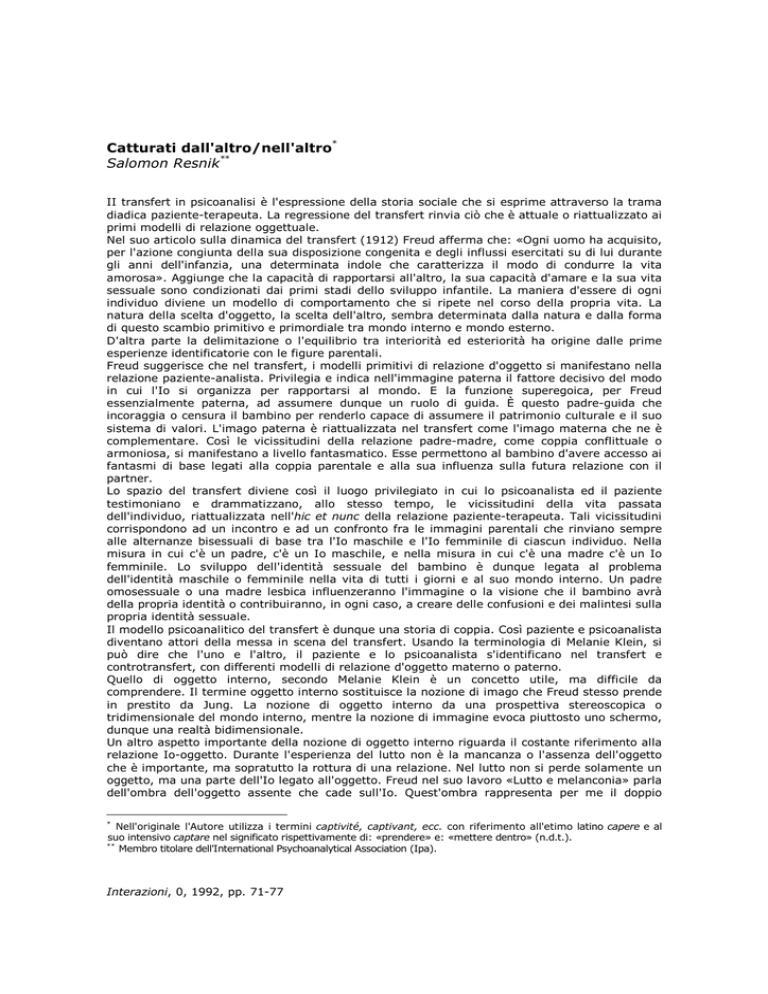 Catturati dall'altro/nell'altro* Salomon Resnik** II transfert in psicoanalisi è l'espressione della storia sociale che si esprime attraverso la trama diadica paziente-terapeuta. La regressione del transfert rinvia ciò che è attuale o riattualizzato ai primi modelli di relazione oggettuale. Nel suo articolo sulla dinamica del transfert (1912) Freud afferma che: «Ogni uomo ha acquisito, per l'azione congiunta della sua disposizione congenita e degli influssi esercitati su di lui durante gli anni dell'infanzia, una determinata indole che caratterizza il modo di condurre la vita amorosa». Aggiunge che la capacità di rapportarsi all'altro, la sua capacità d'amare e la sua vita sessuale sono condizionati dai primi stadi dello sviluppo infantile. La maniera d'essere di ogni individuo diviene un modello di comportamento che si ripete nel corso della propria vita. La natura della scelta d'oggetto, la scelta dell'altro, sembra determinata dalla natura e dalla forma di questo scambio primitivo e primordiale tra mondo interno e mondo esterno. D'altra parte la delimitazione o l'equilibrio tra interiorità ed esteriorità ha origine dalle prime esperienze identificatorie con le figure parentali. Freud suggerisce che nel transfert, i modelli primitivi di relazione d'oggetto si manifestano nella relazione paziente-analista. Privilegia e indica nell'immagine paterna il fattore decisivo del modo in cui l'Io si organizza per rapportarsi al mondo. E la funzione superegoica, per Freud essenzialmente paterna, ad assumere dunque un ruolo di guida. È questo padre-guida che incoraggia o censura il bambino per renderlo capace di assumere il patrimonio culturale e il suo sistema di valori. L'imago paterna è riattualizzata nel transfert come l'imago materna che ne è complementare. Così le vicissitudini della relazione padre-madre, come coppia conflittuale o armoniosa, si manifestano a livello fantasmatico. Esse permettono al bambino d'avere accesso ai fantasmi di base legati alla coppia parentale e alla sua influenza sulla futura relazione con il partner. Lo spazio del transfert diviene così il luogo privilegiato in cui lo psicoanalista ed il paziente testimoniano e drammatizzano, allo stesso tempo, le vicissitudini della vita passata dell'individuo, riattualizzata nell'hic et nunc della relazione paziente-terapeuta. Tali vicissitudini corrispondono ad un incontro e ad un confronto fra le immagini parentali che rinviano sempre alle alternanze bisessuali di base tra l'Io maschile e l'Io femminile di ciascun individuo. Nella misura in cui c'è un padre, c'è un Io maschile, e nella misura in cui c'è una madre c'è un Io femminile. Lo sviluppo dell'identità sessuale del bambino è dunque legata al problema dell'identità maschile o femminile nella vita di tutti i giorni e al suo mondo interno. Un padre omosessuale o una madre lesbica influenzeranno l'immagine o la visione che il bambino avrà della propria identità o contribuiranno, in ogni caso, a creare delle confusioni e dei malintesi sulla propria identità sessuale. Il modello psicoanalitico del transfert è dunque una storia di coppia. Così paziente e psicoanalista diventano attori della messa in scena del transfert. Usando la terminologia di Melanie Klein, si può dire che l'uno e l'altro, il paziente e lo psicoanalista s'identificano nel transfert e controtransfert, con differenti modelli di relazione d'oggetto materno o paterno. Quello di oggetto interno, secondo Melanie Klein è un concetto utile, ma difficile da comprendere. Il termine oggetto interno sostituisce la nozione di imago che Freud stesso prende in prestito da Jung. La nozione di oggetto interno da una prospettiva stereoscopica o tridimensionale del mondo interno, mentre la nozione di immagine evoca piuttosto uno schermo, dunque una realtà bidimensionale. Un altro aspetto importante della nozione di oggetto interno riguarda il costante riferimento alla relazione Io-oggetto. Durante l'esperienza del lutto non è la mancanza o l'assenza dell'oggetto che è importante, ma sopratutto la rottura di una relazione. Nel lutto non si perde solamente un oggetto, ma una parte dell'Io legato all'oggetto. Freud nel suo lavoro «Lutto e melanconia» parla dell'ombra dell'oggetto assente che cade sull'Io. Quest'ombra rappresenta per me il doppio * Nell'originale l'Autore utilizza i termini captivité, captivant, ecc. con riferimento all'etimo latino capere e al suo intensivo captare nel significato rispettivamente di: «prendere» e: «mettere dentro» (n.d.t.). ** Membro titolare dell'International Psychoanalytical Association (Ipa). Interazioni, 0, 1992, pp. 71-77 speculare dell'oggetto che prova a ritrovare la sua sostanzialità e la sua forma nello spazio mentale del soggetto. La prima relazione d'oggetto è legata certamente alla madre. Ogni soggetto, uomo o donna, abita inizialmente nel ventre materno: il suo primo habitat. Il trauma della nascita è in effetti un problema di divorzio per la coppia madre-bambino. La nascita è già una perdita d'oggetto, un'esperienza depressiva primordiale, un lutto originario. Il modello di relazione di coppia madre-feto è simbiotico. La madre ha bisogno del bebé che nasce per apprendere il suo ruolo e la sua identità di madre. Biologicamente il feto dipende completamente dalla madre. Per il bambino nascere significa, tra l'altro, perdere la funzione contenitiva della madre e la funzione respiratoria «anfibia» intrauterina. Come Ferenczi lo definisce nel suo libro Thalassa, il bambino deve abbandonare il suo «aquarium» e utilizzare i suoi polmoni. Egli deve dunque essere aiutato a separarsi o a divorziare dal suo stato di «pesce» per divenire un essere aerobico. La prima introiezione non è il latte della madre, ma l'introiezione dell'aria (introiezione respiratoria). Se il bebé si rifiuta di negoziare il divorzio o se le condizioni materne, paterne o ambientali non sono adeguate, il bambino può morire: dire di no od opporsi al cambiamento d