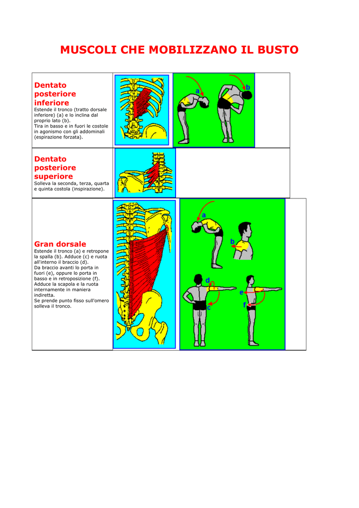 MUSCOLI CHE MOBILIZZANO IL BUSTO Dentato posteriore inferiore Estende il tronco (tratto dorsale inferiore) (a) e lo inclina dal proprio lato (b). Tira in basso e in fuori le costole in agonismo con gli addominali (espirazione forzata). Dentato posteriore superiore Solleva la seconda, terza, quarta e quinta costola (inspirazione). Gran dorsale Estende il tronco (a) e retropone la spalla (b). Adduce (c) e ruota all'interno il braccio (d). Da braccio avanti lo porta in fuori (e), oppure lo porta in basso e in retroposizione (f). Adduce la scapola e la ruota internamente in maniera indiretta. Se prende punto fisso sull'omero solleva il tronco. Ileocostale Estende il busto (a) e lo inclina dal suo lato (b). Abbassa le costole (espirazione). Insieme al Lunghissimo del dorso forma il Sacrospinale. Interspinali Estendono il busto. Intertrasversari Estendono il busto (a) e lo inclinano dal loro lato (b). Lunghissimo del capo e del collo Estendono il capo e il collo (a) e li inclinano (b) dal proprio lato. Lunghissimo del dorso Estende il tronco (a) e lo inclina dal suo lato (b). Insieme all'Ileocostale forma il Sacrospinale. Multifidi Estendono il busto (a) e lo ruotano dal lato opposto (b). Obliquo esterno (o Grande obliquo) Flette (a), inclina dal proprio lato (b) e ruota il tronco (c). Abbassa le costole e agisce come espiratore. Obliquo interno (o Piccolo obliquo) Flette (a), inclina dal proprio lato (b) e ruota il tronco (c). Abbassa le costole e agisce come espiratore. Psoas iliaco Flette la coscia sul bacino (a) e viceversa, la adduce (b) e la ruota all'esterno (c). Inclina lateralmente il tronco (d). Con le cosce estese accentua la curva lombare (lordosi). Quadrato dei lombi Estende (a) e inclina il tronco dal proprio lato (regione lombare) (b). Abbassa la dodicesima costola. Retto dell’addome Flette il tronco (a) e lo inclina dal proprio lato (b). Abbassa le costole (espiratore). Sacrospinale (o Massa comune) Si suddivide in: - Lunghissimo del dorso; - Lunghissimo del collo; - Lunghissimo del capo; - Ileocostale dei lombi; - Ileocostale del dorso; - Ileocostale del collo. Estende il busto (a) e lo inclina dal suo lato (b). Estende il capo e il collo (c) e li inclina (d) dal proprio lato. Scaleni Si suddividono in: - Scaleno anteriore; - Scaleno medio; - Scaleno posteriore. Lo scaleno anteriore e medio inclinano il collo in avanti (a) e lateralmente (b). Sollevano la prima e seconda costola (inspiratori). Lo scaleno posteriore inclina il collo lateralmente (b). Semispinali Si suddividono in: - Semispinali del collo; - Semispinali del capo. Estendono il dorso e il collo (a) e li inclinano dal loro lato (b). Estendono il capo e il collo (c) e li inclinano (d) dal proprio lato. Spinali Si suddividono in: - Spinali del dorso; - Spinali del collo; - Spinali del capo. Estendono il busto (a) e lo inclinano proprio lato (b). Estendono il capo e il collo (c), li inclinano (d) dal proprio lato. Splenio Si suddivide in: - Splenio del collo; - Splenio del capo. Estendono il capo e il collo (a) e li inclinano dal proprio lato (b). Lo splenio del capo lo ruota dal proprio lato (c). Trapezio Abbassa (fasci inferiori) (a), solleva (fasci superiori) (b) e retropone (fasci medi) la spalla (c). Insieme al Gran dentato consente, ruotando la scapola, di elevare il braccio in alto sul piano frontale (da 90° a 150°) (d) e su quello sagittale (da 60° a 120°) (e). Prendendo punto fisso sulla scapola estende il capo (f) e lo inclina dal proprio lato (g). Innalza le costole (inspiratore). Trasverso Ruota il tronco e abbassa le costole (espiratore). Interviene particolarmente nella espirazione forzata.