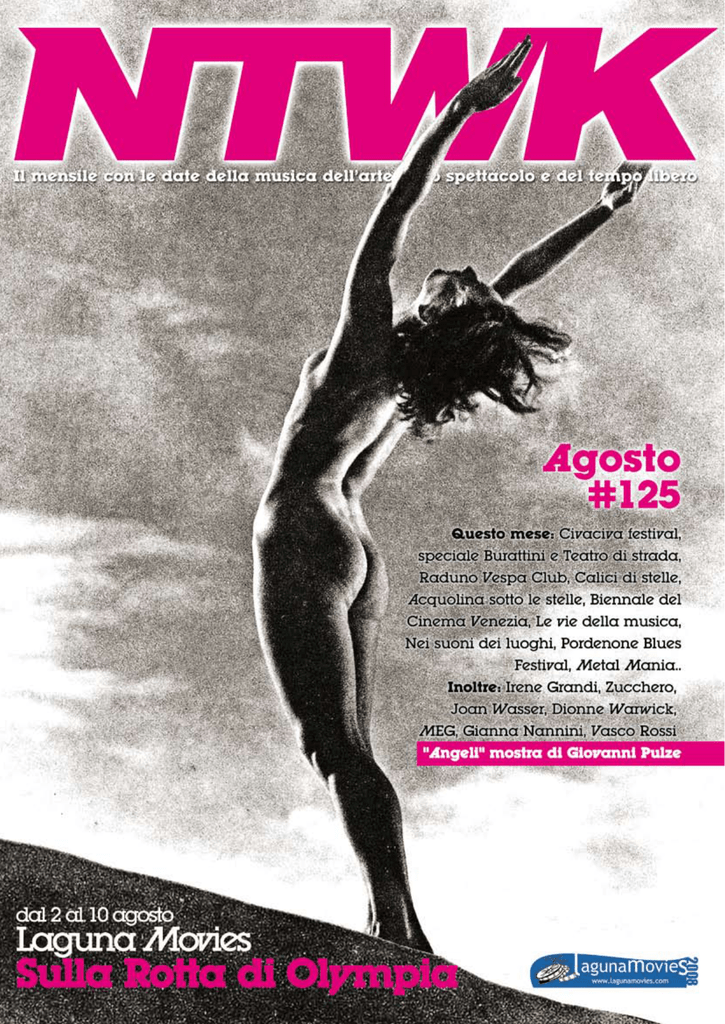 2 Agosto 2008 / Network Caffè n. 125 / Anno XII / TEL. 040370005/ Aut. Trib. TS n. 980 del 9/4/1998 NTWK Aut. Trib. TS 1028 del 22/06/2001 - DIFFUSIONE GRATUITA - Spedizione in A.P. - 70% DC TS FREE PRESS A Trieste IN VIA ROMAGNA 6 A LATO DI PIAZZA DALMAZIA L’Arte di Dio S C I E N Z A , A RT E , B E L L E Z Z A E C U LT U R A S I F O N D O N O I N U N A R E A LTÀ I N S U P E R A B I L E “La scoperta del Commendatore Primo Rovis viene esaltata in questa immagine sbalorditiva. Si noti la quasi perfetta corrispondenza tra l’occhio umano e l’occhio minerale. E pensare che, in questo caso la differenza tra i due occhi è di circa 130 milioni di anni.” Sezioni di geodi di agata dai colori e forme inimmaginabili e di misure eccezionali. Veri e propri quadri di Dio. (Cretacico, 130 milioni di anni, Brasile) ALCUNI AUTOREVOLI GIUDIZI “Non credevo ci fosse a Trieste questa meraviglia. Non ho visto in giro per il mondo qualcosa di simile, e mi rendo conto che l’arte copia questi prodigi della natura”. Cristalli di quarzo ialino o di rocca di tutte le dimensioni e di varie provenienze. “È una vera galleria d’arte dove espone l’insuperabile artista: la Grande Scultrice. Grazie per le emozioni!” Tronchi di albero fossilizzati di cui uno della foresta pietrificata dell’Arizona, dal peso di 4.600 kg. (Triassico, 220 milioni di anni, USA) “Al mio amico Primo Rovis, il primo - ch’io sappia - a percepire l’arte e la scienza di Dio, nella sua creazione pressoché sconosciuta. Grazie, Primo, di averci aperto un varco! Alghe stromatoliti (prime forme di vita sorte sul nostro pianeta) di vario colore e dimensioni provenienti da vari paesi del mondo. (Precambriano, da 1 a 3,5 miliardi di anni). La più completa ed unica collezione di minerali e fossili Enzo Biagi Piero Angela Sergio Zavoli È un grande miracolo! La collezione raccolta da Primo Rovis richiede una particolare interpretazione. È un nuovo punto di vista sull’origine dell’Universo. È un nuovo sguardo sull’Arte e sul Bello. Quello che vediamo nella pietra tocca profondamente la nostra anima ed il nostro cuore. Probabilmente è la futura percezione della Bellezza. Senz’altro un giorno troveremo la collezione in un museo, dove sarà visitata da milioni di persone. Grazie al Suo ideatore - Primo Rovis Victor Sadovnichiy Rettore Magnifico dell’Università Lomonosov di Mosca Per ricorrenze come ad esempio nozze, anniversari, lauree, diplomi o trofei sportivi, ci sono più di 30.000 oggetti da scegliere. Un regalo di classe che denota arte, bellezza e cultura IPANEMA ROVIS di Primo Rovis S.a.s. 34134 Trieste (Italia) - Via Romagna, 6 - Tel. 040 362106 - Fax 040 767027 Sede sociale: 34122 Trieste - Piazza San Giovanni, 3 - Tel. 040 364429 - Fax 040 364395 w w w . i p a n e m a r ov i s . co m - i n f o @ i p a n e m a r ov i s . co m Copertina Da pagina 4 Laguna Movies Teatro Da pagina 6 Burattini senza confini/Puppet Festival/Pupi&Pini/Che figura!!! L’Arlecchino Errante/Omissis 8 In copertina: Laguna Movies Artwork: Sergio Zennaro Arte Da pagina 10 Tel. 040370005 www.ntwk.it [email protected] [email protected] Direttore Editoriale Fabio Fieramosca Direttore responsabile Marco Cernaz Redazione di Trieste Coordinatrice testi Laura Moretuzzo Set grafico e impaginazione Sergio Zennaro Hanno collaborato Cristiano Pellizzaro, Mitti Cavallar, Roberto Vidali, Electrosacher, Elisa Marzi, Andrea Rodriguez, Corrado Premuda, Cinematic, Bostjan Romano, Alberto Zamattio, Matteo Caenazzo, Lorenzo De Vecchi. Tutti gli uffici stampa e agenzie grafiche di competenza, che ringraziamo come sempre di cuore. Direttore creativo Fabio Fieramosca Stampa Tipografia Villaggio del Fanciullo - Trieste Distribuzione in esclusiva Matras srl - Logistica & trasporti Registro periodici autorizzazione Tribunale di Trieste n. 980 del 9/4/1998 e n. 1028 del 22/6/2001 Alcune immagini e testi riprodotti sono usati a scopo informativo e divulgativo e mantengono il © dei rispettivi detentori. La responsabilità su giudizi ed opinioni espressi negli articoli è esclusivamente di chi li ha firmati o siglati e non necessariamente della direzione o della proprietà editrice. Le date dei concerti possono subire variazioni o errori di stampa: decliniamo ogni responabilità ed invitiamo ad usare le info disponibili. È vietata la riproduzione anche parziale dei testi o delle immagini senza espressa autorizzazione della casa editrice. Questo numero è stato chiuso per la stampa il 25 luglio 2008. Distribuzione gratuita Spot art: Elio Germani, Manifesti d’artista, Soft Cell, Andrea Giovanni Pulze Rauch, Giovanni Frangi Zapping Da pagina 14 Raduno Vespa Club Calici di Stelle Acquolina sotto le stelle Folklore in Villa Scimmie in Gabbia Schermi Da pagina 16 Biennale del Cinema Filmmakers al Chiostro Cappella Underground numero 125 agosto 2008 Musica Da pagina 18 Le Vie della Musica Nei suoni dei luoghi Pordenone Blues Festival Metal Mania Concerti del mese News dalla Slovenia Visti per voi Helpiscoming Cantera Social Club Sachernews / Trenchtown Sistema Network Caffè Da pagina 29 Le date del nord Italia e del Friuli Venezia Giulia al 100%. Le date possono variare o essere annullate, quindi consultate le info. 4 Copertina NTWK agosto 2008 Evento Laguna Movies Duecentodiciassette minuti interamente dedicati, per la prima volta nella storia del cinema, ai Giochi Olimpici: alla statuarietà dei corpi, alla tensione agonistica degli atleti in gara, alle immense folle di spettatori assiepati negli stadi e sui luoghi di competizione. “Olympia”, di Leni Riefenstahl, monumentale pellicola del 1936 dedicata alle Olimpiadi di Berlino, è un film tuttora discusso e controverso per la sua natura propagandistica legata all’ascesa nazista, ma resta un prezioso caposaldo della filmografia fiorita intorno allo sport, per il vivissimo senso estetico delle riprese e della fotografia, per la perizia nel montaggio - durato due anni su un immenso girato - per l’innovat