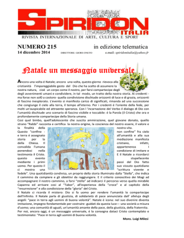NUMERO 215 14 dicembre 2014 in edizione telematica DIRETTORE: GIORS ONETO e.mail: [email protected] Natale un messaggio universale Ancora una volta é Natale; ancora una volta, questo giorno rievoca alla cristianità l'impareggiabile gesto del Dio che ha scelto di assumere la nostra natura, cioè un corpo come il nostro, per farsi compartecipe degli degli avvenimenti umani e condividere, in tal modo, un tratto della nostra storia. Ai credenti ma forse non sol0 a costoro- quella condivisione dischiude orizzonti di luce e di grazia, orizzonti di fascino inesplorato. L'evento si manifesta carico di significati, rimanda ad una successione che congiunge il cielo alla terra, il tempo all'eterno. Per i credenti é l'oriente della fede, per molti un'auspicabile ed attraente speranza. Con l 'incarnazione del Verbo il dialogo di Dio con l’umanità dischiude uno scenario di fascino visibile e toccabile: é la Parola (il Cristo) che ora e profondamente compartecipe della Storia umana. Cosi quel bimbo, quell'adolescente che suscita ammirazione, quel giovane donato, quello strano “Rabbi” racconta e certifica la nostra origine, la coscienza del nostro essere, il valore e la finalità della nostra vita. Questo “confine non confine” fra cielo e terra é assegnato all'umanità e alla sua storia per la mediazione manifesta della Chiesa. Il cristiano, infatti, convalida l'umana appartenenza I ponendosi nella condizione di imitare e testimonia il Cristo. E il Natale a ricordarci questo evento stupefacente mediante i primi passi del Dio fatto uomo. Per questo il suo vissuto quotidiano ci mostra una “scrittura vivente e fedele”. Una quotidianità condivisa, un proprio della storia illuminato dalla “Stella”, che indica il cammino da compiere e gli obiettivi da raggiungere. E il criterio conoscitivo dei Magi ad accompagnare il nostro cammino, a farsi “stella” ad indicarci il percorso verso quella mirabile Capanna ed arrivare cosi al “Tabor”, all'esperienza della “croce” e al capitolo della “resurrezione” e alla condivisione della “gloria” del Cristo. Il Natale ci ricorda il mistero: Dio si fa uomo per rendere l'umanità lo compartecipe dell'Infinito. Il Natale parla di giustizia, di solidarietà di pace annunciata dall' alleluja degli angeli: “pace in terra agli uomini di buona volontà”. Natale é icona: nel suo divenire diventa imitazione, impegno fondamentale per costruire -guidati da questa luce— una società a misura d'uomo; una comunità di uguali, un'umanità amante della pace, della giustizia, della fraternita. Per noi, ancora oggi, é un messaggio universale, é la consegna dataci Cristo contemplato e testimoniato: “Pace in terra agli uomini di buona volontà. Mons. Luigi Milesi SPIRIDON/2 Sentimenti IV, un angelo visto dal poeta Ungaretti Nei giorni scorsi (28 novembre) è venuto a mancare all’età di 94 anni Placidio Sentimenti, noto come Sentimenti IV, che fu portiere immenso, della Nazionale e che militò nelle quadre del Modena, Juventus, Lazio. Lane Rossi, Cenisia ed, anzianissimo, nel Torino. Partite giocate in serie A 366; in serie B 67; in Nazionale 9. Di tutti questi incontri ricordo con particolare piacere quello del 19 settembre 1948 allo Stadio Nazionale di Roma: Lazio 0, Juventus 4. “Cochi” è il portiere dei bianconeri. Un ragazzo di Orvieto, partecipando ad un concorso indetto da una Casa Cinematografica, esprime il desiderio di seguire da vicino le imprese del suo idolo (il giovane ha 14 anni e gioca nelle giovanili dell’Orvietana). Viene accontentato al di là di ogni ottimistica speranza: la RAI lo ospita in una panchina, collocata dietro la porta difesa da Sentimenti, e gli pone accanto, come commentatore di eccezione, Giuseppe Ungaretti. Sentii alla radio questa eccezionale radiocronaca. Ungaretti probabilmente sapeva poco di calcio ma era un Poeta. Descrisse, come mai prima si era udito e come mai dopo si sarebbe sentito, cosa sia un portiere di calcio. Non ricordo, purtroppo, le parole esatte ma ho la reminiscenza di qualcosa di simile: “Posso capire l’entusiasmo di un ragazzo per un uomo che ricorda un arcangelo, che spiegando le braccia come ali salva la intangibilità della sua amata casa…” Fui affascinato e, su suggerimento di mia sorella Bianca Maria che studiava lettere alla Sapienza, andai a sentire una lezione del Vate. Lui era alla cattedra con un basco calcato sulla fronte e leggeva lentamente con voce martellante i Fiumi. Parlava del Serchio (al quale attinsero duemila anni di gente sua campagnola), del Nilo (che lo vide crescere e ardere di inconsapevolezza), della Senna (nel cui torbido si era rimescolato e conosciuto), dell’Isonzo che lo vide combattente volontario (e sul quale, levigato come un suo sasso, se ne andava come un acrobata sull’acqua). E presso il quale un ufficiale, si chiamava Ettore Serra ed era uomo di lettere, anziché punirlo per un mancato saluto, lo scoprì Poeta e lo aiutò a pubblicare il suo primo libro “ Il porto sepolto”. Lo seguivo affascinato quando l’incanto fu rotto dal lancio, sulla sua cattedra, di un giornale arrotolato, indirizzatogli da uno spiritoso studente… Ungaretti alzò lo sguardo solo per un attimo e poi continuò sereno la sua lettura sino a concludere “ora che è notte/ la mia vita mi pare/ una corolla di tenebre”. Concludo segnalando che il ragazzo che ammirava Sentimenti IV detto Cochi si chiamava Giuseppe Carnevali, da grande portiere della sua Orvietana e a venti anni Azzurro di Atletica nel salto in alto ( Italia – Grecia a Bari nel 1954 ). Carnevali, Sentimenti ed Ungaretti Chi s'imbosca in ufficio e chi lavora ripulendo l'immondezza Giuliana Salce, classe 1955, nella Hall of Fame dell'Atletica italiana, è una dei 3000 operatori ecologici che giornalmente operano nella Capitale e nei dintorni. Gli altri 9000 dipendenti dell'AMA, nettezza urbana, lavorano negli uffici. Questi dati emergono nei risvolti delle indagini sui favoritismi e sugl