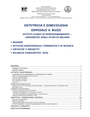 Azienda Ospedaliera Istituti Clinici di Perfezionamento Ospedale dei Bambini V. Buzzi Dipartimento della Donna, Mamma e Neonato Direttore prof. Enrico Ferrazzi Tel. 02 5799 5369 Email: [email protected] - [email protected] Ospedale di rilievo nazionale e di alta specializzazione convenzionato con l’Università degli Studi di Milano OSTETRICIA E GINECOLOGIA GINECOLOGIA OSPEDALE V. BUZZI ISTITUTI CLINICI DI PERFEZIONAMENTO – UNIVERSITA’ DEGLI STUDI STUDI DI MILANO RISORSE ATTIVITÀ ASSISTENZIALE, ASSISTENZIA FORMATIVA E DI RICERCA RICER CRITICITA’ E PROGETTI PROGETT BILANCIO CONSUNTIVO 2010 RISORSE ................................................................................................................................ ................................ .................................................. 2 RISORSE STRUTTURALI ................................................................................................................................ ................................ ..........................................................2 RISORSE UMANE ................................................................................................................................ ................................ .....................................................................3 ATTIVITA’ ASSISTENZIALE ................................................................................................ .................................................. 3 ASSISTENZA ALLA GRAVIDANZA AL TRAVAGLIO E AL PARTO ................................................................ ...................................................4 CORSI DI ACCOMPAGNAMENTO ALLA NASCITA ................................................................................................ ...........................................................4 ATTIVITA’ AMBULATORIALE. ................................................................................................................................ ................................ .........................................................5 ACCETTAZIONE OSTETRICA ................................................................................................................................ ................................ ...........................................................5 SALA TRAVAGLIO E PARTO. ................................................................................................................................ ................................ ...........................................................6 LEGGE 194 ................................................................ ................................................................................................ ................................................................... 8 MEDICINA MATERNO FETALE................................................................................................ ................................ ....................................................... 8 AMBULATORI E DH DI PATOLOGIA DELLA GRAVIDANZA -- DIAGNOSI PRENATALE E CHIRURGIA FETALE ...................................8 RICOVERO E CURA ................................................................................................................................ ................................ .......................................................................10 CHIRURGIA GINECOLOGICA ................................................................................................ ................................ ........................................................ 11 CENTRO DI PATOLOGIA CERVICO VAGINALE ................................................................................................ ...............................................................11 CENTRO DI ECOGRAFIA E ISTEROSCOPIA INTEGRATO ................................................................ .............................................................. 12 CENTRO DI DIAGNOSI E RIABILITAZIONE UROGINECOLOGICA ................................................................ ........................................................................ 12 CHIRUGIA GINECOLOGICA RICOVERO E CURA ................................................................................................ ............................................................12 DIDATTICA, FORMAZIONE E RICERCA ................................................................ .................................. 14 DIDATTICA UNIVERSITARIA ................................................................................................................................ ................................ .........................................................14 PROGETTI DI RICERCA ................................................................................................................................ ................................ .................................................................15 PUBLICAZIONI SCIENTIFICHE E ALTRA ATTIVITA’ DI RICERCA ................................................................ ......................................................................15 ATTIVITA’ FORMATIVA – GRUPPI DI MIGLIORAMENTO, CORSI, CORSI EVENTI FORMATIVI ..................................................................19 ................................ CRITICITA’ E PROGETTI ................................................................................................ ................................ ..................................................... 20 RISULTATI ECONOMICI ................................................................................................ ................................ ..................................................... 21 RISORSE RISORSE STRUTTURALI Il percorso accettazione sala travaglio e parto, le degenze di patologia della gravidanza e del puerperio fisiologico si qualificano tutte