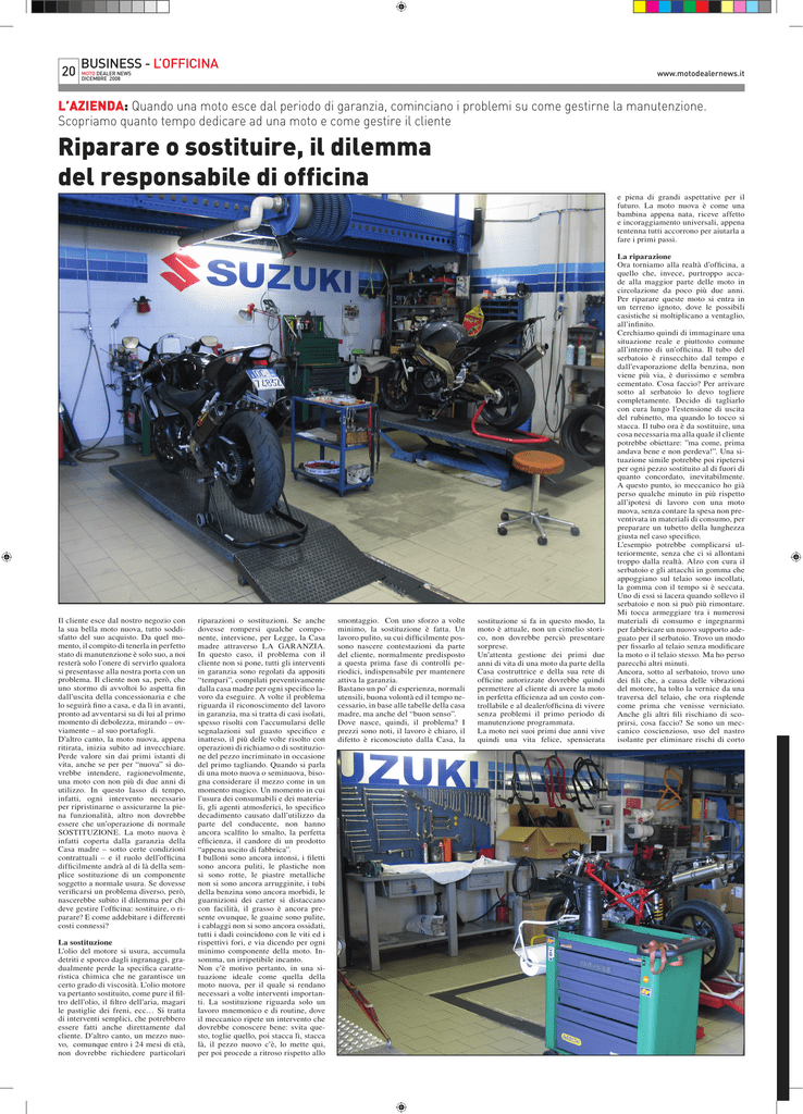 20 business - l’officina www.motodealernews.it MOTO DEALER NEWS dicembre 2008 L’AZIENDA: Quando una moto esce dal periodo di garanzia, cominciano i problemi su come gestirne la manutenzione. Scopriamo quanto tempo dedicare ad una moto e come gestire il cliente Riparare o sostituire, il dilemma del responsabile di officina e piena di grandi aspettative per il futuro. La moto nuova è come una bambina appena nata, riceve affetto e incoraggiamento universali, appena tentenna tutti accorrono per aiutarla a fare i primi passi. Il cliente esce dal nostro negozio con la sua bella moto nuova, tutto soddisfatto del suo acquisto. Da quel momento, il compito di tenerla in perfetto stato di manutenzione è solo suo, a noi resterà solo l’onere di servirlo qualora si presentasse alla nostra porta con un problema. Il cliente non sa, però, che uno stormo di avvoltoi lo aspetta fin dall’uscita della concessionaria e che lo seguirà fino a casa, e da lì in avanti, pronto ad avventarsi su di lui al primo momento di debolezza, mirando – ovviamente – al suo portafogli. D’altro canto, la moto nuova, appena ritirata, inizia subito ad invecchiare. Perde valore sin dai primi istanti di vita, anche se per per “nuova” si dovrebbe intendere, ragionevolmente, una moto con non più di due anni di utilizzo. In questo lasso di tempo, infatti, ogni intervento necessario per ripristinarne o assicurarne la piena funzionalità, altro non dovrebbe essere che un’operazione di normale SOSTITUZIONE. La moto nuova è infatti coperta dalla garanzia della Casa madre – sotto certe condizioni contrattuali – e il ruolo dell’officina difficilmente andrà al di là della semplice sostituzione di un componente soggetto a normale usura. Se dovesse verificarsi un problema diverso, però, nascerebbe subito il dilemma per chi deve gestire l’officina: sostituire, o riparare? E come addebitare i differenti costi connessi? La sostituzione L’olio del motore si usura, accumula detriti e sporco dagli ingranaggi, gradualmente perde la specifica caratteristica chimica che ne garantisce un certo grado di viscosità. L’olio motore va pertanto sostituito, come pure il filtro dell’olio, il filtro dell’aria, magari le pastiglie dei freni, ecc… Si tratta di interventi semplici, che potrebbero essere fatti anche direttamente dal cliente. D’altro canto, un mezzo nuovo, comunque entro i 24 mesi di età, non dovrebbe richiedere particolari riparazioni o sostituzioni. Se anche dovesse rompersi qualche componente, interviene, per Legge, la Casa madre attraverso LA GARANZIA. In questo caso, il problema con il cliente non si pone, tutti gli interventi in garanzia sono regolati da appositi “tempari”, compilati preventivamente dalla casa madre per ogni specifico lavoro da eseguire. A volte il problema riguarda il riconoscimento del lavoro in garanzia, ma si tratta di casi isolati, spesso risolti con l’accumularsi delle segnalazioni sul guasto specifico e inatteso, il più delle volte risolto con operazioni di richiamo o di sostituzione del pezzo incriminato in occasione del primo tagliando. Quando si parla di una moto nuova o seminuova, bisogna considerare il mezzo come in un momento magico. Un momento in cui l’usura dei consumabili e dei materiali, gli agenti atmosferici, lo specifico decadimento causato dall’utilizzo da parte del conducente, non hanno ancora scalfito lo smalto, la perfetta efficienza, il candore di un prodotto “appena uscito di fabbrica”. I bulloni sono ancora intonsi, i filetti sono ancora puliti, le plastiche non si sono rotte, le piastre metalliche non si sono ancora arrugginite, i tubi della benzina sono ancora morbidi, le guarnizioni dei carter si distaccano con facilità, il grasso è ancora presente ovunque, le guaine sono pulite, i cablaggi non si sono ancora ossidati, tutti i dadi coincidono con le viti ed i rispettivi fori, e via dicendo per ogni minimo componente della moto. Insomma, un irripetibile incanto. Non c’è motivo pertanto, in una situazione ideale come quella della moto nuova, per il quale si rendano necessari a volte interventi importanti. La sostituzione riguarda solo un lavoro mnemonico e di routine, dove il meccanico ripete un intervento che dovrebbe conoscere bene: svita questo, toglie quello, poi stacca lì, stacca là, il pezzo nuovo c’è, lo mette qui, per poi procede a ritroso rispetto allo smontaggio. Con uno sforzo a volte minimo, la sostituzione è fatta. Un lavoro pulito, su cui difficilmente possono nascere contestazioni da parte del cliente, normalmente predisposto a questa prima fase di controlli periodici, indispensabile per mantenere attiva la garanzia. Bastano un po’ di esperienza, normali utensili, buona volontà ed il tempo necessario, in base alle tabelle della casa madre, ma anche del “buon senso”. Dove nasce, quindi, il problema? I prezzi sono noti, il lavoro è chiaro, il difetto è riconosciuto dalla Casa, la sostituzione si fa in questo modo, la moto è attuale, non un cimelio storico, non dovrebbe perciò presentare sorprese. Un’attenta gestione dei primi due anni di vita di una moto da parte della Casa costruttrice e della sua rete di officine autorizzate dovrebbe quindi permettere al cliente di avere la moto in perfetta efficienza ad un costo controllabile e al dealer/officina di vivere senza problemi il primo periodo di manutenzione programmata. La moto nei suoi primi due anni vive quindi una vita felice, spensierata La riparazione Ora torniamo alla realtà d’officina, a quello che, invece, purtroppo accade alla maggior parte delle moto in circolazione da poco più due anni. Per riparare queste moto si entra in un terreno ignoto, dove le possibili casistiche si moltiplicano a ventaglio, all’infinito. Cerchiamo quindi di immaginare una situazione reale e piuttosto comune all’interno di un’officina. Il tubo del serbatoio è rinsecchito dal tempo e dall’evaporazione della benzina, non viene più via, è durissimo e se