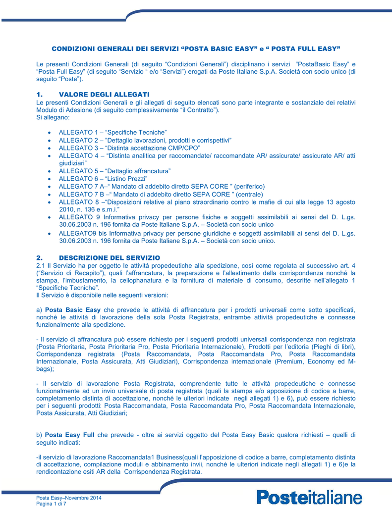 CONDIZIONI GENERALI DEI SERVIZI “POSTA BASIC EASY” e “ POSTA FULL EASY” Le presenti Condizioni Generali (di seguito “Condizioni Generali”) disciplinano i servizi “PostaBasic Easy” e “Posta Full Easy” (di seguito “Servizio “ e/o “Servizi”) erogati da Poste Italiane S.p.A. Società con socio unico (di seguito “Poste”). 1. VALORE DEGLI ALLEGATI Le presenti Condizioni Generali e gli allegati di seguito elencati sono parte integrante e sostanziale dei relativi Modulo di Adesione (di seguito complessivamente “il Contratto”). Si allegano: ALLEGATO 1 – “Specifiche Tecniche” ALLEGATO 2 – ”Dettaglio lavorazioni, prodotti e corrispettivi” ALLEGATO 3 – “Distinta accettazione CMP/CPO” ALLEGATO 4 – “Distinta analitica per raccomandate/ raccomandate AR/ assicurate/ assicurate AR/ atti giudiziari” ALLEGATO 5 – “Dettaglio affrancatura” ALLEGATO 6 – “Listino Prezzi” ALLEGATO 7 A–“ Mandato di addebito diretto SEPA CORE ” (periferico) ALLEGATO 7 B –“ Mandato di addebito diretto SEPA CORE ” (centrale) ALLEGATO 8 –“Disposizioni relative al piano straordinario contro le mafie di cui alla legge 13 agosto 2010, n. 136 e s.m.i.” ALLEGATO 9 Informativa privacy per persone fisiche e soggetti assimilabili ai sensi del D. L.gs. 30.06.2003 n. 196 fornita da Poste Italiane S.p.A. – Società con socio unico ALLEGATO9 bis Informativa privacy per persone giuridiche e soggetti assimilabili ai sensi del D. L.gs. 30.06.2003 n. 196 fornita da Poste Italiane S.p.A. – Società con socio unico. 2. DESCRIZIONE DEL SERVIZIO 2.1 Il Servizio ha per oggetto le attività propedeutiche alla spedizione, così come regolata al successivo art. 4 (“Servizio di Recapito”), quali l’affrancatura, la preparazione e l’allestimento della corrispondenza nonché la stampa, l’imbustamento, la cellophanatura e la fornitura di materiale di consumo, descritte nell’allegato 1 “Specifiche Tecniche”. Il Servizio è disponibile nelle seguenti versioni: a) Posta Basic Easy che prevede le attività di affrancatura per i prodotti universali come sotto specificati, nonché le attività di lavorazione della sola Posta Registrata, entrambe attività propedeutiche e connesse funzionalmente alla spedizione. - Il servizio di affrancatura può essere richiesto per i seguenti prodotti universali corrispondenza non registrata (Posta Prioritaria, Posta Prioritaria Pro, Posta Prioritaria Internazionale), Prodotti per l’editoria (Pieghi di libri), Corrispondenza registrata (Posta Raccomandata, Posta Raccomandata Pro, Posta Raccomandata Internazionale, Posta Assicurata, Atti Giudiziari), Corrispondenza internazionale (Premium, Economy ed Mbags); - Il servizio di lavorazione Posta Registrata, comprendente tutte le attività propedeutiche e connesse funzionalmente ad un invio universale di posta registrata (quali la stampa e/o apposizione di codice a barre, completamento distinta di accettazione, nonché le ulteriori indicate negli allegati 1) e 6), può essere richiesto per i seguenti prodotti: Posta Raccomandata, Posta Raccomandata Pro, Posta Raccomandata Internazionale, Posta Assicurata, Atti Giudiziari; b) Posta Easy Full che prevede - oltre ai servizi oggetto del Posta Easy Basic qualora richiesti – quelli di seguito indicati: -il servizio di lavorazione Raccomandata1 Business(quali l’apposizione di codice a barre, completamento distinta di accettazione, compilazione moduli e abbinamento invii, nonché le ulteriori indicate negli allegati 1) e 6)e la rendicontazione esiti AR della Corrispondenza Registrata. Posta Easy–Novembre 2014 Pagina 1 di 7 - Il servizio di prelavorazione della Posta Commerciale e Direct Entry comprensivo anche dell’affrancatura può essere richiesto per i seguenti prodotti: Posta Commerciale (PostaZone, Postatarget Card, Postatarget Basic, Postatarget Creative, PostatargetCatalog, Postatarget Magazine, Postatarget Gold), Prodotti per l’editoria (Stampe Periodiche, Pieghi di libri, Promozione in Abbonamento, Promozione No Profit, Premium, Economy) e per il prodotto Direct Entry. - I servizi di stampa, imbustamento e cellophanatura possono essere richiesti solo per i prodotti previsti nell’allegato 1 “Specifiche Tecniche Posta Full Easy “. 2.2 Il Cliente, durante il periodo di validità contrattuale, ha la facoltà di chiedere ulteriori servizi tra quelli indicati nel Modulo di Adesione e originariamente non richiesti, mediante apposita comunicazione da inviare tramite raccomandata con avviso di ricevimento all’indirizzo di Poste indicato nel Modulo di Adesione. 2.3 Poste si riserva, e fin d’ora il Cliente autorizza, di espletare parte dei servizi o singole attività oggetto del presente Contratto tramite società controllate o soggetti terzi, garantendo in ogni caso il rispetto degli impegni assunti. 3. MODALITA’ DI EROGAZIONE DEL SERVIZIO 3.1 Il Cliente si impegna a consegnare presso l’Ufficio di Accettazione Abilitato, indicato nel Modulo di Adesione, la corrispondenza oggetto dei Servizi richiesti. 3.2 Gli invii dovranno essere corredati da una distinta in triplice copia predisposta dal Cliente (Allegato 3), del modulo “dettaglio affrancatura” (allegato 5) quando sia richiesto il servizio di Affrancatura, nonché dell’apposita distinta analitica (Allegato 4) prevista per la corrispondenza registrata. 3.3 Il Cliente, per ogni singola consegna superiore a 5.000 invii, è tenuto a pianificare le attività ed a darne comunicazione a Poste, almeno 2 giorni prima della spedizione all’indirizzo di posta elettronica del Referente Operativo indicato nel Modulo di Adesione. 3.4 Qualora il Cliente presenti gli invii regolarmente affrancati, predisposti secondo le modalità di cui all’Allegato 1, Poste provvede ad accettare detti invii al termine del processo di lavorazione. 4. SERVIZIO DI RECAPITO 4.1 Ove il Cliente richieda a Poste, tramite il Servizio, l’attività di affrancatura di cui al precedente art. 2