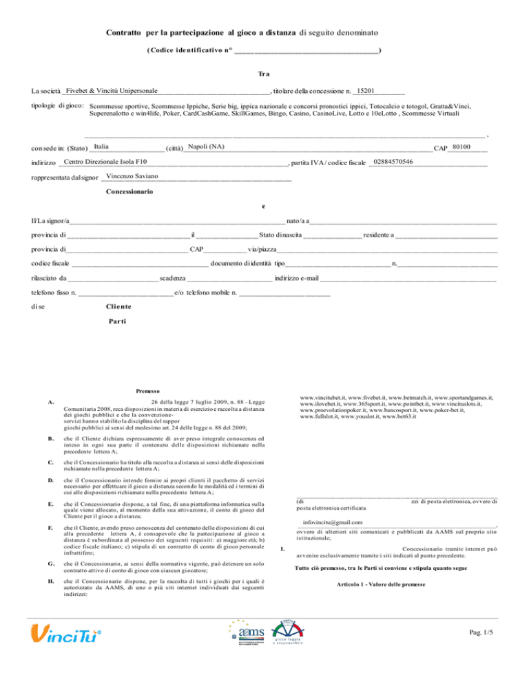 Contratto per la partecipazione al gioco a distanza di seguito denominato “contratto” ( Codice identificativo n° ____________________________________) Tra Fivebet & Vincitù Unipersonale 15201 La società __________________________________________________________, titolare della concessione n. ______________ per l’esercizio delle seguenti tipologie di gioco: Scommesse sportive, Scommesse Ippiche, Serie big, ippica nazionale e concorsi pronostici ippici, Totocalcio e totogol, Gratta&Vinci, Superenalotto e win4life, Poker, CardCashGame, SkillGames, Bingo, Casino, CasinoLive, Lotto e 10eLotto , Scommesse Virtuali ________________________________________________________________________________________________________________ , Italia Napoli (NA) 80100 con sede in: (Stato) _____________________ (città)______________________________________________________________________ CAP___________ 02884570546 Centro Direzionale Isola F10 indirizzo ________________________________________________________________, partita IVA / codice fiscale _________________________________ Vincenzo Saviano rappresentata dal signor ________________________________________________ _____ di seguito denominata il “ Concessionario”; e Il/La signor/a____________________________________________________________ nato/a a_____________________________________________________ provincia di __________________________________ il _________________ Stato di nascita ________________ residente a _____________________________ provincia di__________________________________ CAP____________ via/piazza______________________________________________________________ codice fiscale ______________________________________ documento di identità tipo_____________________________ n.____________________________ rilasciato da _________________________ scadenza ________________________ indirizzo e-mail _________________________________________________ telefono fisso n. __________________________ e/o telefono mobile n. _________________________ di seguito denominato il “ Cliente ”; Di seguito denominate le “ Parti”; Premesso A. che l’articolo 24, commi da 11 a 26 della legge 7 luglio 2009, n. 88 - Legge Comunitaria 2008, reca disposizioni in materia di esercizio e raccolta a distanza dei giochi pubblici e che la convenzione-tipo, l’atto integrativo e la carta dei servizi hanno stabilito la disciplina del rapporto di concessione dell’esercizio dei giochi pubblici ai sensi del medesimo art. 24 delle legge n. 88 del 2009; B. che il Cliente dichiara espressamente di aver preso integrale conoscenza ed inteso in ogni sua parte il contenuto delle disposizioni richiamate nella precedente lettera A; C. che il Concessionario ha titolo alla raccolta a distanza ai sensi delle disposizioni richiamate nella precedente lettera A; D. che il Concessionario intende fornire ai propri clienti il pacchetto di servizi necessario per effettuare il gioco a distanza secondo le modalità ed i termini di cui alle disposizioni richiamate nella precedente lettera A; E. che il Concessionario dispone, a tal fine, di una piattaforma informatica sulla quale viene allocato, al momento della sua attivazione, il conto di gioco del Cliente per il gioco a distanza; F. che il Cliente, avendo preso conoscenza del contenuto delle disposizioni di cui alla precedente lettera A, è consapevole che la partecipazione al gioco a distanza è subordinata al possesso dei seguenti requisiti: a) maggiore età; b) codice fiscale italiano; c) stipula di un contratto di conto di gioco personale infruttifero; G. che il Concessionario, ai sensi della normativa vigente, può detenere un solo contratto attivo di conto di gioco con ciascun gi ocatore; H. che il Concessionario dispone, per la raccolta di tutti i giochi per i quali è autorizzato da AAMS, di uno o più siti internet individuati dai seguenti indirizzi: www.vincitubet.it, www.fivebet.it, www.betmatch.it, www.sportandgames.it, www.ilovebet.it, www.365sport.it, www.pointbet.it, www.vincituslots.it, www.proevolutionpoker.it, www.bancosport.it, www.poker-bet.it, www.fullslot.it, www.youslot.it, www.bet63.it ________________________________________________________________ (di seguito denominati “siti”) e degli indiri zzi di posta elettronica, ovvero di posta elettronica certificata [email protected] _____________________________________________________________, ovvero di ulteriori siti comunicati e pubblicati da AAMS sul proprio sito istituzionale; I. che l’attività di raccolta del gioco del Concessionario tramite internet può avvenire esclusivamente tramite i siti indicati al punto precedente. Tutto ciò premesso, tra le Parti si conviene e stipula quanto segue Articolo 1 - Valore delle premesse Pag. 1/5 1. Le premesse, assumendo espressamente valore pattizio tra le P arti, costituiscono parte integrante e sostanziale del contratto che annulla e sostituisce qualsiasi eventuale contratto per il servizio di accettazione del gioco a distanza precedentemente stipulato tra le P arti. Articolo 2 - Oggetto del contratto 1. Oggetto del contratto è l’attivazione di un conto di gioco infruttifero, residente sul sistema di conti di gioco di cui si avvale il Concessionario, intestato esclusivamente al Cliente, per la partecipazione al gioco a distanza. 2. Il Concessionario consente al Cliente la partecipazione a distanza ai seguenti giochi, per l’esercizio dei quali è stato autorizzato da AAMS: Scommesse sportive, Scommesse Ippiche, Serie big, ippica nazionale e concorsi pronostici ippici, Totocalcio e totogol, Gratta&Vinci, Superenalotto e win4life, Poker, CardCashGame, SkillGames, Bingo, Casino, CasinoLive, Lotto e 10eLotto , Scommesse Virtuali delle premesse, che il Cliente medesimo dichiara espressamente di ben conoscere ed intendere, avendone preso visione completa. 5. Il conto di gioco è attivato solo a seguito della convalida da parte del Sistema Centrale dell’Amministrazione autonoma dei monopoli di Stato. 6. L’att