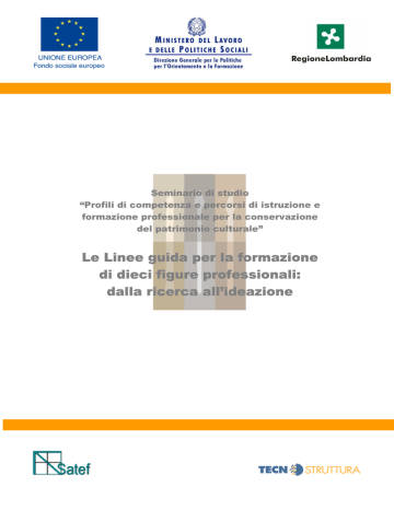 Seminario di studio “Profili di competenza e percorsi di istruzione e formazione professionale per la conservazione del patrimonio culturale” Le Linee guida per la formazione di dieci figure professionali: dalla ricerca all’ideazione Hanno collaborato al lavoro di ricerca: Aiello Vincenzo Consulente - Regione Calabria Appolonia Lorenzo Regione Valle D’Aosta - Direttore Dipartimento Cultura Beni Archeologici e Paesaggistici Arrighetti Elisabetta Enaip Lombardia Scuola regionale Botticino Bergamaschi Ugo CFP “Bertesi” Cremona Bonomi Roberto Enaip Lombardia Scuola regionale Botticino Giacobbe Borelli Maura Restauratrice Beni Culturali Bossi Mario Scuola d'arte “Fantoni” Bergamo Cannada Ninfa Regione Lombardia – DG Culture, identità e autonomie della Lombardia Carminati Paola Scuola d'arte “Fantoni” BERGAMO Cassinerio Marina Regione Liguria – Dipartimento/Settore Politiche per l’Istruzione e Formazione Professionale Integrate Coppola Elisa Regione Liguria – Servizio Piani Programmi e Organizzazione Culturale Crovato Francesco Regione Lombardia - DG Culture, identità e autonomie della Lombardia De Dominicis Daniele Consulente (Opera Juventutis) – Regione Abruzzo Della Torre Stefano Politecnico di Milano – Facoltà di Architettura Del Mastro Gabriella Regione Piemonte – Assessorato Formazione Professionale e Istruzione Di Lallo Maria Rosa Regione Abruzzo – Responsabile Ufficio Integrazione dei Sistemi Elli Gabriele CFP “Terragni” Meda Favarin Cristian IAL Emilia Romagna - Direzione Area di Modena e Reggio Emilia Favaro Laura Provincia Autonoma di Bolzano – Ripartizione 39 Affari Comunitari – Area Gestione Progetti FSE Federici Carlo Regione Lombardia - DG Culture, identità e autonomie della Lombardia Ferioli Paola Regione Lombardia – DG Culture, identità e autonomie della Lombardia Foglieni Ornella Regione Lombardia - DG Culture, identità e autonomie della Lombardia Gasparoli Paolo Politecnico di Milano – Facoltà di Architettura Ghiazza Maria Grazia Regione Piemonte – Soprintendenza Beni Librari Gianotti Katia Regione Valle D’Aosta - Collaboratrice Restauratrice Beni Culturali Magrelli Barbara CEFME Lazio – Restauratrice Consulente Malferrari Erminia Regione Emilia-Romagna - P.O. Formazione regolamentata Servizio Formazione Professionale Mariani Paolo CFP “Bertesi” Cremona Muratori Olivia CEFME Lazio – Architetto Restauratrice Consulente Pedelì Corrado Regione Valle D’Aosta - Restauratore Beni Culturali Pisano Claudio Regione Lazio – Formazione Professionale e Politiche del Lavoro Porru Rita Tecnostruttura Previdi Maria Teresa Fondazione Enaip Lombardia Priori Claudio Regione Lazio – Formazione Professionale e Politiche del Lavoro Ronzon Laura Regione Lombardia - Museo della Scienza e della Tecnologia - Conservatorato Sangion Manuela CFP “Terragni” Meda Savoldelli Fiorenzo Scuola Edile Bergamo Serino Carlo Ivan Enaip Lombardia Scuola regionale Botticino Tentarelli Francesco Regione Abruzzo - Direttore Agenzia di Promozione di Neretto - Servizio Beni Culturali – Sicurezza e Promozione Sociale Trenta Bruno Consulente - Provincia Autonoma di Bolzano Per Satef Srl hanno coordinato i lavori: Marchesi Lucia, Masper Moira, Peduzzi Angela, Pennati Adriano, Vittori Mariaelena Indice Prima sezione............................................................................................................................................................... 1 QUESTO SEMINARIO .................................................................................................................................................... 1 LA RICERCA ................................................................................................................................................................ 1 Gli obiettivi della ricerca ....................................................................................................................................... 1 Gli obiettivi del Seminario..................................................................................................................................... 2 LA NORMATIVA DI RIFERIMENTO .................................................................................................................................... 2 Il D. Lgs. 22 gennaio 2004 ................................................................................................................................... 2 La normativa di riforma dell’istruzione e formazione professionale...................................................................... 5 LE FASI DI LAVORO....................................................................................................................................................... 8 I PRODOTTI ................................................................................................................................................................. 9 La catena del processo di conservazione del patrimonio culturale e la relativa mappa delle attività................... 9 Le figure professionali analizzate....................................................................................................................... 11 I dizionari delle competenze............................................................................................................................... 15 Le Linee guida per la formazione....................................................................................................................... 16 Seconda sezione – Le Linee guida per la formazione............................................................................................ 19 TECNICO COLLABORATORE DEL RESTAURATORE DI MATERIALI LAPIDEI, LITOIDI E MANUFATTI DERIVATI ............................ 19 Introduzione........................................................................................................................................................ 19 Linee 