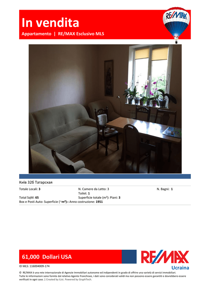 In vendita Appartamento | RE/MAX Esclusivo MLS Київ 32б Татарская Totale Locali: 3 N. Camere da Letto: 3 Toilet: 1 Total SqM: 65 Superficie totale (m²): Piani: 3 Box e Posti Auto: Superficie (~m²):: Anno costruzione: 1951 N. Bagni: 1 61,000 Dollari USA ID MLS: 116004009-174 Ucraina © RE/MAX è una rete internazionale di Agenzie Immobiliari autonome ed indipendenti in grado di offrire una varietà di servizi immobiliari. Tutte le informazioni sono fornite dal relativo Agente Franchisee, i dati sono considerati validi ma non possono essere garantiti e dovrebbero essere verificati in ogni caso. | Created by iList. Powered by GryphTech. In vendita Appartamento | RE/MAX Esclusivo MLS Vladimir Lazarev (Sales Specialist) Cell +380676574440 Tel. diretto +380676574440 Fax: [email protected] http://remax-ecg.com.ua RE/MAX Elite and Commercial group Владимирская 49-а, оф. 134 Київ Київська Ukraine Шевченковский район, ул. Татарская 32 б, 2-й этаж, 65/45/7, "сталинка", балкон, уютная 3х комнатная квартира с капитальным ремонтом, санузел раздельный, ж/б перекрытия, паркет, дубовые межкомнатные двери, кондиционеры, бойлер, замена проводки, водоснабжения, металлопластиковые окна, Н=3.05, встраиваемая кухня, шкафы купе, есть сигнализация. Возле дома школа, детский сад. Заходи и комфортно живи Caratteristiche: Ammobiliato ¦ Aria condizionata ¦ Pavimento in Parquet ¦ Riscaldamento Centralizzato ¦ Stufa a Gas ¦ Mattoni a vista ¦ Balcone ¦ Parcheggio ¦ Impianto di allarme ¦ Primo proprietario ¦ Fonte/Sorgente d'acqua propria ¦ TV via cavo 61,000 Dollari USA ID MLS: 116004009-174 Ucraina © RE/MAX è una rete internazionale di Agenzie Immobiliari autonome ed indipendenti in grado di offrire una varietà di servizi immobiliari. Tutte le informazioni sono fornite dal relativo Agente Franchisee, i dati sono considerati validi ma non possono essere garantiti e dovrebbero essere verificati in ogni caso. | Created by iList. Powered by GryphTech.