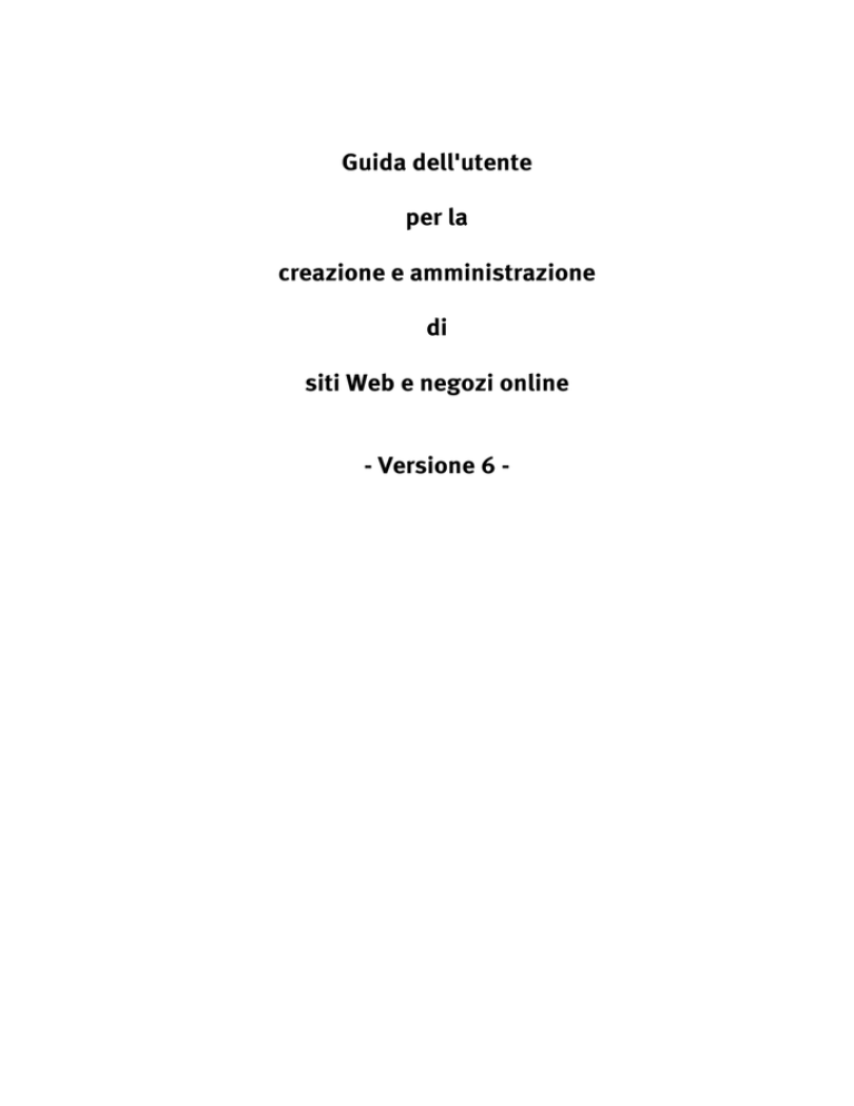Guida dell'utente per la creazione e amministrazione di siti Web e negozi online - Versione 6 - Sommario Sommario 1. Introduzione .........................................................11 Prerequisiti ........................................................................ 11 Presentazione della Guida .................................................. 11 2. 3. Guida rapida / Operazioni iniziali...........................13 Principi di base .....................................................17 Layout generale di pagina ................................................... 17 Navigazione nell'amministrazione.............................................. 17 Area di lavoro ............................................................................ 18 Barra laterale ............................................................................ 18 Contenitore ........................................................................ 18 Cronologia ......................................................................... 19 Preferiti .............................................................................. 19 Sezioni............................................................................... 20 Guida ................................................................................. 20 Pulsante attivo Salva .......................................................... 20 Visualizzazioni del sito Web................................................ 20 Tabelle............................................................................... 21 Aggiunta di record ................................................................. 21 Modifica di record ................................................................. 21 Eliminazione di record ........................................................... 21 Selezione nelle tabelle ..........................................................22 Elaborazione batch nelle tabelle ............................................22 Ordinamento mediante chiavi ................................................22 Ricerca ............................................................................... 22 Dipendenza dalla lingua ..................................................... 23 Impostazioni predefinite ..................................................... 23 Visibilità ............................................................................ 23 Tipi di attributo .................................................................. 24 Utilizzo del testo con selezione del valore .............................. 25 Utilizzo di opzioni..................................................................26 Utilizzo dei campi di testo................................................... 27 Editor WYSIWYG.................................................................. 27 Inserimento e modifica di immagini e video ............................ 28 Inserimento e modifica di elementi multimediali..................... 28 Contenuto della pagina Flash .....................................................28 Gadget ......................................................................................29 Contenuto della pagina RSS ....................................................... 29 Inserimento e rimozione di collegamenti ................................29 Inserimento di ancore ................................................................ 29 Caricamento di immagini .................................................... 29 Selettore di colore .............................................................. 30 Gestione dei file ................................................................. 31 Importazione ed esportazione ............................................. 32 Esportazione ......................................................................... 32 File di importazione ............................................................... 33 Modifica di file CSV in Microsoft Excel ....................................34 URL breve ........................................................................... 34 Creazione di un URL breve per tutte le pagine ............................. 34 Guida dell'utente per amministratori di siti Web Pagina 3 Sommario 4. Informazioni amministratore ..................................37 Query di sicurezza per azioni di eliminazione ...................... 37 5. Impostazioni .........................................................39 Impostazioni generali ......................................................... 39 Generale ............................................................................... 39 Presentazioni ............................................................................ 39 Stato......................................................................................... 39 Impostazioni avanzate............................................................... 39 Cache della pagina ................................................................ 39 Utilizzo .................................................................................40 Indirizzo................................................................................ 41 Orario di attività ....................................................................41 Amministrazione utenti....................................................... 41 Utenti ...................................................................................41 Dettagli utente - Informazioni per l'accesso ................................ 41 Dettagli utente - Messaggi ......................................................... 42 Dettagli utente - Newsletter........................................................ 42 Gruppi utente ........................................................................42 Registrazione ........................................................................ 42 Accesso ................................................................................ 43 Amministratori ................