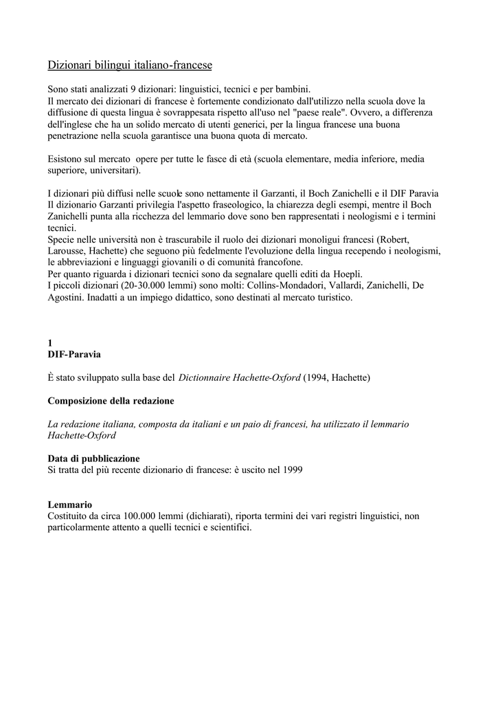 Dizionari bilingui italiano-francese Sono stati analizzati 9 dizionari: linguistici, tecnici e per bambini. Il mercato dei dizionari di francese è fortemente condizionato dall'utilizzo nella scuola dove la diffusione di questa lingua è sovrappesata rispetto all'uso nel "paese reale". Ovvero, a differenza dell'inglese che ha un solido mercato di utenti generici, per la lingua francese una buona penetrazione nella scuola garantisce una buona quota di mercato. Esistono sul mercato opere per tutte le fasce di età (scuola elementare, media inferiore, media superiore, universitari). I dizionari più diffusi nelle scuole sono nettamente il Garzanti, il Boch Zanichelli e il DIF Paravia Il dizionario Garzanti privilegia l'aspetto fraseologico, la chiarezza degli esempi, mentre il Boch Zanichelli punta alla ricchezza del lemmario dove sono ben rappresentati i neologismi e i termini tecnici. Specie nelle università non è trascurabile il ruolo dei dizionari monoligui francesi (Robert, Larousse, Hachette) che seguono più fedelmente l'evoluzione della lingua recependo i neologismi, le abbreviazioni e linguaggi giovanili o di comunità francofone. Per quanto riguarda i dizionari tecnici sono da segnalare quelli editi da Hoepli. I piccoli dizionari (20-30.000 lemmi) sono molti: Collins-Mondadori, Vallardi, Zanichelli, De Agostini. Inadatti a un impiego didattico, sono destinati al mercato turistico. 1 DIF-Paravia È stato sviluppato sulla base del Dictionnaire Hachette-Oxford (1994, Hachette) Composizione della redazione La redazione italiana, composta da italiani e un paio di francesi, ha utilizzato il lemmario Hachette-Oxford Data di pubblicazione Si tratta del più recente dizionario di francese: è uscito nel 1999 Lemmario Costituito da circa 100.000 lemmi (dichiarati), riporta termini dei vari registri linguistici, non particolarmente attento a quelli tecnici e scientifici. Lemma Il lemma viene riportato in grassetto, la trascrizione fonetica tra barrette, le etichette in maiuscoletto. Glossa Il dizionario è bidirezionale. Nella sezione francese- italiano si percepisce positivamente la presenza di un lemmario di origine francese. Graficamente è piuttosto confuso, con molti cambi di carattere. Le spiegazioni tra parentesi quadre risultano a volte ambigue e inutili. Chiare e ben identificabili le etichette di settore. Ricco di esempi, riporta termini molto attuali. Riporta con coerenza le collocazione, cioè parole con cui il lemma forma combinazioni tipiche e molti acronimi. Appendici Verbi italiani, verbi francesi, corrispondenza francese, annunci economici. Valutazione complessiva. Risulta essere attualmente il più aggiornato e, probabilmente, il migliore sul mercato, malgrado il minor numero di lemmi rispetto a Garzanti e Boch e la grafica. Valutazione sintetica: 5 2 Robert-Signorelli Composizione della redazione Si tratta di una coedizione Robert-Signorelli, quindi la redazione della sezione francese comprende i redattori e tutta l’équipe del Petit Robert, mentre la redazione italiana, diretta da Augusto Arizzi è composta da redattori e collaboratori soprattutto italiani con una o due francesi. Editore Signorelli- Elemond Editori Associati Data di pubblicazione e di ristampa È stata pubblicata un’unica edizione nel 1981 in due volumi (sezione francese- italiano e sezione italiano- francese). Nel 1996 è stato ristampato in un unico volume. Lemmario Il lemmario della sezione francese-italiano è esattamente quello del Petit Robert (edizione del 1981) sul quale ha lavorato la redazione italiana in collaborazione con quella francese. Si tratta decisamente di un lemmario che privilegia la lingua corrente e non quella tecnica. Vengono dichiarate 59.000 voci ma il totale di lemmi e accezioni sale a circa 190.000. Riporta tutti i registri di lingua: le forme locali, il verlan, l'argot ecc. Lemma Il lemma viene riportato in grassetto, è seguito dalla fonetica (non fra parentesi quadre, il che potrebbe far pensare a una trascrizione fonematica), l’eccezione grammaticale è riportata direttamente a lemma, lo specificatore grammaticale segue. Glossa Il dizionario è decisamente bidirezionale, cioè riporta le spiegazioni in francese dalla parte francese tra parentesi quadre e in italiano dalla parte italiano francese. L’impatto grafico risulta di difficile lettura per tutti i cambi di carattere, parentesi ecc. Numeri romani dividono le categorie grammaticali o le accezioni principali all’interno delle quali numeri arabi suddividono sottoaccezioni. Non vengono riportate citazoni. Il lemmario francese- italiano è buono in quanto nasce in Francia, purtroppo i traducenti spesso non esprimono un’attenta applicazione della lingua italiana realmente utilizzata. La sezione italianofrancese sembra riportare buone traduzioni in francese dei termini italiani, almeno secondo il parere di alcuni consulenti francesi madrelingua interpellati. Appendici Al termine della sezione francese- italiano sono riportate le seguenti appendici: Coniugazione dei verbi francesi Tavola dei numeri Nomi propri di persona storic i, mitologici Nomi propri dei luoghi e abitanti corrispondenti Nomi degli abitanti e luoghi corrispondenti Principali sigle, abbreviazioni francesi. Al termine della sezione italiano- francese sono riportate le seguenti appendici: Coniugazione dei verbi italiani Tavola dei numeri Nomi propri di persona storici, mitologici francese Nomi propri dei luoghi e abitanti corrispondenti Nomi degli abitanti e luoghi corrispondenti Principali sigle, abbreviazioni italiane. Valutazione complessiva L’idea di una coedizione è sicuramente ottima (come in parte testimonia il DIF), ma quest’opera ha ormai poco mercato sia perché non è più stata aggiornata del 1981 sia perché risulta di difficile lettura per la pesantezza della presentazione grafica. Inoltre i traducenti della sezione franceseitaliano spesso non sono di grande aiuto all’utente. 3 Dizionario Francese-Italiano/Italiano-Francese d