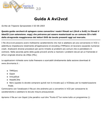 Guida A Avi2vcd Scritta da Trippone Spropositato il 02-06-2003 Questa guida cercherà di spiegare come convertire i nostri filmati avi (DivX o XviD) in filmati V ideoCD (con estensione .mpg) che potranno poi essere masterizzati su un comune CD e letti dalla stragrande maggioranza dei lettori DVD da tavolo presenti oggi sul mercato. I file divx/xvid possono avere moltissime caratteristiche che mal si adattano ad una conversione in VCD o addirittura impediscono totalmente all'applicazione di encoding (TMPGenc) di lavorare causando numerosi crash. Analizzerò diverse procedure per porre rimedio ai problemi più comuni che si potrebbero in contrare. Nella seconda parte della guida proverò anche a risolvere i problemi dovuti ad un framerate d ell'avi originale diverso da 25fps (PAL) Le applicazioni richieste sono tutte freeware e scaricabili direttamente dalla sezione download di www.divxmania.it : TMPGenc Gspot VirtualDub HeadAC3he Nero (questo lo dovete comprare quindi non lo trovate qui) o VCDeasy per la masterizzazione finale. Cominciamo con l'analizzare il file.avi che andremo poi a convertire in VCD per conoscerne le caratteristiche e adottare le dovute misure precauzionali. Apriamo il file.avi con Gspot (che peraltro vuol dire "Punto-G"?un nome tutto un programma-)): Controlliamo tra i tanti fattori + o ? interessanti il tipo di codec usati. In particolar modo controlliamo se il vi deo è DivX oppure XviD e se l'audio è MP3 oppure AC3. La presente guida non è pensata per essere letta nello stesso ordine in cui è stata scritta (ma che c**** vu ol dire?bò:-)), ma in base ai tipi di codecs evidenziati da Gspot si dovrà procedere in differenti modi. Comi nciamo. In base ai tipi di codifica audio/video procederemo con i metodi seguenti: CASO 1. Video DivX + Audio MP3 I DivX che presentano un flusso audio mp3 necessitano di un ulteriore controllo. Dobbiamo sapere se l'audio è un mp3 a bitrate costante (mp3 CBR) oppure un mp3 a bitrate variabile (mp3 VBR), poiché in fa se di conversione VideoCD il VBR crea notevoli casini. Lo stesso Gspot sarebbe in grado di dirci che tipo di audio abbiamo di fronte, ma più di una volta questo parametro si è rivelato inesatto, preferisco quindi us are VirtualDub per scoprirlo. Apriamo quindi il file.avi in Virtualdub. Se siamo di fronte ad un divx con audio in mp3 VBR ci apparirà i mmediatamente la seguente finestra d'avviso: se invece questa finestra non compare siamo sicuri che l'audio è CBR cioè a bitrate costante, tanto me glio. In base allora al tipo di mp3 scegliamo il caso 1-A o il caso 2-A. CASO 1-A Video DivX + Audio MP3 CBR Se VirtualDub in fase di apertura del file.avi non riscontra errori è possibile procedere immediatamente a lla conversione in VCD tramite TMPGenc. Chiudiamo quindi Vdub e apriamo TMPGenc. Se all'apertura di TMPGenc dovesse apparire il wizard (procedura guidata) bene chiudiamolo tanto non ci servirà. Clicchiamo sul tasto "browse" accanto alla casella "video source" e apriamo il file avi da convertire, automaticamente TMPGenc inserisce in "audio source" il medesimo file. Cioè assume di default che la s orgente audio sarà lo stesso file avi, in questo caso ci sta bene così, più avanti scopriremo che questo non va sempre bene. Clicchiamo ora sul pulsante "load" e cerchiamo i template predefiniti nella cartella d'installazione del programma, in genere C:\Programmi\Tmpgenc\Template per la versione free e C:\Programmi\Pegasys inc\Tmpgenc plus 2.5\Template per la versione Plus. I template sono file con estensione .mcf che contengono tutti i parametri di cui il programma ha bisogno già impostati per convertire un avi in vcd-svcd ecc... A noi ovviamente interessa il VideoCDPAL.mcf , apriamolo Bene ora clicchiamo sul pulsante setting nella finestra principale, si aprirà la seguente: Come possiamo notare le voci sono quasi tutte disabilitate giacché sono preimpostate dal template c aricato in precedenza. L'unica attiva è "Motion search precision" che se impostata su highest quality (very s low) assicura una qualità finale maggiore a discapito dei tempi di codifica, rispetto a "normal" aumentano d i quasi il doppio ma io comunque la uso sempre. Andiamo nella scheda advanced e impostiamo la voce "video arrange method" su "full screen (keep aspect ratio)" questo per evitare di vedere le immagini schiacciate o allungate sul TV. Lasciamo gli altri valori come di default. Nell'elenco sottostante l'unica funzione che potremmo dover usare è "Source range" per risolvere e ventuali problemi di asincronia audio/video e fare una prova di pochi secondi per vedere se tutto andrà b ene nella conversione del film intero. Di questo aspetto ho già parlato abbondantemente nella " Guida alla sincronizzazione audio/video nei VCD-SVCD" alla quale vi rimando. Sempre nella finestra setting di tmpgenc clicchiamo ora sulla scheda audio. Per esperienza personale i VCD visti in tv hanno un volume un po' più basso di quanto non possa sembrare sul divx/xvid d'origine, q uindi suggerisco di alzarlo un po' in fase di encoding VCD per evitare di dover portare il volume del televisore a fondo corsa. Spuntiamo la casellina "use audio edit" e clicchiamo il pulsante setting ci apparirà la seguente: Spuntiamo "change volume" e clicchiamo su "Normalize". Settiamo la normalizzazione a 100. Premendo ok il software imposterà automaticamente il giusto a umento di volume necessario (io poi in genere lo alzo di altri 40-50 punti). OK Ancora OK sulla finestra mpeg setting per tornare alla schermata principale di tmpgenc. Siamo pronti, ma ricapitoliamo un attimo prima di partire. Le poche cose da fare sono: Caricare il template VideoCDPal.mcf Selezionare Full screen (keep aspect ratio) nella finestra advanced. Se necessario aggiustare la sincronia audio con la funzione "source range" Alzare il volume Avete fatto tutto??? Molto bene premete start che si comincia! A lume di naso con una CPU da 2 Ghz il processo durerà più o meno come il film (dipende molto d