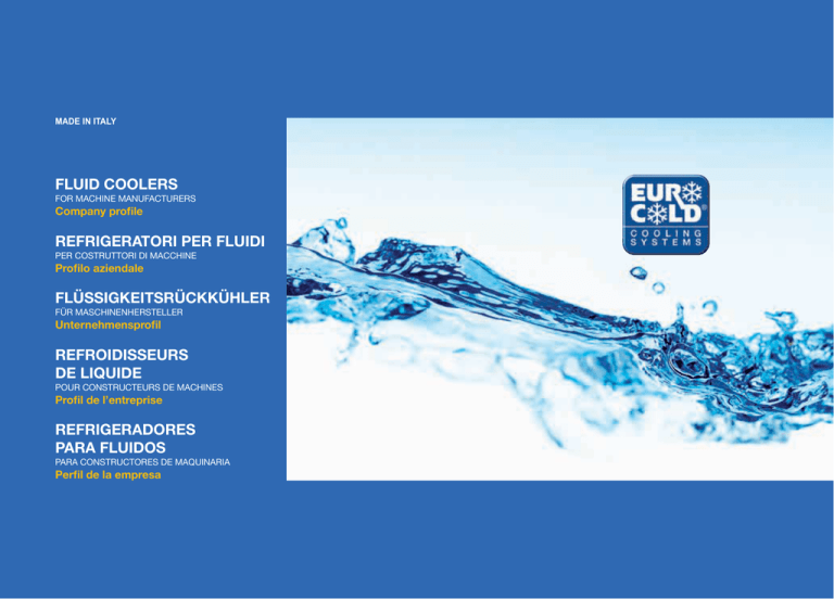 MADE IN ITALY FLUID COOLERS FOR MACHINE MANUFACTURERS Company profile REFRIGERATORI PER FLUIDI PER COSTRUTTORI DI MACCHINE Profilo aziendale FLÜSSIGKEITSRÜCKKÜHLER FÜR MASCHINENHERSTELLER Unternehmensprofil REFROIDISSEURS DE LIQUIDE POUR CONSTRUCTEURS DE MACHINES Profil de l’entreprise REFRIGERADORES PARA FLUIDOS PARA CONSTRUCTORES DE MAQUINARIA Perfil de la empresa Our mission To use the centrality of the customer as driving force for the delivery of innovation, quality and service La nostra mission Mirare alla centralità del cliente come forza trainante per garantire innovazione qualità e servizio Unsere Mission Der Kunde steht bei uns im Mittelpunkt. Unsere Kundenorientierung wirkt als treibende Kraft, um Innovation, Qualität und Service auf hohem Niveau zu gewährleisten Notre mission Mettre le client au centre de l’attention et en faire notre atout pour garantir l’innovation, la qualité et le service Nuestra misión Apostar por la centralidad del cliente como fuerza impulsora para garantizar la innovación, la calidad y el servicio 1 The company Euro Cold srl is based in the north of Italy near Modena. Euro Cold was founded in 1989 and was initially established as a technical engineering company in the industrial cooling sector. Today, Euro Cold is one of the major manufacturers of industrial chillers in Italy and also in Europe and has more than 25 years’ time-proven experience and state-of-the-art technology in developing both standard & customised coolers for various industries. Milan Bomporto (Modena) Rome The continuous and constant development from production, the EUC commercial organization the process of research, have brought the property to give life to a company destined to become a major player in the European machine manufacturers scenario. Until today Euro Cold has been able to share important informations on technical and application developments to a wide audience of machine builders thanks to the creation of a Commercial Network rooted in a wide European area, and not only, but also through agents, distributors and subsidiaries. 2 L’azienda Unternehmen La société La empresa Euro Cold srl si trova in provincia di Modena, nasce nel 1989 come società di progettazione nel settore della refrigerazione industriale ed è oggi uno dei principali produttori di refrigeratori per fluidi, sia sul territorio italiano che nel panorama europeo. Con i suoi oltre 25 anni di esperienza professionale, Euro Cold dispone di un’avanzata tecnologia volta sia allo sviluppo dei refrigeratori della propria gamma standard, sia alle molteplici soluzioni su misura che realizza per i diversi settori industriali. Euro Cold srl befindet sich in Norditalien in der Provinz Modena. Das Unternehmen entstand 1989 als Planungsgesellschaft für die Kältetechnikindustrie. Heute ist Euro Cold einer der größten Hersteller von Flüssigkeitskühlern in Italien und Europa. Dank seiner mittlerweile mehr als 25-jährigen Erfahrung verfügt Euro Cold über modernstes technisches Knowhow bei der Entwicklung von Kühlern für das eigene Standardangebot und bei Spezialanfertigungen für die verschiedenen Branchen. Euro Cold srl se situe dans le nord de l’Italie, en province de Modène. La société a fait ses premiers pas en 1989 dans l’étude et la mise au point des réfrigérateurs industriels. Aujourd’hui, Euro Cold est l’un des principaux fabricants de réfrigérateurs pour fluides, en Italie et en Europe. Forte de ses plus de 25 ans d’expérience dans le secteur, la société Euro Cold peut se targuer d’une technologie parfaite, non seulement pour développer ses propres réfrigérateurs, mais aussi pour réaliser sur mesure une infinité de solutions pour les différents secteurs industriels. Euro Cold srl se halla en el norte de Italia, en provincia de Módena. Se fundó en 1989 como empresa de ingeniería de proyectos para el sector de la refrigeración industrial. En la actualidad, Euro Cold es uno de los principales fabricantes de refrigeradores para líquidos, tanto en Italia como en Europa. Con sus más de 25 años de experiencia profesional, Euro Cold dispone de una tecnología avanzada que le permite desarrollar tanto los refrigeradores de su propia gama estándar como las numerosas soluciones personalizadas que realiza para diferentes sectores industriales. Il continuo e costante sviluppo della produzione, l’organizzazione commerciale di EUC, il processo di ricerca, hanno portato la proprietà a dare vita ad un’azienda destinata a diventare un attore importante nello scenario europeo dei produttori di macchine. Die kontinuierliche und stabile Entwicklung der Produktion von Anfang an, die kommerzielle Organisation, der Entwicklung und Forschung, haben die Firma EUC, dazu bestimmt, ein wichtiger zu Lieferer in der europäischen Maschinenhersteller Szenario zu werden. Le développement continu et régulier en commençant par la production, l’organisation commerciale EUC, le processus de recherche, a permis à la propriété de donner vie à une société destinée à devenir un des acteur majeur dans le scénario européen des fabricants de machines. El desarrollo continuo y constante empezando por la producción, la organización comercial de EUC, el proceso de investigación, han llevado la propiedad a dar vida una empresa destinada a convertirse en un jugador importante en el escenario europeo de fabricantes de máquinas. A oggi Euro Cold è in grado di condividere importanti informazioni sugli sviluppi tecnici ed applicativi a una vasta platea di costruttori di macchine grazie alla creazione di un Network Commerciale radicato in una vasta area Europea, e non solo, tramite agenti, distributori e filiali. Dank der langjährige Erfahrung mit einer breiten Palette von Werkzeugmaschinenhersteller und die Zusammenarbeit mit ein wichtiges Netzwerk von Agenten, Distributoren und Tochtergesellschaften entwickelt zu haben; Euro Cold ist heute in der Lage, wichtige In
