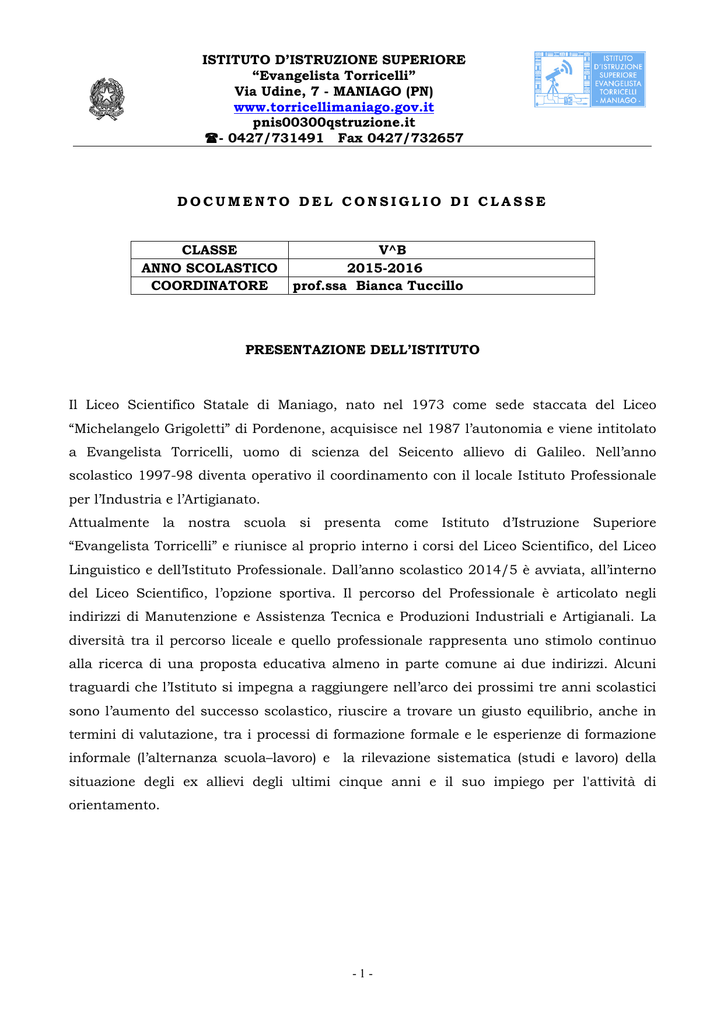 ISTITUTO D’ISTRUZIONE SUPERIORE “Evangelista Torricelli” Via Udine, 7 - MANIAGO (PN) www.torricellimaniago.gov.it pnis00300qstruzione.it - 0427/731491 Fax 0427/732657 DOCUMENTO DEL CONSIGLIO DI CLASSE CLASSE ANNO SCOLASTICO COORDINATORE V^B 2015-2016 prof.ssa Bianca Tuccillo PRESENTAZIONE DELL’ISTITUTO Il Liceo Scientifico Statale di Maniago, nato nel 1973 come sede staccata del Liceo “Michelangelo Grigoletti” di Pordenone, acquisisce nel 1987 l’autonomia e viene intitolato a Evangelista Torricelli, uomo di scienza del Seicento allievo di Galileo. Nell’anno scolastico 1997-98 diventa operativo il coordinamento con il locale Istituto Professionale per l’Industria e l’Artigianato. Attualmente la nostra scuola si presenta come Istituto d’Istruzione Superiore “Evangelista Torricelli” e riunisce al proprio interno i corsi del Liceo Scientifico, del Liceo Linguistico e dell’Istituto Professionale. Dall’anno scolastico 2014/5 è avviata, all’interno del Liceo Scientifico, l’opzione sportiva. Il percorso del Professionale è articolato negli indirizzi di Manutenzione e Assistenza Tecnica e Produzioni Industriali e Artigianali. La diversità tra il percorso liceale e quello professionale rappresenta uno stimolo continuo alla ricerca di una proposta educativa almeno in parte comune ai due indirizzi. Alcuni traguardi che l’Istituto si impegna a raggiungere nell’arco dei prossimi tre anni scolastici sono l’aumento del successo scolastico, riuscire a trovare un giusto equilibrio, anche in termini di valutazione, tra i processi di formazione formale e le esperienze di formazione informale (l’alternanza scuola–lavoro) e la rilevazione sistematica (studi e lavoro) della situazione degli ex allievi degli ultimi cinque anni e il suo impiego per l'attività di orientamento. -1- PRESENTAZIONE DELLA CLASSE La classe è composta attualmente da 15 studenti, 5 maschi e 10 femmine;tra questi uno studente è rientrato dopo aver frequentato parte del terzo anno di studi e per intero la classe quarta all’estero(USA) . Dieci sono gli alunni del nucleo originario, a cui si sono aggiunti nel corso del secondo anno cinque studenti ripetenti provenienti dalla II^B di questo Istituto .Il gruppo si è dimostrato, di norma, disciplinato e sufficientemente attento nel corso dell’attività didattica ad eccezione di pochi allievi che hanno manifestato difficoltà sul piano della concentrazione e dell’attenzione selettiva. La classe, anche se omogenea dal punto di vista comportamentale, presenta squilibri dal punto di vista dell’impegno e delle capacità di organizzazione nei metodi di studio; permangono negli allievi pregresse lacune ed incertezze (soprattutto in Matematica e Fisica), ma il livello di preparazione generale si può considerare abbastanza soddisfacente. La particolare storia della classe non ha favorito la formazione di un gruppo trainante capace di configurarsi come elemento motivazionale anche per gli altri studenti. I ragazzi non amano particolarmente, ad eccezione di pochi, esporsi con opinioni o interventi : vanno infatti sollecitati a manifestare interessi o richieste di approfondimento. Svolgono quasi tutti abbastanza regolarmente il lavoro assegnato facendo riferimento a schemi e modelli sperimentati. Alcuni allievi incontrano qualche difficoltà invece ad applicare le conoscenze acquisite in contesti nuovi o a cogliere riferimenti interdisciplinari da riproporre in sede di discussione o di verifica. E’ tuttavia importante evidenziare la presenza di un gruppo di alunni che nel corso degli studi ha dimostrato un apprezzabile interesse e impegno nello studio di tutte le discipline evidenziando buone capacità di approfondimento. Emerge per contro una fascia di studenti che ha manifestato progressi diseguali, presenta ancora lacune settoriali nella preparazione, offre risultati discontinui in sede di verifica. Gli obiettivi prefissati nel Piano di lavoro annuale del Consiglio di classe sono stati pertanto globalmente raggiunti. -2- COMPOSIZIONE E VARIAZIONI DEL CONSIGLIO DI CLASSE Come si può evincere dalla tabella di seguito riportata, la classe ha avuto per tutto il quinquennio un frequente avvicendamento di insegnanti in alcune discipline. DISCIPLINE CLASSE I CLASSE II CLASSE III CLASSE IV CLASSE V Religione Geremia Geremia Geremia Geremia Geremia Italiano Calabrò Tuccillo Tuccillo Tuccillo Tuccillo Latino Tuccillo Tuccillo Tuccillo Tuccillo Tuccillo Filosofia ------ ----- Poggioli Poggioli Poggioli Poggioli Poggioli Poggioli Tuccillo Tuccillo Inglese Osti Osti Toffolo Toffolo Toffolo Matematica Traclò Traclò Lallone Traclò Tubaro Fisica Foltran Balducci Giacomello Giacomello Scienze Uccellini Uccellini Balducci (Mucibello) Uccellini Uccellini Uccellini Storia dell’arte Scienze Motorie e fisiche Vallar Vallar Vallar Vallar Vallar Cozzi Sellan Sellan Polese Aere Storia Geografia -3- I DOCENTI CHE COMPONGONO IL CONSIGLIO DI CLASSE SONO: Materia Insegnante Italiano Bianca Tuccillo Latino Bianca Tuccillo Inglese Antonella Toffolo Storia Annamaria Poggioli Filosofia Annamaria Poggioli Matematica Sara Tubaro Fisica Vladimiro Giacomello Scienze Naturali Lucia Uccellini Disegno e Storia dell’Arte Scienze Motorie e Sportive Religione Roberto Sante Vallar Pieraugusto Aere Bruno Geremia LA COMMISSIONE D’ESAME È FORMATA DAI SEGUENTI MEMBRI INTERNI: Prof.ssa Annamaria Poggioli ( Filosofia e Storia) ,prof.ssa Sara Tubaro (Matematica e Fisica) ,prof.Roberto Vallar (Storia dell’arte) -4- PROGETTAZIONE COLLEGIALE 1. Obiettivi didattici conseguiti in termini di 2. Metodi 3. Strumenti 4. Spazi 5. Tempi 6. Criteri di valutazione 7. Strumenti di valutazione CONOSCENZE : Gli alunni si sono impegnati nello studio delle varie discipline in modo non sempre continuativo, né hanno mantenuto in classe livelli di attenzione costanti nel corso dell’anno scolastico, a parte un esiguo gruppo di allievi, che ha dimostrato interesse, partecipazione e maggiore applica