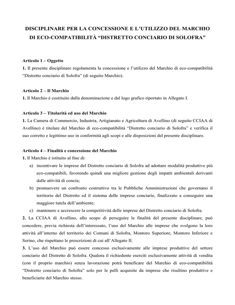 DISCIPLINARE PER LA CONCESSIONE E L’UTILIZZO DEL MARCHIO DI ECO-COMPATIBILITÀ “DISTRETTO CONCIARIO DI SOLOFRA” Articolo 1 – Oggetto 1. Il presente disciplinare regolamenta la concessione e l’utilizzo del Marchio di eco-compatibilità “Distretto conciario di Solofra” (di seguito Marchio). Articolo 2 – Il Marchio 1. Il Marchio è costituito dalla denominazione e dal logo grafico riportato in Allegato I. Articolo 3 – Titolarità ed uso del Marchio 1. La Camera di Commercio, Industria, Artigianato e Agricoltura di Avellino (di seguito CCIAA di Avellino) è titolare del Marchio di eco-compatibilità “Distretto conciario di Solofra” e verifica il suo corretto e legittimo uso in conformità agli scopi e alle disposizioni del presente disciplinare. Articolo 4 – Finalità e concessione del Marchio 1. Il Marchio è istituito al fine di: a) incentivare le imprese del Distretto conciario di Solofra ad adottare modalità produttive più eco-compatibili, favorendo quindi una migliore gestione degli impatti ambientali derivanti dalle attività di concia; b) promuovere un confronto costruttivo tra le Pubbliche Amministrazioni che governano il territorio del Distretto ed il sistema delle imprese conciarie, finalizzato a conseguire una maggiore tutela dell’ambiente; c) mantenere e accrescere la competitività delle imprese del Distretto conciario di Solofra. 2. La CCIAA di Avellino, allo scopo di perseguire le finalità del presente disciplinare, può concedere, previa richiesta dell’interessato, l’uso del Marchio alle imprese che svolgono la loro attività all’interno del territorio dei Comuni di Solofra, Montoro Superiore, Montoro Inferiore e Serino, che rispettano le prescrizioni di cui all’Allegato II. 3. L’uso del Marchio può essere concesso esclusivamente alle imprese produttive del settore conciario del Distretto di Solofra. Qualora il richiedente eserciti esclusivamente attività di vendita (con il proprio marchio) senza lavorazione potrà beneficare del Marchio di eco-compatibilità “Distretto conciario di Solofra” solo per le pelli acquisite da imprese che risultino produttive e beneficiarie del Marchio stesso. 4. La concessione non è cedibile a terzi. In caso di vendita dell’impresa la concessione viene trasferita alla nuova proprietà, previa presentazione alla CCIAA di Avellino di una nuova domanda di concessione secondo quanto stabilito dall’articolo 5. 5. L’uso della denominazione e del Marchio viene concesso gratuitamente e per periodi di tempo limitati secondo quanto stabilito dall’articolo 7, commi 3 e 5. 6. Il Marchio non può in nessun caso essere utilizzato prima della conclusione della procedura di ottenimento dello stesso, secondo le modalità previste dall’articolo 7. 7. In caso di uso non autorizzato del Marchio si applica quanto previsto dall’articolo 11. 8. In caso di mancato rinnovo della concessione d’uso del Marchio, questo deve essere rimosso da tutti i luoghi, supporti, materiali e prodotti identificati all’articolo 8. In caso di non ottemperanza a quanto previsto dal presente comma verranno avviate le procedure indicate all’articolo 11. Articolo 5 – Domanda 1. La concessione d’uso del Marchio può essere richiesta previa presentazione alla CCIAA di Avellino di una domanda, presentata dal legale rappresentante dell’impresa richiedente o da suo delegato, utilizzando il modello riportato nell’Allegato III. 2. Le domande dovranno essere inviate alla CCIAA di Avellino, Viale Cassitto 7, 83100 - Avellino. 3. La presentazione della domanda alla CCIAA di Avellino può avvenire: a) mediante spedizione postale a mezzo di raccomandata senza avviso di ricevimento; b) mediante consegna diretta alla sede della CCIAA stessa; c) tramite PEC da inviare a [email protected]. 4. La domanda dovrà essere spedita o consegnata in busta chiusa, sulla quale dovrà essere riportata la seguente dicitura: “Domanda per concessione d’uso del Marchio di eco-compatibilità Distretto conciario di Solofra”. Articolo 6 – Soggetti che possono richiedere la concessione per l’uso del Marchio 1. Possono richiedere la concessione per l’uso del Marchio le imprese, iscritte nel Registro delle Imprese della CCIAA di Avellino che rispondono ai requisiti di cui ai commi 2 e 3 dell’ articolo 4. 2. L’elenco delle imprese cui è stato concesso l’uso del Marchio e quello dei relativi prodotti è pubblico ed è consultabile nel Portale internet del Distretto di Solofra (www.distrettosolofra.com). Nel medesimo portale è disponibile e scaricabile copia integrale del presente disciplinare e dei relativi allegati, Tali documenti, in alternativa, possono essere richiesti anche in forma cartacea alla CCIAA di Avellino con spese di spedizione a cura del richiedente. 3. La CCIAA di Avellino entro il 31 gennaio di ogni anno predispone una relazione riferita all’anno precedente contenente: a) l’elenco aggiornato delle imprese di cui al comma 2; b) una valutazione sul perseguimento delle finalità di cui all’articolo 4, comma 1; c) eventuali problemi emersi nella concessione d’uso del Marchio, in particolare per le domande respinte; d) ogni altro elemento utile ad esercitare un’azione di monitoraggio, coordinamento e promozione dell’uso del Marchio; e) eventuali proposte operative per la corretta applicazione del presente disciplinare; f) eventuali proposte di revisione del presente disciplinare. 4. La CCIAA di Avellino sottopone la relazione di cui al comma 3 al Comitato Promotore per la realizzazione del Marchio di eco-compatibilità del Distretto di Solofra e per il conseguimento dell’attestazione APO EMAS distretto di Solofra (di seguito Comitato Promotore), istituito con il Protocollo d’Intesa del 15 maggio 2008, in occasione della prima riunione utile di tale Comitato. Articolo 7 – Rilascio della concessione 1. L’utilizzo del Marchio è concesso dalla CCIAA di Avellino con determinazione del Segretario Generale. 2. La co