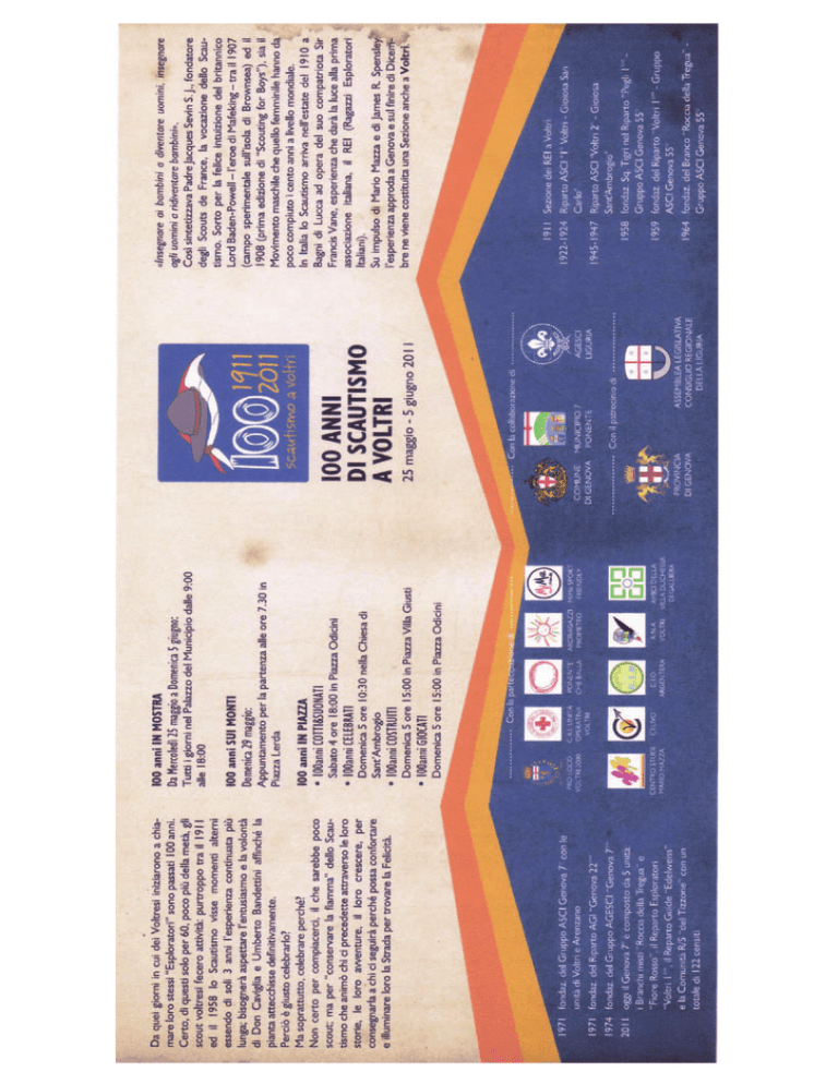 100 anni sui monti In occasione del 100° anniversario della fondazione dello Scoutismo a Voltri La comunità capi del Genova 7° ed il pattuglino propongono a scout, ex scout, genitori, parenti, amici, conoscenti ed al popolo tutto una “Camminata Scout” Attività di cammino all’aperto in tradizionale stile scout STANCHI DELLA SOLITA CAMMINATA DOVE L’UNICA COSA CHE CONTA E’ RAGGIUNGERE LA VETTA? VOLETE CONOSCERE MEGLIO IL TERRITORIO CHE CI CIRCONDA? VOLETE PROVARE A CAMMINARE IN GRUPPO, CHIACCHERANDO, OSSERVANDO, CANTANDO…E ALLORA VENITE A FESTEGGIARE I NOSTRI 100 ANNI AL PASSO DELLA GAVA! NEL MERAVIGLIOSO PARCO NATURALE REGIONALE DEL BEIGUA La camminata si sviluppa su 3 percorsi distinti di lunghezza e difficoltà crescente, con raduno finale al PASSO DELLA GAVA m.752 slm. Per esigenze organizzative ogni partecipante deciderà preventivamente quale percorso affrontare e lo comunicherà tramite Internet o telefono (vedi NOTA TECNICA IMPORTANTISSIMA più avanti) Appuntamento in Piazza Lerda dalle ore 7:30, partenza dalla Piazza ore 8:15. I partecipanti dei percorsi Lupetto ed Esploratore dovranno prendere il treno delle 8:30 per Arenzano, quindi dovranno essere già muniti di biglietto Trenitalia Voltri-Arenzano Percorso LUPETTO (facile, per tutti ma proprio tutti) Treno da Stazione di Voltri ore 8:30 per Arenzano, percorso a piedi fino alla località Curlo (con possibilità di navetta dalla stazione FS fino alla località Curlo per le persone con più difficoltà); arrivo a piedi al Passo della Gava Altitudine Percorso Lupetto KM (m) Arenzano FS 0 0 Località Curlo 2,44 321 Riparo Liseu 4,59 593 Passo della Gava 8,1 752 Percorso ESPLORATORE (più diretto ma più grintoso, occorre un po’ di allenamento) Treno da Stazione di Voltri ore 8:30 per Arenzano, percorso fino al Passo della Gava passando per il Bric dell’Olmo. Percorso Esploratore Arenzano FS Bric dell'Olmo P.so Tardia P.so della Gava KM 0 2,6 5,4 6,3 Altitudine (m) 0 301 860 752 Percorso ROVER (lungo e tosto, per gli sprinter della montagna) Voltri – Fabbriche – Sambuco – Rio Gava – Gava Percorso ROVER Voltri Fabbriche Sambuco Passo della Gava Altitudine (m) KM 0 5,1 8 11,5 0 155 416 752 Durante il percorso, per gli appassionati, potranno essere affrontate prove in classico stile SCOUT di : Orientamento Topografia Riconoscimento Tracce E sopra tutto …OSSERVAZIONE della natura e del paesaggio che ci circonda. Al passo della Gava ritrovo di tutti i partecipanti, feste, giochi, canti, discorsi e soprattutto ci sarà la possibilità di gustare una favolosa PASTASCIUTTA AL SUGO! (cucinata dalla Comunità Capi del GE7, anche questa, purtroppo, in classico stile scout) A seguire S.Messa presso il Passo della Gava Ritorno tutti insieme via Passo Tardie – Crevari entro le ore 18,00 Crevari –Voltri bus AMT n.96 ore 18,25 e 19,35 per i più stanchi (ricordare i biglietti!) Ritorno Passo della Gava P.so Tardia Bric Brigna Crevari Voltri KM 0 0,9 4,1 4,9 6,9 Altitudine (m) 752 860 462 217 0 Per chi non se la sente di affrontare la discesa verso Crevari (sentiero) c’è la possibilità di scendere per la strada che porta ad Arenzano passando per il Curlo. E se il tempo mette al brutto? Si va lo stesso, perché N.B.: Tuttavia in caso di condizioni climatiche particolarmente avverse la Camminata potrebbe essere rimandata. NOTA TECNICA IMPORTANTISSIMA La presentazione che state leggendo è stata diffusa tramite Internet (Facebook, e-mails etc) attraverso un passa-parola che speriamo possa raggiungere tutti i potenziali interessati e tra loro quanti nella propria storia hanno almeno una volta partecipato ad attività dello scoutismo voltrese. Vogliamo ritrovarci ma soprattutto vogliamo far conoscere a tanti amici e futuri amici questa bella avventura che portiamo con gioia tra le esperienze di una vita. Per far sì che tutto sia possibile senza spiacevoli disguidi organizzativi Vi preghiamo di PRENOTARVI lasciando sul portale http://www.facebook.com/GruppoGE7 (la pagina ufficiale del centenario: "100 anni si scautismo a Voltri") oppure con un SMS al numero di cellulare: 3496032616 1) 2) 3) Il vostro nome e cognome il numero delle persone che partecipano con voi (famiglia, compagnia di ragazzi, nonni al seguito, etc) – numero totale incluso chi prenota Il tipo di percoso scelto tra i tre, e soprattutto nel caso del percorso “lupetto” se avete bisogno del trasporto dalla stazione di Arenzano al Curlo Ciò ci permetterà di adeguare le risorse al numero dei partecipanti e dare, per quanto possiamo, un buon servizio di accoglienza. Cento (più o meno) righe di riflessione Perché la “Camminata Scout” per i 100 anni e non solo riunioni, conferenze, dibattiti, festeggiamenti, documentazione, pranzi, stand, costruzioni etc etc etc? Perché… “LO SCOUTISMO ENTRA DAI PIEDI” Da dove si comincia? I muscoli si tendono. Una gamba e' il pilastro che sostiene il corpo eretto tra cielo e terra. L'altra, un pendolo che oscilla da dietro. Il tallone tocca terra. Tutto il peso del corpo rolla in avanti sull'avampiede. L'alluce prende il largo, ed ecco, il peso del corpo, in delicato equilibrio, si sposta di nuovo. Le gambe si danno il cambio. Si parte con un passo, poi un altro e un altro ancora che, sommandosi come lievi colpi su un tamburo, formano un ritmo: il ritmo del camminare. La cosa piu' ovvia e piu' oscura del mondo e' questo camminare, che si smarrisce cosi' facilmente nella religione, la filosofia, il paesaggio, la politica urbana, l'anatomia, l'allegoria e il crepacuore. CAMMINARE Camminare e', idealmente, uno stato in cui la mente, il corpo e il mondo sono allineati come se fossero tre personaggi che finiscono per dialogare tra loro, tre note che improvvisamente formano un accordo. Camminare ci permette di essere nel nostro corpo e nel mondo senza esserne sopraffatti. Ci lascia liberi di pensare senza perderci totalmente nei pensieri. Camminare è fare un passo e poi un passo e ripetere questo semplice pass