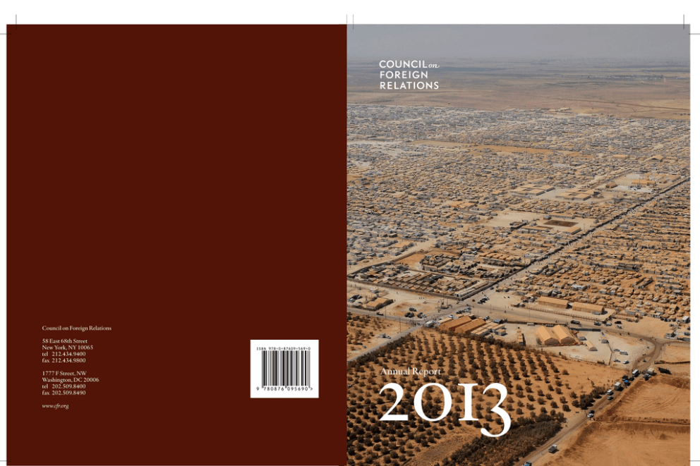 Council on Foreign Relations 58 East 68th Street New York, NY 10065 tel212.434.9400 fax212.434.9800 www.cfr.org 2013 Annual Report 3 1777 F Street, NW Washington, DC 20006 tel202.509.8400 fax202.509.8490 2013 Annual Report Annual Report July 1, 2012–June 30, 2013 Council on Foreign Relations 58 East 68th Street, New York, NY 10065 tel 212.434.9400 fax 212.434.9800 1777 F Street, NW, Washington, DC 20006 tel 202.509.8400 fax 202.509.8490 www.cfr.org [email protected] OF FI C E R S D IR ECT OR S Carla A. Hills Co-Chairman Robert E. Rubin Co-Chairman David M. Rubenstein Vice Chairman Richard N. Haass President Keith Olson Executive Vice President, Chief Financial Officer, and Treasurer James M. Lindsay Senior Vice President, Director of Studies, Maurice R. Greenberg Chair Nancy D. Bodurtha Vice President, Meetings and Membership Irina A. Faskianos Vice President, National Program and Outreach Suzanne E. Helm Vice President, Development Jan Mowder Hughes Vice President, Human Resources and Administration L. Camille Massey Vice President, Global Strategy and Programs Lisa Shields Vice President, Global Communications and Media Relations Lynda Hammes Publisher, Foreign Affairs Jeffrey A. Reinke Secretary of the Corporation Term Expiring 2014 Madeleine K. Albright David G. Bradley Donna J. Hrinak James W. Owens Frederick W. Smith Vin Weber Fareed Zakaria Term Expiring 2015 John P. Abizaid Peter Ackerman Mary McInnis Boies Tom Brokaw Martin S. Feldstein Pamela Brooks Gann David M. Rubenstein Term Expiring 2016 Steven A. Denning Ann M. Fudge Thomas H. Glocer Muhtar Kent Eduadro J. Padrón Colin L. Powell Christine Todd Whitman Term Expiring 2017 Stephen Friedman Peter B. Henry Carla A. Hills Jami Miscik Robert E. Rubin Margaret G. Warner Term Expiring 2018 Zoë Baird Alan S. Blinder R. Nicholas Burns Laurence D. Fink J. Tomilson Hill Shirley Ann Jackson Ruth Porat OFFICER S AN D D IR ECT O R S, EMER I T U S & H ONOR ARY Leslie H. Gelb President Emeritus Maurice R. Greenberg Honorary Vice Chairman Peter G. Peterson Chairman Emeritus David Rockefeller Honorary Chairman G LOBAL B OAR D OF ADV I SER S David M. Rubenstein Chair Mukesh Ambani Kofi Annan Hakeem Belo-Osagie Anatoly Chubais Paul Desmarais Jr. José Antonio Fernández Carbajal Tarja Halonen Mo Ibrahim Mohammed Jameel Gail Kelly Mustafa V. Koç Yorihiko Kojima Anand Mahindra Mohamed Mansour Christophe de Margerie Strive Masiyiwa Idan Ofer Lubna Olayan Vladimir Potanin Charles David Powell Paolo Scaroni Javier Solana Patrick Walujo Zhang Xin Richard N. Haass, ex officio Note: This list of Officers and Directors is current as of July 1, 2013. A historical roster of Directors and Officers can be found on pages 31–33. Contents 4 5 7 11 25 28 30 31 34 38 61 64 67 68 69 70 75 78 83 Mission Statement Letter from the Co-Chairs President’s Message 2013 Highlights Foreign Affairs Committees of the Board 2013 Board Election and Appointments Historical Roster of Directors and Officers Membership Membership Roster Corporate Members Endowed and Named Chairs, Fellowships, and Lectureships International Affairs Fellowship Program Global Board of Advisers Council of Councils By-Laws of the Council Rules, Guidelines, and Practices Staff Financial Statements Mission Statement The Council on Foreign Relations (CFR) is an independent, nonpartisan membership organization, think tank, and publisher dedicated to being a resource for its members, government officials, business executives, journalists, educators and students, civic and religious leaders, and other interested citizens in order to help them better understand the world and the foreign policy choices facing the United States and other countries. Founded in 1921, CFR takes no institutional positions on matters of policy. CFR carries out its mission by ■■ ■■ ■■ ■■ ■■ ■■ maintaining a diverse membership, with special programs to promote interest and develop expertise in the next generation of foreign policy leaders; convening meetings at its headquarters in New York and in Washington, DC, and other cities where senior government officials, members of Congress, global leaders, and prominent thinkers come together with CFR members to discuss and debate major international issues; supporting a Studies Program that fosters independent research, enabling CFR scholars to produce articles, reports, and books and hold roundtables that analyze foreign policy issues and make concrete policy recommendations; publishing Foreign Affairs, the preeminent journal on international affairs and U.S. foreign policy; sponsoring Independent Task Forces that produce reports with both findings and policy prescriptions on the most important foreign policy topics; and providing up-to-date information and analysis about world events and American foreign policy on its website, CFR.org. Mission Statement 4 Letter from the Co-Chairs Since 1921, the Council on Foreign Relations has sought, in the words of its founders, to “afford a continuous conference on international questions affecting the United States, by bringing together experts on statecraft, finance, industry, education, and science.” Under the leadership of Senior Vice President James M. Lindsay, CFR’s David Rockefeller Studies Program has expanded its intellectual agenda to stay true to its guiding principles and ahead of emerging international issues. In keeping with CFR’s mission, the think tank has evolved into a twenty-first-century incubator of ideas poised to address the most significant challenges facing the United States and the world today. More than seventy full-time, visiting, and adjunct fellows cover major geographical regions and issues. CFR scholars provide fresh thinking and concrete recommendations to officials at all levels of government, who consistently turn to CFR to inform their decision-making. CFR’s International Institutions and Global Governance (IIGG) program, directed by Senior Fellow Stewart M. Patrick, exe