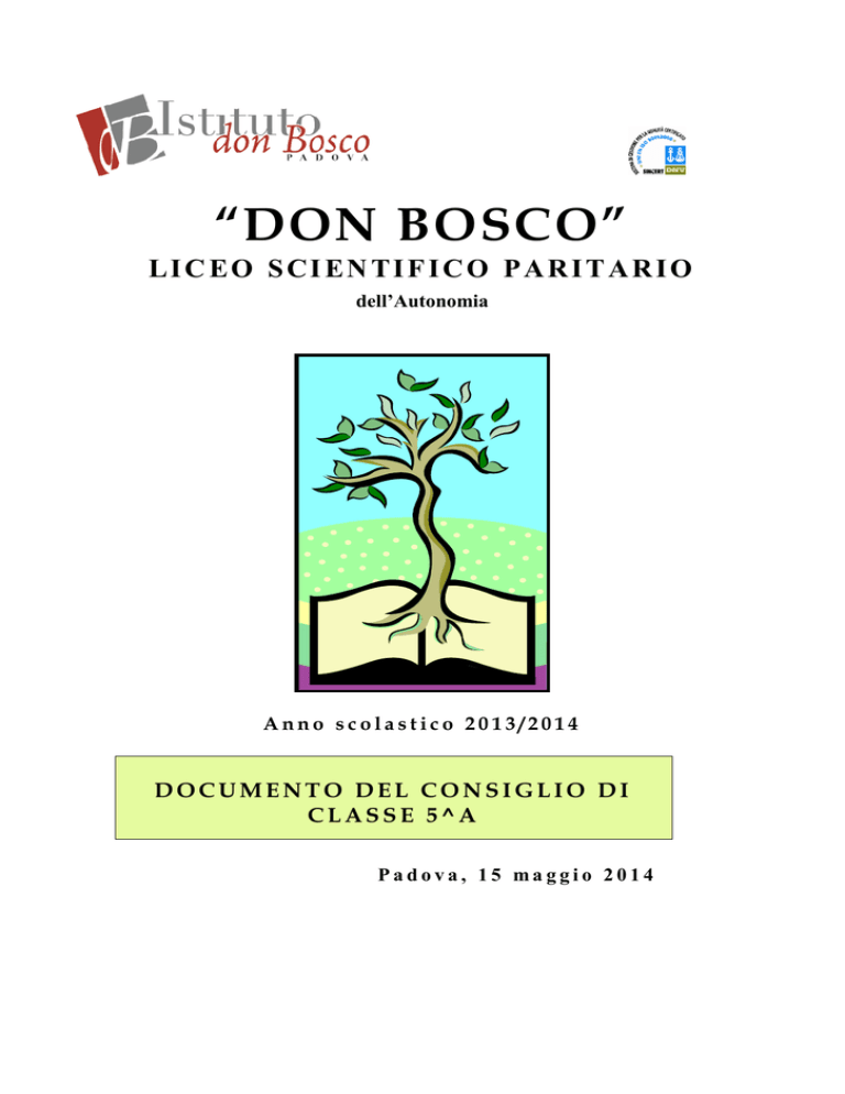 “DON BOSCO” LICEO SCIENTIFICO PARITARIO dell’Autonomia Anno scolastico 2013/2014 DOCUMENTO DEL CONSIGLIO DI CLASSE 5^A Padova, 15 maggio 2014 INDICE 1. INFORMAZIONI GENERALI ......................................................................................................... 1 1.1 CARATTERISTICHE GENERALI DELLA SCUOLA ....................................................................................... 1 1.2 SPAZI E ATTREZZATURE .................................................................................................................................. 1 1.3 EVOLUZIONE DELLA COMPOSIZIONE DELLA CLASSE NEL TRIENNIO ............................................ 2 1.4 EVOLUZIONE DEL CONSIGLIO DI CLASSE NEL TRIENNIO .................................................................... 3 1.5 PROFILO DELLA CLASSE 5^ A ......................................................................................................................... 4 2. ATTIVITÀ COLLEGIALE................................................................................................................ 5 2.1 IL LICEO SCIENTIFICO: PROFILO DELL’INDIRIZZO .................................................................................. 5 2.2 AREE DISCIPLINARI. RIPARTIZIONE DELLE MATERIE .......................................................................... 6 2.3 QUADRO ORARIO SETTIMANALE NEL TRIENNIO ..................................................................................... 7 3. ATTIVITÀ INTEGRATIVE CURRICOLARI E DI INDIRIZZO ................................................... 7 3.1 A NNO SCOLASTICO 2011/2012 (TERZO ANNO ).................................................................................................... 7 3.2 A NNO SCOLASTICO 2012/2013 (QUARTO ANNO ) .................................................................................................. 8 3.3 ANNO SCOLASTICO 2013/2014 (QUINTO ANNO) ....................................................................................................... 8 3.4. STAGES ESTIVI 2012/2013 ................................................................................................................................. 9 4. IL CREDITO FORMATIVO ............................................................................................................ 9 4.1 CRITERI GENERALI PER L’ATTRIBUZIONE DEL CREDITO FORMATIVO ............................................... 9 4.2 TIPOLOGIA DI ATTIVITà PER LE QUALI È STATO ASSEGNATO IL CREDITO: ...................................... 9 5. PROVE REALIZZATE DURANTE L’ANNO IN PREPARAZIONE ALL’ESAME DI STATO 2014..................................................................................................................................................... 10 5.1 PRIMA PROVA E CRITERI DI VALUTAZIONE................................................................................................ 10 5.2 SECONDA PROVA E CRITERI DI VALUTAZIONE ........................................................................................ 15 5.3 TERZA PROVA...................................................................................................................................................... 17 5.4 TABELLA DI EQUIVALENZA DEI VOTI NELLA TERZA PROVA ................................................................. 18 6.ARGOMENTI DI APPROFONDIMENTO PER IL COLLOQUIO ORALE.............................. 18 6.1 PREMESSA ALLA TABELLA RIASSUNTIVA ................................................................................................... 18 6.2 APPROFONDIMENTI – TABELLA RIASSUNTIVA.......................................................................................... 19 7. PERCORSI DISCIPLINARI ......................................................................................................... 21 8. ALLEGATI ...................................................................................................................................... 55 8.1 TRACCE DI SIMULAZIONE DI TERZA PROVA E GRIGLIE DI VALUTAZIONE ....................................... 55 8.2 GRIGLIA DI VALUTAZIONE DEL COLLOQUIO (PROPOSTA) .................................................................... 58 8.3 PERCORSO INDIVIDUALIZZATO DI LINGUA E LETTERATURA SPAGNOLA ........................................ 59 8.4 L’ORGANO DI VALUTAZIONE DELLA CLASSE 5 ^A .................................................................................... 60 1. INFORMAZIONI GENERALI 1.1 CARATTERISTICHE GENERALI DELLA SCUOLA L’Istituto “Don Bosco” opera nel territorio padovano attraverso una molteplicità di proposte scolastiche che coprono i vari gradi dell’istruzione: scuola dell’infanzia, primaria, media e superiore con tre indirizzi . La qualità dell’istruzione e dell’educazione offerta nei vari gradi scolastici passa attraverso precisi ambiti: a) la comunità scolastica e formativa b) i processi di insegnamento e apprendimento c) l’ambiente. La scuola è strutturata in forma unitaria e realizza un modello comunitario di educazione, di organizzazione e di amministrazione. Il progetto culturale della scuola intende rientrare nel servizio pubblico e nello stesso tempo non si esaurisce in programmi o indicazioni ministeriali. In esso persone, spazio, tempo, rapporti, insegnamento, studio, ricerca, attività diverse sono in funzione della persona dell’alunno e dei suoi bisogni formativi. La scuola “Don Bosco” ha conseguito il certificato per il sistema di gestione della qualità dei processi di progettazione, programmazione e attuazione del servizio educativo, secondo le norme UNI EN ISO 9001:2008. Il certificato è stato rilasciato dalla fondazione internazionale indipendente Det Norske Veritas (DNV) e in data 24 aprile 2014 è avvenuta la ricertificazione. La scuola superiore di secondo grado si articola, ancora per le classi Quinte, in tre indirizzi: Liceo Scientifico sperimentale, progetto “Aretusa”, indirizzo 