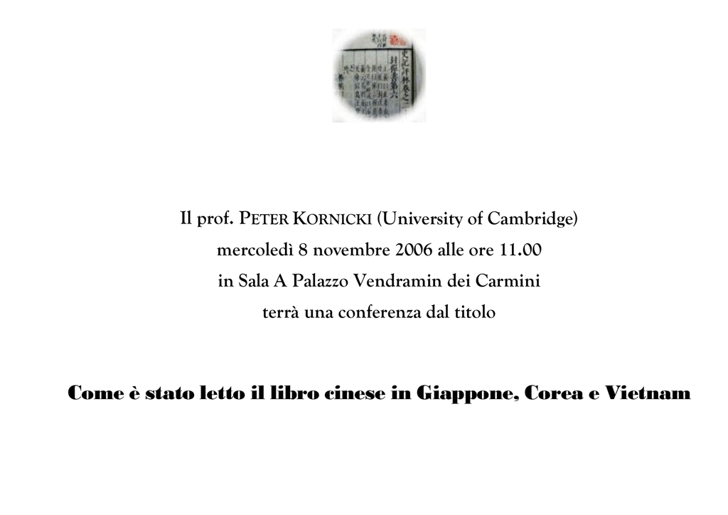 Il prof. PETER KORNICKI (University of Cambridge) mercoledì 8 novembre 2006 alle ore 11.00 in Sala A Palazzo Vendramin dei Carmini terrà una conferenza dal titolo Come è stato letto il libro cinese in Giappone, Corea e Vietnam