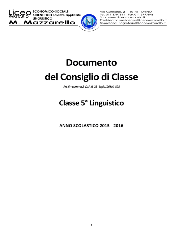 Documento delConsigliodiClasse Art.5–comma2-D.P.R.23luglio1998N.323 Classe5°Linguistico ANNOSCOLASTICO2015-2016 1 Indice Indice pag.2 Lascuola pag.3 Orientamentiideali pag.5 IlLiceoLinguistico pag.6 IlPianodiStudi pag.7 LaClasse pag.10 PresentazionedellaClasse pag.12 Idocenti pag.14 VerificaeValutazione pag.15 Attività pag.16 Simulazionedellaproved’Esame pag.18 Valutazione pag.19 TipologiadelleproveeAttivitàdirecupero pag.21 Approfondimentid’Esame pag.22 Grigliedivalutazione pag.24 Pei,Bes pag.34 Programmidellesingolediscipline pag.36 Fogliofirme pag. Copiadelverbaledelloscrutiniofinale allegato1. Testidelleprovedisimulazione allegato2 Certificazionilinguisticheacquisite allegato3 2 Lascuola estrattodalPTOF2015-‘18 Unpo’distoria LaScuolaSuperiore“MadreMazzarello”,chedal1924offre,inTorino,unservizioformativo–culturalealla gioventù, si qualifica come un’esperienza educativa dell’Istituto delle Figlie di Maria Ausiliatrice che realizza,nellaChiesaenellasocietà,unprogettodieducazionecristiananellostiledelsistemapreventivodi DonBosco. Fin dall’inizio l’Opera si rivolse alla popolazione delle fasce meno abbienti, con laboratori di sartoria e ricamo per l’apprendistato delle ragazze che, secondo la legislazione allora vigente, potevano essere assunteallavoroa12anni;conunascuolamaternaperassistereibambinidellefamiglieoperaie;concorsi seraliacarattereprofessionale(camiceriamaschile,sbalzodipelleemetallo,economiadomestica…). Nell’anno 1931 ha inizio la Scuola Magistrale, che ha il merito di aver formato le insegnanti di tutte le ScuoleMaternediTorino,convaliditàriconosciutadallecompetentiAutoritàcittadine. Nel1935,conl’avviodellacostruzionediunnuovocomplessoscolastico,sidàinizioallaScuolaElementare edall’AvviamentoProfessionale,chenel1962sitrasformainScuolaMediaUnica. Nel1947unanuovaformadiIstruzioneProfessionale,conundupliceprogrammaculturaleeprofessionale con un apprendistato in ditta, porta all’avvio della Scuola Aziendale di Sartoria Maschile, frequentata da una popolazione di profughe prima e immigrate poi, che, dopo tre anni di frequenza, venivano assunte dalladittaMarus. Nel 1953viene aperto l’Istituto Professionale femminile per l’abbigliamento, primo in Italia, mentre dieci annidopoilMagisteroProfessionaleperlaDonnavienetrasformatoinIstitutoTecnicoFemminile. Nel 1966, in occasione della consegna della Medaglia d’oro da parte del ministro Oscar Luigi Scalfaro, l’Istituto si presenta come un complesso comprendente: Scuola Materna, Scuola Elementare, Scuola di Avviamento Professionale, Nuova Scuola Media, Scuola Magistrale, Istituto Professionale per l‟abbigliamento, Istituto Tecnico Femminile, Corsi serali (taglio, sartoria, camiceria, ricamo, economia domestica,infermieristicafamiliare,dattilografia,stenografia,francese,inglese). Èaffiancatodaunvastocomplessodioperesocialigiovaniliacarattereculturale,conunbacinodiutenza chevabenoltreiconfinidelborgo. Dal1973,datoilnumeroelevatodiattivitàediutenza,leFigliediMariaAusiliatricedecidonodicostituire dueplessiscolasticieducativi. All’ingresso n.14 si trovano la Scuola Elementare Parificata e la Scuola Media Legalmente riconosciuta, mentrealn.2laScuolaMaterna,laScuolaMagistraleel’IstitutoTecnicoFemminile. Nel1977,conD.M.15/09/1977,siavvialaSperimentazionenelBienniodell’IstitutoTecnico,comprendente treindirizzi:Pedagogico–sociale,Linguistico–commerciale,Socio–sanitario. Nel 1992 l’Istituto Tecnico Femminile viene sostituito da due licei: il Liceo Linguistico Europeo e il Liceo ScientificoBiologico. Nel1996vieneaggiornatoilprogettodelLiceobiologico. Nel1998prendeavvioilLiceodellaComunicazione,conopzionebeniculturaliesociale. Nel 2003 viene aggiunta al Liceo della Comunicazione l’opzione “Civiltà comparate”, che si conclude nel luglio2008. 3 Nel 2010, in conformità con le indicazioni della legge 133 del 06/08/2008, si avviano le classi prime del Liceo Scientifico opzione scienze applicate, del Liceo Linguistico, del Liceo delle Scienze Umane opzione economico-sociale. Identitàeterritorio LaScuola“MadreMazzarello”desidera,conilPianodell’OffertaFormativa(DPR8marzo1999),definirela propriaidentitàculturale,icriteridiprogettazionecurricolareedextracurricolare,gliitinerarieducativied organizzativi.IlPOFèrispostaadesigenzedellasocietàdioggi,edèpropostaperlaformazionedionesti cittadini,inarmoniaconiprincipidellaCostituzioneItalianaesecondol’affermataecollaudatatradizione educativasalesiana. LetrasformazioniinattonellasocietàtorineseinterpellanolaComunitàEducanteelarendonoattentaal futuro delle giovani generazioni, che incrociano flussi migratori e che maturano una formazione di tipo internazionale,almenocomeesigenzaecomesensibilità. Anche la riforma universitaria richiede alla Scuola di creare col post-secondario reti più articolate e più miratenegliobiettivienellaprassidell’Orientamento. 4 Orientamentiideali estrattodalPTOF2015-‘18 Noi educatori, religiosi e laici, di questa scuola, ci sentiamo parte viva di un patrimonio educativo e culturale che ha la sua sorgente in Don Bosco e in Madre Mazzarello ed è caratterizzato dalla scelta di educareigiovanisecondounaprecisafinalità:aiutarliadiventare“buonicristianiedonesticittadini”. È questa una prospettiva di educazione integrale in cui la fede è l’orizzonte che dà significato all’attività educativaelavitadelgiovaneèilpercorsoquotidianoincuisiincarnaesirendecredibilelafede. La linea concreta che qualifica il nostro progetto educativo consiste nell’offrire ai giovani esperienze positivecapacidirisvegliareecoinvolgeretuttelelororisorse. L’esperienzafondamentaleequalificanteèl’attivitàculturalechematuralefacoltàintellettuali,sviluppala capacitàdigiudiziocritico,metteacontattocolpatrimonioacquistatodallepassategenerazioni,promuove ilsensodeivaloriepreparaallavitaprofessionale. Inquestadirezioneoperiamoalcunesceltedifondoattintedalsistemapreventivosalesiano: - ci riferiamo, in modo esplicito e