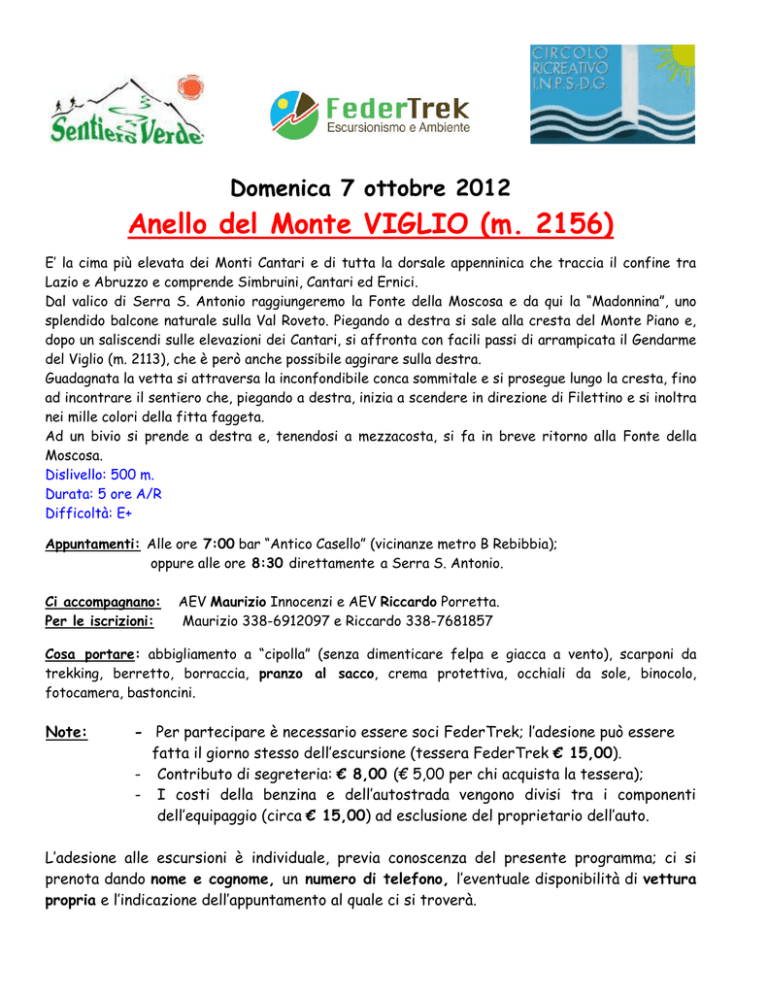 Domenica 7 ottobre 2012 Anello del Monte VIGLIO (m. 2156) E’ la cima più elevata dei Monti Cantari e di tutta la dorsale appenninica che traccia il confine tra Lazio e Abruzzo e comprende Simbruini, Cantari ed Ernici. Dal valico di Serra S. Antonio raggiungeremo la Fonte della Moscosa e da qui la “Madonnina”, uno splendido balcone naturale sulla Val Roveto. Piegando a destra si sale alla cresta del Monte Piano e, dopo un saliscendi sulle elevazioni dei Cantari, si affronta con facili passi di arrampicata il Gendarme del Viglio (m. 2113), che è però anche possibile aggirare sulla destra. Guadagnata la vetta si attraversa la inconfondibile conca sommitale e si prosegue lungo la cresta, fino ad incontrare il sentiero che, piegando a destra, inizia a scendere in direzione di Filettino e si inoltra nei mille colori della fitta faggeta. Ad un bivio si prende a destra e, tenendosi a mezzacosta, si fa in breve ritorno alla Fonte della Moscosa. Dislivello: 500 m. Durata: 5 ore A/R Difficoltà: E+ Appuntamenti: Alle ore 7:00 bar “Antico Casello” (vicinanze metro B Rebibbia); oppure alle ore 8:30 direttamente a Serra S. Antonio. Ci accompagnano: Per le iscrizioni: AEV Maurizio Innocenzi e AEV Riccardo Porretta. Maurizio 338-6912097 e Riccardo 338-7681857 Cosa portare: abbigliamento a “cipolla” (senza dimenticare felpa e giacca a vento), scarponi da trekking, berretto, borraccia, pranzo al sacco, crema protettiva, occhiali da sole, binocolo, fotocamera, bastoncini. Note: - Per partecipare è necessario essere soci FederTrek; l’adesione può essere fatta il giorno stesso dell’escursione (tessera FederTrek € 15,00). - Contributo di segreteria: € 8,00 (€ 5,00 per chi acquista la tessera); - I costi della benzina e dell’autostrada vengono divisi tra i componenti dell’equipaggio (circa € 15,00) ad esclusione del proprietario dell’auto. L’adesione alle escursioni è individuale, previa conoscenza del presente programma; ci si prenota dando nome e cognome, un numero di telefono, l’eventuale disponibilità di vettura propria e l’indicazione dell’appuntamento al quale ci si troverà.