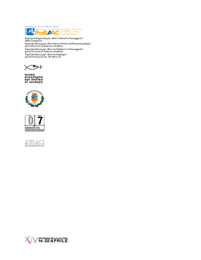 Direzione Regionale per i Beni Culturali e Paesaggistici della Campania Soprintendenza per i Beni Storici Artistici ed Etnoantropologici per le Province di Salerno e Avellino Soprintendenza per i Beni Architettonici e Paesaggistici per le Province di Salerno e Avellino Soprintendenza per i Beni Archeologici per le Province di SA, AV, BN e CE ASSOCIAZIONE DEI MUSEI D’ARTE C O N T E M P O R A N E A I TA L I A N I DOOR TO DOOR UN PROGETTO DI ARTE URBANA PER IL CENTRO STORICO DI SALERNO A cura di Maura Picciau con Ilaria Tamburro Door to Door Un progetto d’arte contemporanea per il centro storico di Salerno Salerno, 8 e 9 ottobre 2011 VII Giornata del Contemporaneo Ideazione Maura Picciau A cura di Maria Giovanna Sessa Apparati Critici Renata Caragliano Raffaele D’Andria Maura Picciau Maria Giovanna Sessa Stefania Zuliani Schede Storiche Ilaria Tamburro Segreteria Organizzativa Rosa Carafa e Ilaria Tamburro Segreteria Amministrativa Claudio Ragosta Anna De Vivo Allestimento Gaetano Cantiello Raffaele Cantiello Vito De Nicola Supporto tecnico Dielle impianti Ditta Ronga Opera Design Documentazione fotografica Giovanni Mogavero Nicola Palma Giuseppe Durante Progetto Grafico Giuseppe Durante Ufficio Stampa Paolo Romano Un sincero ringraziamento a: Vito Avino Fabiola Casilli Alberto Ciriello Don Mario D’Elia Tiziana De Crescenzo Maurizio De Gemmis Giuseppe De Rosa Valentina De Rosa Francesco Felaco Antonio Maria Florio Vincenzo Frattini Galleria Tiziana Di Caro Galleria LeggermenteFuoriFuoco Galleria Paola Verrengia Emanuela Garrone Giuseppe Giacumbi Antonio Giannetti Anna Gigante Maria Pia Incutti (Fondazione Plart) Luciana Iosca Rita Lioi Cristina Masturzo Luciano Mauro Lilly Memmolo Claudio Naddeo Mario Paolucci Giovanna Sacco Pasquale Siano Angelo Trimarco (Fondazione Filiberto Menna) Sandra Tucci ome la Storia, l’Arte non si ferma davanti ai portoni dei luoghi canonici deputati ad accoglierla, non è relegata nei musei, entra nelle case, nei vicoli, permea di sé il tessuto urbano e diventa vissuto, oltre le stratificazioni tradizionali. Per questo, devo dire che ho apprezzato molto, oltre alla validità in sé del programma, lo spirito di fondo che ha animato “Door to door”. E’ stato bello assistere ad un felice matrimonio, a Salerno, tra l’arte contemporanea e i maggiori siti d’interesse del centro storico. La manifestazione, ideata dalla Soprintendenza ai Bsae di Salerno e Avellino e patrocinata dal Comune di Salerno, ha portato in città giovani artisti di respiro internazionale, dando forza al progetto, da sempre perseguito da questa Amministrazione, di inserire la città in una più ampia prospettiva europea, sia in termini culturali che urbanistici. Con “Door to door”, abbiamo “vissuto” quadri d’arte partecipata, dinamica. Dalle installazioni alla video-arte, i progetti artistici presentati - e spesso concepiti come unicum per Salerno hanno coinvolto i partecipanti in un naturale processo di empatia con lo spirito dei luoghi ed hanno animato il tessuto urbano, realizzando una felice interazione tra opera e spettatore. Penso che la manifestazione abbia aiutato a diffondere, più di mille parole, l’amore per l’arte e per il territorio, in un necessario biunivoco rapporto tra i due partner. Giardini, androni, corti, piazze, scale, interni si sono trasformati con “Door to door” in accoglienti spazi da vivere. Mi piace sottolineare, infine, la sincera ed efficace sinergia che si è creata per il progetto: la Soprintendenza, il Comune, le gallerie d’arte private, fino ad arrivare ai condòmini ed gli amministratori dei palazzi. L’auspicio è che tutto ciò possa ripetersi ancora e che l’evento possa diventare magari un appuntamento fisso da inserire tra gli appuntamenti salernitani. C L Ermanno Guerra Direttore Servizio architettura e arte contemporanee Direzione Generale per il paesaggio, le belle arti, l’architettura e l’arte contemporanee Ministero per i beni le attività culturali a promozione, il sostegno e la valorizzazione dell’arte e dell’architettura contemporanee in rapporto con il territorio e con il paesaggio è una delle attività cardine della Direzione Generale per il paesaggio, le belle arti, l’architettura e l’arte contemporanee del Ministero per i beni e le attività culturali, che ha come principale strumento finanziario per tali finalità il Piano per l’arte contemporanea di cui si avvalgono gli istituti periferici del Ministero, anche in collaborazione con altri istituti. Nel corso del 2011 si è rivolta una particolare attenzione alle realtà più consolidate ma anche emergenti che operano nell’arte contemporanea nel Sud Italia. In quest’ottica, Door to Door è un progetto che la Direzione Generale ha ritenuto di grande interesse culturale, e che ha voluto sostenere con il proprio contributo, rappresentando inoltre un esempio di virtuosa e fruttuosa collaborazione tra le istituzioni a favore dell’arte contemporanea e di un territorio quale quello salernitano ricco di storia, cultura e vivacità intellettuale. L’arte contemporanea, attraverso le sue molteplici modalità espressive, si pone in contatto con l’ambiente circostante e il territorio valorizzandolo e valorizzandosi a propria volta. Arte antica e arte contemporanea sono oramai un connubio sempre più presente nel panorama espositivo odierno. Così, anche i centri storici delle città accolgono opere d’arte contemporanea che si inseriscono nel contesto urbano, arricchendolo di suggestioni e di inedite prospettive. L’iniziativa, particolarmente articolata, inserita nell’ambito della VII Giornata del contemporaneo, anch’essa sostenuta dal Ministero per i beni e le attività culturali, ha inoltre dato l’avvio a una serie di progetti che prevedono uno sviluppo ulteriore in futuro, per una sempre più intensa azione di sostegno all’offerta culturale del territorio. Ufficio Comunicazione Antonella Cucciniello Maria Grazia Bellisario Asses
