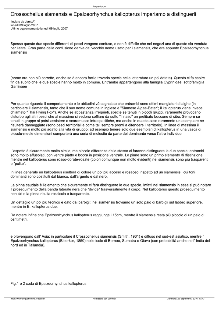 Acquariforum Crossocheilus siamensis e Epalzeorhynchus kallopterus impariamo a distinguerli Inviato da Jambè lunedì 09 luglio 2007 Ultimo aggiornamento lunedì 09 luglio 2007 Spesso queste due specie differenti di pesci vengono confuse, e non è difficile che nei negozi una di queste sia venduta per l'altra. Gran parte della confusione deriva dal vecchio nome usato per i siamensis, che era appunto Epalzeorhynchus siamensis (nome ora non più corretto, anche se è ancora facile trovarlo specie nella letteratura un po' datata). Questo ci fa capire fin da subito che le due specie hanno molto in comune. Entrambe appartengono alla famiglia Cyprinidae, sottofamiglia Garrinaee Per quanto riguarda il comportamento e le abitudini và segnalato che entrambi sono ottimi mangiatori di alghe (in particolare il siamensis, tanto che il suo nome comune in inglese è "Siamese Algae-Eater"; il kallopterus viene invece chiamato "Thai Flying Fox"). Anche se abbastanza irrequieti, specie se tenuti in piccoli gruppi, raramente provocano disturbo agli altri pesci che al massimo si vedono soffiare da sotto "il naso" un prelibato boccone di cibo. Sempre se tenuti in gruppo si potrà assistere a scaramucce intraspecifiche, ma anche in questo caso raramente un esemplare ne risulterà danneggiato (sono pesci territoriali e come tali sempre pronti a difendere il territorio). In linea di massima il siamensis è molto più adatto alla vita di gruppo: ad esempio tenere solo due esemplari di kallopterus in una vasca di piccole-medie dimensioni comporterà una seria di molestie da parte del dominante verso l'altro individuo. L'aspetto è sicuramente molto simile, ma piccole differenze dello stesso ci faranno distinguere le due specie: entrambi sono molto affusolati, con ventre piatto e bocca in posizione ventrale. Le pinne sono un primo elemento di distinzione: mentre nel kallopterus sono rosso-dorate-rosate (colori comunque non molto evidenti) nel siamensis sono più trasparenti e "pulite". In linea generale un kallopterus risulterà di colore un po' più acceso e rosaceo, rispetto ad un siamensis i cui toni dominanti sono costituiti dal bianco, dall'argento e dal nero. La pinna caudale è l'elemento che sicuramente ci farà distinguere le due specie. Infatti nel siamensis in essa si può notare il proseguimento della banda laterale nera che "divide" trasversalmente il corpo. Nel kallopterus questo proseguimento non c'è e la pinna risulta rossiccia e trasparente. Un dettaglio un po' più tecnico è dato dai barbigli: nel siamensis troviamo un solo paio di barbigli sul labbro superiore, mentre in E. kallopterus due. Da notare infine che Epalzeorhynchus kallopterus raggiunge i 15cm, mentre il siamensis resta più piccolo di un paio di centimetri. e provengono dall' Asia: in particolare il Crossocheilus siamensis (Smith, 1931) è diffuso nel sud-est asiatico, mentre l' Epalzeorhynchus kallopterus (Bleerker, 1850) nelle isole di Borneo, Sumatra e Giava (con probabilità anche nell' India del nord ed in Tailandia). Fig.1 e 2 coda di Epalzeorhynchus kallopterus http://www.acquarionline.it/acquari Realizzata con Joomla! Generata: 29 September, 2016, 17:43 Acquariforum Fig.3 coda di Crossocheilus siamensis Ora qualche foto.... Crossocheilus siamensis foto fornite da www.craigcentral.com foto fornite da www.craigcentral.com foto fornite da www.craigcentral.com foto fornite da www.craigcentral.com foto di MauNic Epalzeorhynchus kallopterus foto fornita da www.disky-design.dk/fish foto di theGIO http://www.acquarionline.it/acquari Realizzata con Joomla! Generata: 29 September, 2016, 17:43 Acquariforum foto di theGIO Qualche nota sull'allevamento Entrambi i pesci amano acqua leggermente acida, tenera, ben ossigenata. Sarebbe opportuno effettuare regolarmente i cambi parziali. Temperature ideali comprese tra 24 e 26°C. Comunque và anche segnalata la robustezza di questi pesci (personalmente la posso notare in Epalzeorhynchus kallopterus) che li porta ad adattarsi bene anche a bruschi interventi in vasca od a valori diversi da quelli ottimali. Si possono anche considerare onnivori: se infatti è vero che sono tra i migliori mangiatori d'alghe attualmente disponibili per il mercato acquariofilo (penso infatti che il siamensis sia un'ospite fisso e molto importante nel'equilibrio di una vasca "olandese") queste due specie non disdegnano nemmeno cibo vivo, liofilizzato, surgelato, in scaglie o granulare! Si potrà inoltre integrare la dieta (sopratutto se per vostra fortuna le alghe in vasca scarseggeranno!!) con qualche pezzo di lattuga, spinacio o zucchina sbollentati. Il siamensis si nutre inoltre delle alghe filamentose. Allevabili in acquari di comunità è comunque importante avere molte piante e rifugi nella vasca. Date le dimensioni che raggiungono in breve tempo sarebbe utile avere almeno 80litri di volume per esemplare. Sono pesci di fondo che però amano riposarsi appoggiati su foglie di grande piante. In entrambi il dimorfismo sessuale non è riscontrabile e la riproduzione in acquario sembra non essere ancora stata realizzata. Bibliografia: Dick Mills, Guida illustrata dei pesci d'acquario, Vallardi industri grafiche, Milano 1989 Rüdiger Riehl e Hans A. Baensch., Atlante di aquarium, Mergus http://www.craigcentral.com http://www.disky-design.dk/fish www.notcatfish.com Di Davide Robustelli (22-11-2002) http://www.acquarionline.it/acquari Realizzata con Joomla! Generata: 29 September, 2016, 17:43