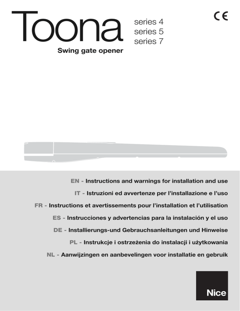 Toona series 4 series 5 series 7 Swing gate opener EN - Instructions and warnings for installation and use IT - Istruzioni ed avvertenze per l’installazione e l’uso FR - Instructions et avertissements pour l’installation et l’utilisation ES - Instrucciones y advertencias para la instalación y el uso DE - Installierungs-und Gebrauchsanleitungen und Hinweise PL - Instrukcje i ostrzeżenia do instalacji i użytkowania NL - Aanwijzingen en aanbevelingen voor installatie en gebruik 2 DESCRIPTION OF THE PRODUCT AND ENVISAGED USE EN ENGLISH This product has been designed to automate gates or doors with leaf opening, for residential or industrial use. CAUTION! – Any other use different to that described and in ambient conditions different to those set out in this manual is to be considered improper and forbidden! The product is an electromechanical gear motor, equipped with a 24 v continuous current or 230V (depending on the model) alternate current motor and an endless screw reduction gear. The gear motor is powered by the external control unit to which it is connected. In the event of a black out, it is possible to move the gate leaves by hand, unblocking the gear motor manually. Fig. 1 shows all the components provided in the package (according to the model chosen): [a] - electromechanical gear motor [b] - front bracket (for fixing the gear motor to the gate leaf) [c] - rear bracket and plate (for fixing the gear motor to the wall) [d] - metal parts (screws, washers, etc.) [e] - keys to manually unlock the gear motor 1 GENERAL SAFETY WARNINGS AND PRECAUTIONS 3 INSTALLATION Safety warnings 3.1 - Checks before installation • CAUTION! - This manual contains important instructions and warnings for personal safety. Wrong installation can cause serious injuries. Before starting work read all the manual carefully. If in doubt, stop installation and ask the Nice Assistance Department for clarifications. Before installation, check the integrity of the components, suitability of the model chosen and suitability of the environment chosen for the installation. IMPORTANT – The gear motor cannot automate a manual gate which does not have a safe and efficient mechanical structure. Furthermore, it cannot solve the faults caused by wrong installation or bad maintenance of the gate itself. • CAUTION! – According to the most recent European legislation, the realisation of an automatic door or gate must comply with the regulations of Directive 98/37/CE (Machine Directive) and in particular, standards EN 12445; EN 12543; EN 12635 and EN 13214-1, which declare the presumed conformity of the automation. In consideration of this, all the installation, connection, inspection and maintenance operations of the product must be performed exclusively by a qualified and competent technician! • CAUTION! – Important instructions: keep this manual for any possible future requirement for maintenance and disposal of the product. Warnings for installation • Before installing check if this product is suited to automating your gate or door (see chapter 3 and “Technical features of the product”). If unsuitable, DO NOT proceed with the installation. • Include a disconnection device in the power supply system with an opening distance between the contacts to permit full disconnection in the conditions dictated by the category of surcharge III. • All the installation and maintenance operations must occur with the automation disconnected from the electrical power supply. If the disconnection device of the power supply is not visible from the area where the automatism is located, before starting the work it is necessary to attach a sign with the text “CAUTION! MAINTENANCE IN PROGRESS” on the disconnection device. • During installation handle the automatism with care avoiding crushing, knocks, falls or contact with liquids of any kind. Do not place the product near sources of heat, or expose it to naked flames. All these activities can damage and cause malfunctions or dangerous situations. If this occurs, stop the installation immediately and contact the Nice Assistance Department. • Do not make alterations to any part of the product. Operations which are not permitted will cause only malfunctions. The manufacturer declines any liability for damage caused by arbitrary alterations to the product. • If the gate or the door to be automated is fitted with a pedestrian door it is necessary to include a control system in the installation to prevent the operation of the motor when the pedestrian door is open. • Check there are no trapping points towards fixed parts when the leaf of the gate is in the maximum Open position, if necessary protect these parts. • The push button control on the wall must be positioned in sight of the automation, away from the moving parts, at a minimum height of 1.5 m from the ground and it must not be accessible to the public. • The product packaging material must be disposed of respecting the local regulations in force. 3.2 - Suitability of the gate to being automated and the surrounding environment • Check the mechanical structure of the gate is suited to being automated and conforms to the national laws in force (if necessary make reference to the data on the gate label). • Moving the gate leaf manually in Open and Close position, check the movement occurs with equal and constant attrition at each point of the stroke (there must be no moments of greater effort). • Check the gate leaf remains balanced, that it does not move if brought manually to any position and left stopped. • Check the space around the gear motor allows to manually unblock the gate leaf, easily and safely. • Check the surfaces chosen for installing the product are solid and can guarantee stable fixing. • Check the fixing zone of the gear motor is compatible with the size of the latter, see fig. 2: the correct Opening movement of the gate and the force the motor exerts to perform it, de