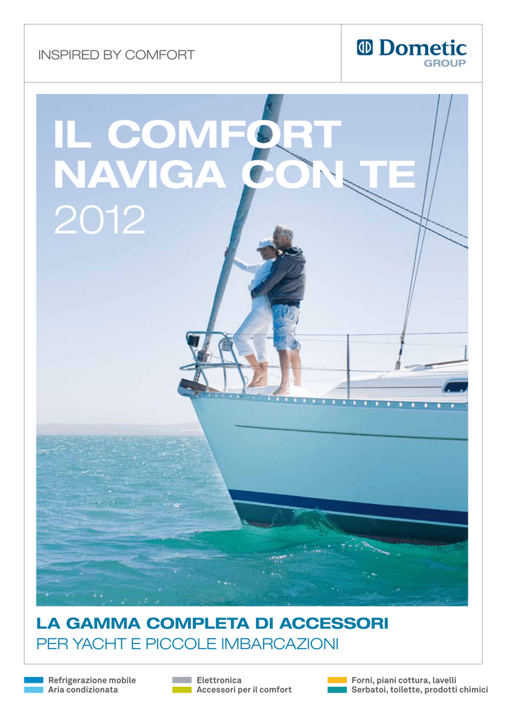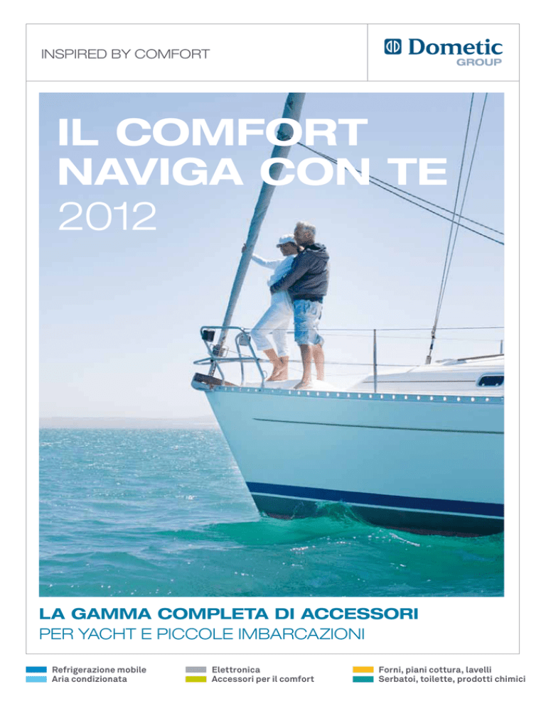 Inspired by comfort Il comfort Naviga con Te 2012 La gamma completa di accessori per yacht e piccole imbarcazioni Refrigerazione mobile Aria condizionata Elettronica Accessori per il comfort Forni, piani cottura, lavelli Serbatoi, toilette, prodotti chimici Indice 04 – 45 46 – 69 70 – 101 Refrigerazione mobile Aria condizionata Elettronica Frigoriferi portatili Sistemi completi Caricabatterie Frigoriferi Climatizzatore a tetto DuraSea per Cura della batteria Gruppi frigoriferi imbarcazioni di servizio Inverter Impianti monoblocco Caricabatterie per computer portatili Impianti Chiller ad acqua Inverter con caricabatterie automatico integrato Impianti split Convertitori di carica / Convertitori di tensione Accessori per impianti A/C Generatori 102 – 105 106 – 127 128 – 149 Forni, piani cottura, lavelli Serbatoi, toilette, prodotti chimici Momenti speciali… di cui fare tesoro! È tutto l’anno che aspetti: il sole, l’acqua, il vento sul viso. Ieri non conta. Il tuo sguardo è puntato sul domani. Verso nuovi orizzonti, nuove esperienze e paesi lontani. Vorremmo unirci a te in questo viaggio, per farti sentire sempre il comfort di casa. Dometic GROUP è il compagno di viaggio che da più di cinquant’anni sviluppa innovative soluzioni per il comfort a bordo. La nostra gamma di prodotti, da tempo disponibile anche per l’aftermarket, si distingue per gli alti standard qualitativi. Scopri la gamma più completa e versatile al mondo di accessori per il comfort e la sicurezza a bordo di yacht e piccole imbarcazioni. Immergiti nell’appassionante mondo dei prodotti del gruppo Dometic! Siamo qui per servirti! Info line Internet & Mail Accessori per il comfort Tel +39 0543 754901 www.dometic.it Cassaforte Fornelli ad alcool, fornelli ad alcool / elettrici, Toilette portatili Aspirapolvere forno / fornello ad alcool, Toilette con sistema di macerazione Fax +39 0543 754983 [email protected] Il tuo contatto diretto con Dometic WAECO, per avere tutte le informazioni sui nostri prodotti e trovare il rivenditore più vicino a casa tua. Qui troverai la gamma completa dei prodotti Dometic WAECO, presentati in una panoramica chiara e con informazioni dettagliate. Inoltre, interessanti novità sulla nostra azienda e offerte speciali. piani cottura in vetroceramica Grill 230 volt, piani cottura a induzione Combinazioni fornello / forno, forni Fornelli a gas Piani cottura da incasso Combinazioni piano cottura / lavello da incasso Toilette con sistema a vuoto e accessori Serbatoi di scarico Accessori e ricambi Pompa dell’acqua a pressione Prodotti chimici Cappa da cucina, bollitore per l’acqua, macchina da caffè www.dometic.it 2 – 3 2 Refrigerazione mobile Frigoriferi portatili Frigoriferi da incasso Porta la freschezza con te! Grande capacità refrigerante per gli spazi più ristretti Bibite fresche in mare aperto e a terra, basta portarle con sè A bordo manca lo spazio per un frigo? Allora dai un’occhiata ai ovunque ce ne sia bisogno! Abbiamo il frigorifero portatile adatto frigoriferi a compressore da incasso CoolMatic! Questi frigo / a qualsiasi esigenza: compatto o spazioso, termoelettrico – freezer possono trasformare spazi ristretti e inutilizzati in leggero e versatile, o con potente tecnologia a compressore – preziosi vani per la refrigerazione. Ideali per yacht e piccole ideale per i cubetti di ghiaccio e il gelato. imbarcazioni… ovunque un centimetro quadrato in più può fare la differenza. HHHHH Eccellente Test 13/2008 WAECO CoolFreeze CF 35 WAECO CoolMatic CD 30W Prezzo (IVA escl.): 602,70 Prezzo (IVA escl.): 559,40 Frigoriferi Gruppi frigoriferi Il comfort di casa, anche a bordo Sistema modulare per soluzioni su misura Frigoriferi per tutti i tipi di imbarcazioni, per spazi grandi e In assenza di misure standard è necessario utilizzare un piccoli. Sono perfetti per la navigazione: prestazioni elevate e frigorifero personalizzato. Con i gruppi refrigeranti WAECO una vasta gamma di accessori non ti faranno rimpiangere il ColdMachine, questo non è un problema. Dotati di refrigerante comfort di casa. Dai il benvenuto alla più grande flotta al mondo pre-caricato e giunti rapidi, sono ideali per un’installazione fai di frigoriferi per il settore nautico! da te. Refrigerazione mobile Frigoriferi portatili Evaporatore a L VD-01 per Serie 50 + Gruppi frigoriferi Frigoriferi portatili termoelettrici 06 – 09 Frigo / freezer portatili a compressore 10 – 17 Frigoriferi Gruppi frigoriferi, evaporatori, accumulatori di freddo 32 – 43 Accessori elettronici per frigoriferi Frigoriferi a compressore da incasso 18 – 19 Frigoriferi a compressore 20 – 31 pleto a Kit com prezzo ! le specia 44 – 45 www.dometic.it WAECO CoolMatic CR 80 Chrome WAECO ColdMachine CU-55 Prezzo (IVA escl.): 789,80 Prezzo (IVA escl.): 356,30 Prezzi IVA esclusa 4 4 – 5 Frigoriferi portatili termoelettrici Un fresco divertimento con il comfort della serie TC Frigoriferi portatili high-tech con presa AC / DC ed elettronica speciale Portatili, sicuri ed estremamente comodi – queste sono le caratteristiche che contraddistinguono la gamma WAECO TropiCool. Il sistema termoelettrico high-tech dalla eccezionale capacità refrigerante, fino a 30 °C in meno rispetto alla temperatura ambiente, è supportato da una dotazione perfetta: commutazione di rete AC / DC di serie (12 / 24 / 230 volt), regolazione della temperatura mediante display digitale e funzione Memory, per citarne alcune. Premendo un pulsante si può trasformare il frigorifero (da +1 °C a +15 °C) in un box di riscaldamento (da +50 °C a +65 °C). WAECO TropiCool – la dimensione del comfort per la refrigerazione in movimento. volt DC 12 / 24 olt AC e 230 v ! di serie Extra: per o i h c r e cop gia la spiag Il tuttofare con due coperchi Freschezza a bordo e in spiaggia modulo termoelettrico e il vano portacavi, è rimovibile. In Disponibile ad un prezzo veramente imbattibile, CoolFun caso di necessità lo si sostituisce con un coper