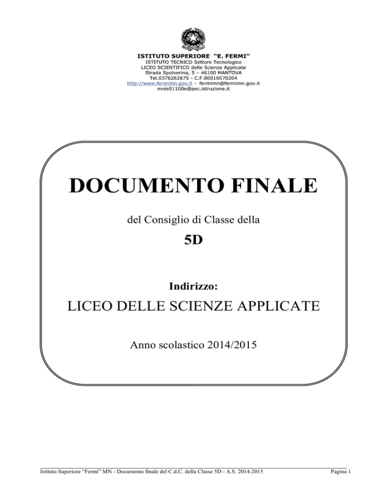 DOCUMENTO FINALE del Consiglio di Classe della 5D Indirizzo: LICEO DELLE SCIENZE APPLICATE Anno scolastico 2014/2015 ___________________________________________________________________________________________________________ Istituto Superiore “Fermi” MN - Documento finale del C.d.C. della Classe 5D - A.S. 2014-2015 Pagina 1 INDICE 1. Prospetto delle discipline con le corrispondenti unità orarie relativo a tutto il triennio ......................3 2. Prospetto del Consiglio di Classe con docente, materia, numero di ore e continuità ..........................4 3. Finalità ed obiettivi generali del Consiglio di Classe ..........................................................................8 4. Situazione della classe .........................................................................................................................5 5. Argomenti interdisciplinari o pluridiscipinari .......................... Errore. Il segnalibro non è definito. 6. Attività integrative ...............................................................................................................................8 7. Attività svolte in modalità CLIL .........................................................................................................9 8. Criteri di selezione dei contenuti disciplinari, metodi e strumenti ......................................................9 9. Criteri per la valutazione e la misurazione del profitto .....................................................................11 10. Criteri per la valutazione e la misurazione della condotta .................................................................12 11. Simulazioni prove Esame di Stato ............................................ Errore. Il segnalibro non è definito. 12. Metodi e strumenti per il recupero ed il potenziamento ....................................................................14 13. Esperienze di ricerca, progetto o approfondimento personale degli alunni (tesine) ..........................15 ALLEGATO 1: Relazioni individuali dei docenti e programmi svolti ......................................................17 ALLEGATO 2: Testi delle simulazioni di terza prova scritta per l’Esame di Stato ..................................36 ALLEGATO 3: Criteri per l’assegnazione dei crediti scolastico e formativo ...........................................41 ___________________________________________________________________________________________________________ Istituto Superiore “Fermi” MN - Documento finale del C.d.C. della Classe 5D - A.S. 2014-2015 Pagina 2 1. Prospetto delle discipline con le corrispondenti unità orarie relativo a tutto il triennio Ore settimanali per anno di corso Discipline del piano di studi 3° 4° 5° Lingua e Letteratura italiana 4 4 4 Storia 2 2 2 Lingua e cultura straniera 3 3 3 Filosofia 2 2 2 Matematica 4 4 4 Fisica 3 3 3 Informatica 2 2 2 Scienze Naturali 5 5 5 Disegno e Storia dell’Arte 2 2 2 Scienze Motorie e Sportive 2 Religione Cattolica 1 1 1 30 30 30 Totale ore settimanali 2 2 ___________________________________________________________________________________________________________ Istituto Superiore “Fermi” MN - Documento finale del C.d.C. della Classe 5D - A.S. 2014-2015 Pagina 3 2. Prospetto del Consiglio di Classe con docente, materia, numero di ore e continuità DOCENTE Fiozzi Daria Fiozzi Daria DISCIPLINA Lingua e Letteratura Italiana Storia MEMBRO ORE/SETT INTERNO CLASSE ESAME DI 5A STATO CONTINUITÀ DALLA CLASSE 3A CONTINUITÀ DALLA CLASSE 4A SI SI 4 SI SI SI 2 SI Ranucci Federica Lingua e Cultura Straniera: Inglese SI SI 3 Facchini Teresa Filosofia NO SI 2 Matematica SI SI 4 Fisica SI SI 3 SI Zappi Cristiana Scienze Naturali NO SI 5 SI Cattafesta Franco Informatica SI SI 2 Tuzza Susanna Disegno e Storia dell’Arte NO NO 2 SI SI 2 SI SI 1 Bottura Donata (Geremia Sara dal 01/10/14 al 26/10/14) (Damian Erika dal 26/03/15 alla fine dell’A.S.) Pagliari Andrea Agostino Elisabetta Spazzini Nicola Scienze Motorie Religione Cattolica ___________________________________________________________________________________________________________ Istituto Superiore “Fermi” MN - Documento finale del C.d.C. della Classe 5D - A.S. 2014-2015 Pagina 4 3. Finalità ed obiettivi generali del Consiglio di Classe Gli obiettivi formativi adottati dal Consiglio di Classe nella prima riunione, e poi monitorati nel corso di tutto l’anno scolastico sono stati: 1. Migliorare coerenza, trasparenza ed equità nelle valutazioni 2. conseguire capacità di sintesi nella elaborazione e dimostrare sicurezza nell’analisi e nella problematizzazione personale 3. dimostrare autonomia nella scelta degli approfondimenti individuali da proporre con esposizioni convincenti sul piano logico 4. perfezionare l’uso dei linguaggi specifici per esprimere la complessità ___________________________________________________________________________________________________________ Istituto Superiore “Fermi” MN - Documento finale del C.d.C. della Classe 5D - A.S. 2014-2015 Pagina 5 4. Situazione della classe La classe 5D proviene da un percorso piuttosto regolare durante tutto il quinquennio. Durante gli ultimi tre anni gli studenti, non numerosi e sempre piuttosto positivi, hanno risposto con generale disponibilità e regolarità al lavoro proposto dai docenti. Grazie anche alla continuità di buona parte della componente docente del consiglio di classe e alla indubbia coesione degli allievi, la classe nel complesso ha saputo organizzare le proprie attività in modo sicuro e piuttosto proficuo. Pochi, se non rari, sono stati i debiti assegnati sin dalla classe terza, e soprattutto a carico della sola disciplina di matematica. Il clima relazionale, motivazionale e collaborativo sia tra gli allievi, sia nel rapporto con gli insegnanti appaiono buoni (l’assenza di note disciplinari ne è un chiaro segno). Alcuni ragazzi inoltre hanno mostrato nel corso degli anni interessi pe