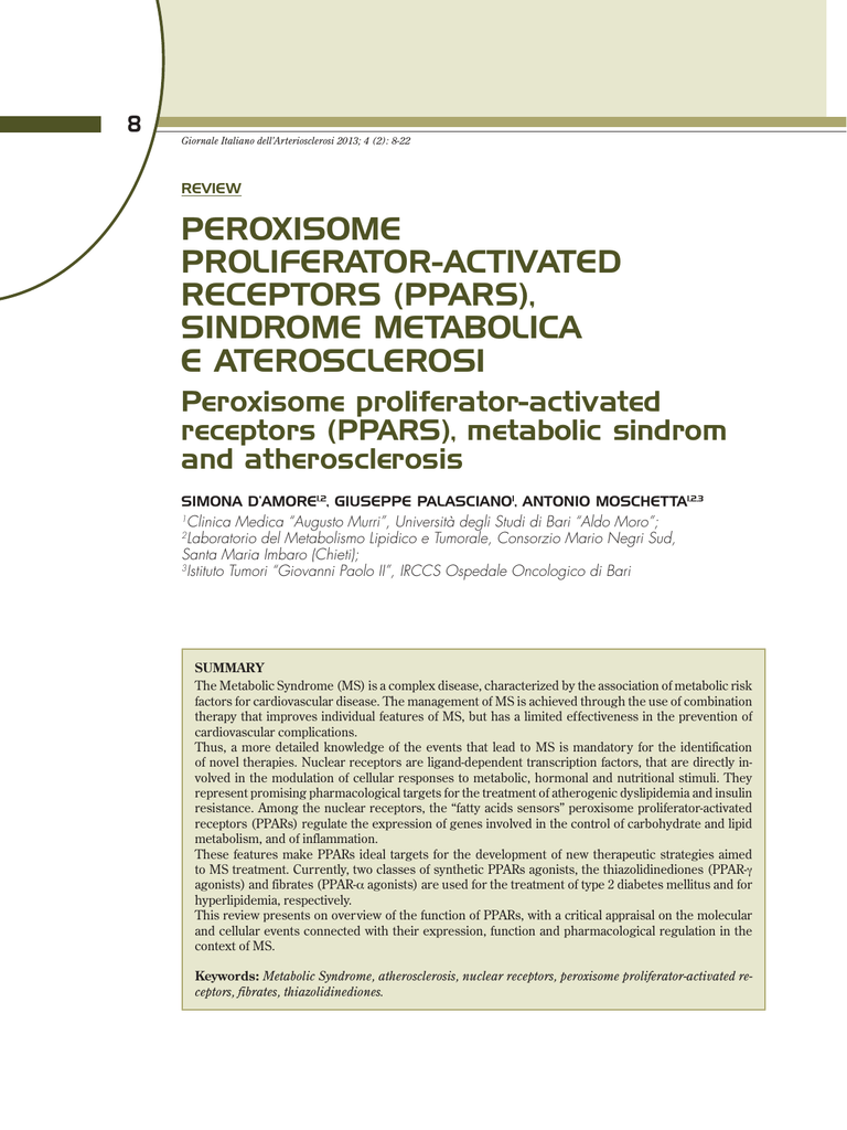 8 Giornale Italiano dell’Arteriosclerosi 2013; 4 (2): 8-22 REVIEW PEROxISOME PROLIFERATOR-ACTIVATED RECEPTORS(PPARS), SInDROMEMETABOLICA EATEROSCLEROSI Peroxisomeproliferator-activated receptors(PPARS),metabolicsindrom andatherosclerosis SIMOnAD’AMORE1,2,GIuSEPPEPALASCIAnO1,AnTOnIOMOSChETTA1,2,3 Clinica Medica “Augusto Murri”, Università degli Studi di Bari “Aldo Moro”; Laboratorio del Metabolismo Lipidico e Tumorale, Consorzio Mario Negri Sud, Santa Maria Imbaro (Chieti); 3 Istituto Tumori “Giovanni Paolo II”, IRCCS Ospedale Oncologico di Bari 1 2 SuMMARY The Metabolic Syndrome (MS) is a complex disease, characterized by the association of metabolic risk factors for cardiovascular disease. The management of MS is achieved through the use of combination therapy that improves individual features of MS, but has a limited effectiveness in the prevention of cardiovascular complications. Thus, a more detailed knowledge of the events that lead to MS is mandatory for the identification of novel therapies. Nuclear receptors are ligand-dependent transcription factors, that are directly involved in the modulation of cellular responses to metabolic, hormonal and nutritional stimuli. They represent promising pharmacological targets for the treatment of atherogenic dyslipidemia and insulin resistance. Among the nuclear receptors, the “fatty acids sensors” peroxisome proliferator-activated receptors (PPARs) regulate the expression of genes involved in the control of carbohydrate and lipid metabolism, and of inflammation. These features make PPARs ideal targets for the development of new therapeutic strategies aimed to MS treatment. Currently, two classes of synthetic PPARs agonists, the thiazolidinediones (PPAR-γ agonists) and fibrates (PPAR-α agonists) are used for the treatment of type 2 diabetes mellitus and for hyperlipidemia, respectively. This review presents on overview of the function of PPARs, with a critical appraisal on the molecular and cellular events connected with their expression, function and pharmacological regulation in the context of MS. Keywords: Metabolic Syndrome, atherosclerosis, nuclear receptors, peroxisome proliferator-activated receptors, fibrates, thiazolidinediones. Peroxisomeproliferator-activatedreceptors(PPARs),sindromemetabolicaeaterosclerosi 9 Sindromemetabolica La SM è una malattia sistemica complessa, caratterizzata dall’associazione di più fattori di rischio metabolici che determinano un incremento dell’insorgenza di complicanze cardiovascolari su base aterosclerotica e di diabete mellito di tipo II (DMT2). Le alterazioni principali che la caratterizzano sono l’obesità di tipo “centrale”, le alterazioni del metabolismo glicidico (insulino-resistenza, alterata glicemia a digiuno e alterata tolleranza glicidica), del metabolismo lipidico (elevati livelli di trigliceridi sierici e ridotti valori di colesterolo HDL, high density lipoprotein) e dei valori di pressione arteriosa, che si associano a uno stato infiammatorio cronico. La presenza nella SM di molteplici componenti e complicanze cliniche ha reso difficoltosa la formulazione di una definizione univoca e di criteri diagnostici universalmente riconosciuti (1, 2). La classificazione del National Cholesterol Education Program Indirizzo per la corrispondenza Antonio Moschetta M.D. Ph.D. Clinica Medica “Augusto Murri” Università degli Studi di Bari “Aldo Moro” Azienda Ospedaliero-Universitaria Consorziale Policlinico di Bari Piazza Giulio Cesare, 11 - 70124 Bari E-mail: [email protected] Third Adult Treatment Panel (NCEP-ATP III) rappresenta il modello classificativo più accurato in termini di sensibilità e specificità (1, 2) (Tabella 1). Sebbene negli ultimi anni la SM sia stata oggetto di un crescente interesse, i meccanismi patogenetici che ne sono alla base rimangono ancora poco conosciuti, probabilmente a causa della eterogeneità delle sue espressioni fenotipiche, determinate dalla diversa combinazione dei criteri diagnostici. Tuttavia vi è un consenso generale nel ritenere che la SM sia malattia multifattoriale, in cui cause genetiche ed ambientali rivestono ugual peso nel determinare l’instaurarsi di uno stato di insulino-resistenza (IR) (3). L’IR è alla base delle alterazioni dell’omeostasi del metabolismo glicidico, come l’alterata tolleranza al glucosio e il DMT2, e si associa alle alterazioni del metabolismo lipidico, del tessuto adiposo viscerale e della pressione arteriosa, tutte condizioni descritte come caratteristiche della SM. La sua gestione clinica è attualmente messa in atto mediante la correzione degli stili di vita, come la riduzione dell’introito calorico e la promozione dell’attività fisica, e mediante l’utilizzo di terapie combinate, che spesso presentano significativi effetti collaterali. Sebbene tale approccio terapeutico migliori le singole Tabella1-CriteriperladiagnosidiSindromeMetabolica(nationalCholesterolEducation Program-ThirdAdultTreatmentPanel,nCEP-ATPIII,2001). Fattoridirischio Valorisoglia(ladiagnosidiSindromeMetabolicavieneposta inpresenzadialmenotredeiseguenticinquefattoridirischio) Circonferenza addominale ≥102 cm (uomo)/≥88 cm (donna) Trigliceridi ≥150 mg/dL (o in trattamento farmacologico) Colesterolo HDL <50 mg/dL (uomo)/<40 mg/dL (donna) (o in trattamento farmacologico) Pressione Arteriosa ≥130/85 mmHg (o in trattamento farmacologico) Glicemia a digiuno ≥100 mg/dL‡ (o diagnosi di diabete o in trattamento farmacologico) Nel 2004 il valore soglia per la definizione di alterata glicemia a digiuno è stato diminuito da 110 mg/dL (6.1 mmol/L) a 100 mg/dL (5.6 mmol/L), in accordo con la definizione aggiornata di alterata glicemia a digiuno dell’American Diabetes Association. Adattato da Grundy et al. “Diagnosis and management of the metabolic syndrome: an American Heart Association/National Heart, Lung, and Blood Institute Scientific Statement” Circulation 2005. ‡ SimonaD’Amore,GiuseppePalas