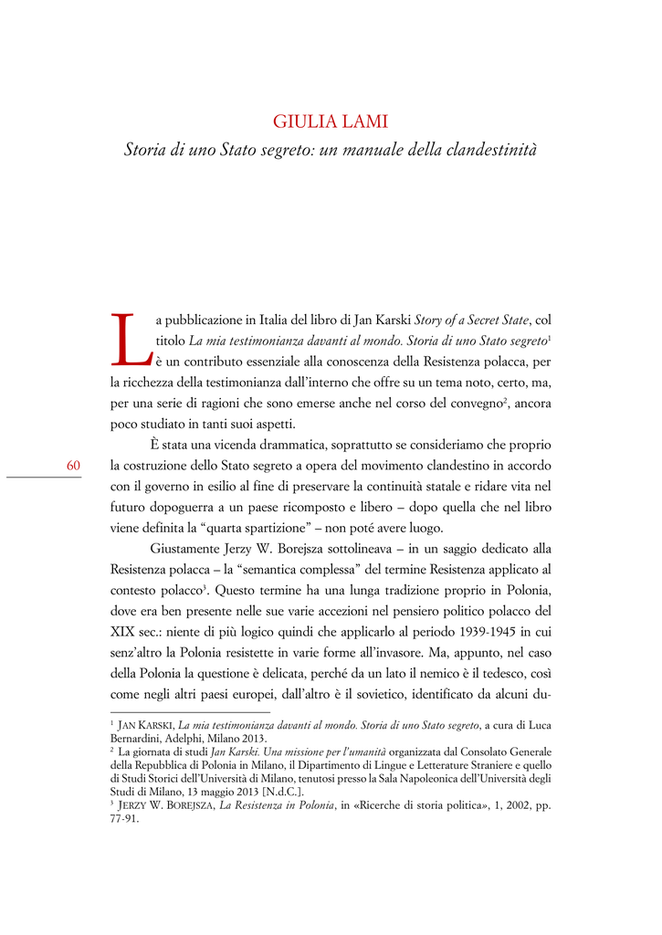 GIULIA LAMI Storia di uno Stato segreto: un manuale della clandestinità L a pubblicazione in Italia del libro di Jan Karski Story of a Secret State, col titolo La mia testimonianza davanti al mondo. Storia di uno Stato segreto1 è un contributo essenziale alla conoscenza della Resistenza polacca, per la ricchezza della testimonianza dall’interno che offre su un tema noto, certo, ma, per una serie di ragioni che sono emerse anche nel corso del convegno2, ancora poco studiato in tanti suoi aspetti. È stata una vicenda drammatica, soprattutto se consideriamo che proprio 60 la costruzione dello Stato segreto a opera del movimento clandestino in accordo con il governo in esilio al fine di preservare la continuità statale e ridare vita nel futuro dopoguerra a un paese ricomposto e libero – dopo quella che nel libro viene definita la “quarta spartizione” – non poté avere luogo. Giustamente Jerzy W. Borejsza sottolineava – in un saggio dedicato alla Resistenza polacca – la “semantica complessa” del termine Resistenza applicato al contesto polacco3. Questo termine ha una lunga tradizione proprio in Polonia, dove era ben presente nelle sue varie accezioni nel pensiero politico polacco del XIX sec.: niente di più logico quindi che applicarlo al periodo 1939-1945 in cui senz’altro la Polonia resistette in varie forme all’invasore. Ma, appunto, nel caso della Polonia la questione è delicata, perché da un lato il nemico è il tedesco, così come negli altri paesi europei, dall’altro è il sovietico, identificato da alcuni du1 JAN KARSKI, La mia testimonianza davanti al mondo. Storia di uno Stato segreto, a cura di Luca Bernardini, Adelphi, Milano 2013. 2 La giornata di studi Jan Karski. Una missione per l’umanità organizzata dal Consolato Generale della Repubblica di Polonia in Milano, il Dipartimento di Lingue e Letterature Straniere e quello di Studi Storici dell’Università di Milano, tenutosi presso la Sala Napoleonica dell’Università degli Studi di Milano, 13 maggio 2013 [N.d.C.]. 3 JERZY W. BOREJSZA, La Resistenza in Polonia, in «Ricerche di storia politica», 1, 2002, pp. 77-91. PL.IT / RASSEGNA ITALIANA DI ARGOMENTI POLACCHI 5 / 2014 rante, ma anche dopo la guerra, come il liberatore di popolazioni e territori occupati dai tedeschi e fondamentale artefice della vittoria alleata sul nazismo. Per questo, forse, gli storici polacchi, a partire dagli anni Novanta del secolo scorso, per reazione alla visione della Resistenza – intesa esclusivamente in senso anti-tedesco – propria della Polonia Popolare, hanno preferito far ricorso più che al termine “Resistenza” a quello di “Stato polacco clandestino”4 e di “Polonia clandestina”5. In realtà, l’uso del termine “Resistenza” è appropriato, laddove si consideri che la Polonia non è stata sola nella sua lotta contro l’occupazione tedesca, riconnettendosi idealmente alla più generale lotta portata avanti in Europa da altri paesi caduti sotto il giogo tedesco6, anche se l’uso del termine “Stato polacco clandestino” illustra una specificità dell’esperienza polacca che merita di essere compresa e valorizzata. Come scriveva Giorgio Vaccarino nel suo ampio quadro della Resistenza in Europa, “la Resistenza in ogni paese ebbe una fisionomia propria, quasi una risultante del parallelogramma fra le sue componenti”7. In questo senso, “nei paesi che lottarono per la difesa dell’identità nazionale [...] la difesa della propria identità allargò la rosa degli avversari, accostando sovente all’invasore tedesco quello sovietico” come fu nel caso della Polonia “che fin dal primo giorno della progressiva occupazione tedesca dell’intero territorio, nel settembre del 1939, vide la concorrenza sovietica sulla metà orientale di esso, e si batté con metodi in realtà diversi contro l’una e l’altra occupazione”8. Richiamo brevemente i fatti che sostanziano quanto detto sopra. Già dall’agosto del 1939, con la firma del patto Ribbentrop-Molotov, di cui quest’anno ricorre il 75° anniversario, la spartizione sovietico-tedesca dell’intero territorio polacco e l’impegno congiunto previsto nel “protocollo supplementare e segreto” a reprimere qualsiasi forma di agitazione polacca segnavano fin da subito il destino della Polonia9. 4 STANISŁAW SALMONOWICZ, Polskie Państwo Podziemne. Z dziejów walki cywilnej 1939-1945, WSiP, Warszawa 1994; TOMASZ STRZEMBOSZ, Rzeczpospolita podziemna. Społeczeństwo polskie a Państwo Podziemne 1939-1945, Krupski i S-ka, Warszawa 2000. 5 WŁODZIMIERZ BORODZIEJ, ANDRZEJ CHMIELARZ, ANDRZEJ FRISZKE, ANDRZEJ KRZYSZTOF KUNERT, Polska Podziemna 1939-1945, WSiP, Warszawa 1991. 6 NORMAN DAVIES, La rivolta. Varsavia 1944, Rizzoli, Milano 2004, cap. 4, La Resistenza. Cfr. anche IDEM, Storia d’Europa, vol. I, Bruno Mondadori, Milano 2002. 7 GIORGIO VACCARINO, Lineamenti della Resistenza in Europa, in La Resistenza e l’Europa. Atti del Convegno di studi storici, a cura di Arturo Colombo, Mondadori, Milano 1984, pp. 37-85, p. 37. 8 IVI, pp. 55-56. 9 Segnalo il volume Il patto Ribbentrop-Molotov, l’Italia e l’Europa (1939-1941), a cura di Alberto Basciani, Antonio Macchia, Valentina Sommella, Aracne, Ariccia 2013, che raccoglie, tra 61 GIULIA LAMI STORIA DI UNO STATO SEGRETO Anche se la “cinica alleanza”, per usare un’espressione di Ettore Cinnella, era destinata a durare solo un biennio, ai due “briganti totalitari”10, Hitler e Stalin, regalò “copiosi frutti” a spese del resto dell’Europa. Va ricordato peraltro che “i protocolli segreti del trattato hanno incluso in fasi successive anche piani di spartizione dell’Europa settentrionale e orientale in sfere di influenza, capaci con la violenza di sottomettere interi paesi nei quali la brutalità organizzata sarebbe diventata ‘interna’, dopo l’invasione e le annessioni condotte senza dichiarazioni di guerra”, come scrive Alessandro Vitale, che accosta protocolli se