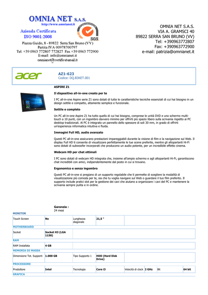 OMNIA NET S.A.S. VIA A. GRAMSCI 40 89822 SERRA SAN BRUNO (VV) Tel: +390963772807 Fax: +390963772900 e-mail: [email protected] AZ1-623 Codice: DQ.B3KET.001 ASPIRE Z1 Il dispositivo all-in-one creato per te I PC all-in-one Aspire serie Z1 sono dotati di tutte le caratteristiche tecniche essenziali di cui hai bisogno in un design sottile e compatto, altamente semplice e funzionale. Sottile e completo Un PC all-in-one Aspire Z1 ha tutto quello di cui hai bisogno, comprese le unità DVD e uno schermo multitouch a 10 punti, con un ingombro davvero minimo per offrirti più spazio libero sulla scrivania rispetto ai PC desktop tradizionali. Al PC è integrato un pannello dello spessore di soli 30 mm, in grado di offrirti un'esperienza informatica intuitiva e fluida. Immagini Full HD, audio avanzato Questi PC all-in-one assicurano prestazioni impareggiabili durante la visione di film e la navigazione sul Web. Il display Full HD ti consente di visualizzare perfettamente le tue scene preferite, mentre gli altoparlanti Hi-Fi sono dotati di subwoofer incorporati che producono un audio potente, per un incredibile effetto cinema. Webcam HD per chat ottimali I PC sono dotati di webcam HD integrata che, insieme all'ampio schermo e agli altoparlanti Hi-Fi, garantiscono chat incredibili con amici, indipendentemente dal posto in cui si trovano. Ergonomico e senza ingombro Questi PC all-in-one si pregiano di un supporto regolabile che ti permette di scegliere la modalità di visualizzazione più comoda per te, sia che tu voglia navigare sul Web o guardare il tuo film preferito. Il supporto include pratici slot per la gestione dei cavi che aiutano a organizzare i cavi del PC e mantenere la scrivania sempre pulita e in ordine. Garanzia : 24 mesi MONITOR Touch Screen No Lunghezza diagonale 21,5 " 1.000 GB Tipo Supporto 1 HDD (Hard Disk Drive) Intel Tecnologia Core i3 MOTHERBOARD Socket Socket H3 (LGA 1150) RAM RAM Installata 4 GB MEMORIA DI MASSA Dimensione Tot. Supporti PROCESSORE Produttore GRAFICA Velocità di clock 2 GHz Bit 64 bit Produttore Intel Modello HD Graphics Memoria Dedicata 0 MB Windows 10 Versione S.O. Home Bit S.O. 64 1 Velocità Lettura 16 x read Velocità Scrittura 8 x write 0 USB posteriori 3 All in one (monitor integrato) Sì Colore Primario Nero Case All in One Wireless (standard) 802.11 a/b/g/n/ac Altoparlanti VIDEO Scheda TV No SISTEMA OPERATIVO & SOFTWARE S.o. Durata antivirus incluso 1 months Bluetooth Sì UNITÀ OTTICHE Numero unità installate CONTROLLER Raid No CONNETTORI/PORTE USB frontali GENERALE Sì Non viene rilasciata alcuna garanzia né dichiarazione in relazione all'accuratezza di tali informazioni e si declina qualsiasi responsabilità per errori tipografici o d'altro tipo o per omissioni nel contenuto. Fornendo tali informazioni, inoltre, non viene concessa alcuna licenza su copyright, brevetti o qualsiasi altro diritto di proprietà intellettuale. Non è consentito modificare in alcun modo i materiali presenti nel Sito, né riprodurli o trasmetterli pubblicamente, né distribuirli o in altro modo utilizzarli a scopi pubblici o commerciali. In caso di violazione delle presenti condizioni, cessa ogni autorizzazione all'uso del Sito ed è obbligatorio distruggere con effetto immediato eventuali materiali scaricati o stampati. SCHERMO INTERATTIVO Touch Display 65” 10 tocchi Codice LIFP65IR10AG-B La soluzione ideale per fare un passo oltre la “classica” LIM: eliminando i costi di gestione legati alla sostituzione delle lampade del videoproiettore ed alla sua manutenzione, i monitor interattivi Touch Display costituiscono un investimento a lungo termine davvero intelligente! La risoluzione FullHD 1080p ed il sistema di retroilluminazione LED garantiscono una qualità d’immagine elevata a fronte di un consumo energetico estremamente basso. E non è tutto: i monitor Touch Display permettono di interagire con il tocco delle dita o di qualsiasi oggetto solido con il PC che ad essi è collegato via USB senza la necessità di installare alcun driver. Il supporto dello standard HID (Human Interface Device) permette infatti di collegare “al volo” un PC Windows e di iniziare subito a lavorare senza nessuna configurazione o calibrazione. Le funzioni di multi touch e multi gesture sono supportate grazie ad un input simultaneo di 10 tocchi. Tale caratteristica permette inoltre a più persone di lavorare contemporaneamente sullo schermo: un’idea eccellente per stimolare le attività collaborative. L’ampio assortimento di connessioni I/O analogiche e digitali presenti sia nel pannello frontale che in quello posteriore permette di collegare ai monitor Touch Display PC, chiavette USB, media player etc., garantendo la massima comodità operativa ed un’elevata compatibilità con le più svariate tecnologie. Ligra srl Via Artigiani 29/31 - 29020 Vigolzone (PC) Italy Tel.: +39 0523 872014 Fax: +39 0523 870089 E-mail: [email protected] - Web: www.ligra.it Specifiche tecniche soggette a modifica senza preavviso. Specifiche tecniche Video Illuminazione pannello Dimensioni schermo Diagonale schermo Formato Risoluzione Profondità colore Luminosità Contrasto Frequenza Tempo di risposta Standard video Porte I/O Audio Supporto per lettura file Consumo Tocco Superficie di lavoro Tecnologia Driver Tocchi simultanei Strumenti di input Velocità di scansione Velocità di tracciamento Precisione Interfaccia PC Lunghezza cavo USB Dati fisici Temperatura di stoccaggio Temperatura operativa Dimensioni esterne Imballaggio Peso netto Peso lordo Vesa Sensore luminosità ambientale Slot OPS Colore cornice Certificazioni e Garanzia Garanzia Certificazioni Software Software didattico a corredo LED 1.428x803 mm 65” 16:9 1920x1080 pixel 8 bit 370 cd/m2 4.000:1 60 Hz 8 ms PAL/NTSC/SECAM Fronte: HDMI In, USB per interazione touch, USB per media player, USB 2.0 per PC, USB 3.0 per PC, Ingresso microfono Retro: USB per interazione touch, USB per media player, 2x HDMI In, VGA In, Audio In, AV In, YPBPR/YC