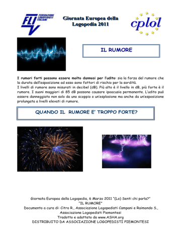 G Giioorrnnaattaa E Euurrooppeeaa ddeellllaa L Looggooppeeddiiaa 22001111 IL RUMORE I rumori forti possono essere molto dannosi per l’udito: sia la forza del rumore che la durata dell’esposizione ad esso sono fattori di rischio per la sordità. I livelli di rumore sono misurati in decibel (dB). Più alto è il livello in dB, più forte è il rumore. I suoni maggiori di 85 dB possono causare ipoacusia permanente. L’udito può essere danneggiato non solo da uno scoppio o un’esplosione ma anche da un’esposizione prolungata a livelli elevati di rumore. QUANDO IL RUMORE E’ TROPPO FORTE? Giornata Europea della Logopedia, 6 Marzo 2011 “(Lo) Senti chi parla?” “IL RUMORE” Documento a cura di: Citro R., Associazione Logopedisti Campani e Raimondo S., Associazione Logopedisti Piemontesi Tradotto e adattato da www.ASHA.org DISTRIBUITO DA ASSOCIAZIONE LOGOPEDISTI PIEMONTESI G Giioorrnnaattaa E Euurrooppeeaa ddeellllaa L Looggooppeeddiiaa 22001111 Ecco alcuni esempi del livello medio in decibel di alcuni suoni comuni. RUMORE OLTRE LA SOGLIA DEL DOLORE 150 dB = fuoco d’artificio a circa 1 metro 140 dB = armi da fuoco, motore di jet 130 dB = martello pneumatico 120 dB = decollo aereo, sirena RUMORE ESTREMAMENTE FORTE 110 dB = alcuni MP3 a massimo volume, modellini d’aereo, motosega 106 dB = falciatrice a motore, spazzaneve 100 dB = trapano 90 dB = metropolitana, motociclo in accelerazione RUMORE MOLTO FORTE 80-90 dB = asciugacapelli, frullatore, robot da cucina 70 dB = traffico, aspirapolvere, sveglia RUMORE MODERATO 60 dB = conversazione, lavastoviglie, asciugatrice 50 dB = pioggia 40 dB = stanza tranquilla RUMORE LIEVE 30 dB = mormorio, biblioteca tranquilla Giornata Europea della Logopedia, 6 Marzo 2011 “(Lo) Senti chi parla?” “IL RUMORE” Documento a cura di: Citro R., Associazione Logopedisti Campani e Raimondo S., Associazione Logopedisti Piemontesi Tradotto e adattato da www.ASHA.org DISTRIBUITO DA ASSOCIAZIONE LOGOPEDISTI PIEMONTESI G Giioorrnnaattaa E Euurrooppeeaa ddeellllaa L Looggooppeeddiiaa 22001111 COME PUOI CAPIRE QUANDO IL RUMORE E’ TROPPO FORTE? Devi alzare la voce per essere sentito? Non senti una persona ad un metro di distanza? Le parole attorno a te sembrano attutite o smorzate quando ti allontani dall’area rumorosa? Senti dolore o un tintinnio (detto “tinnitus”) nelle orecchie dopo l’esposizione al rumore? IN CHE MODO IL RUMORE DANNEGGIA L’UDITO? Capire il modo in cui sentiamo può aiutare a capire come i rumori forti possano danneggiare l’udito. Uno dei più comuni effetti negativi dei rumori forti è una perdita uditiva permanente. Ciò avviene nel modo seguente: Il suono forte è raccolto dall’orecchio in forma di onde sonore. Le onde sonore attraversano il canale uditivo fino al timpano con abbastanza forza da spaccare il delicato sistema uditivo. Se il suono è abbastanza forte può far staccare gli ossicini dell’orecchio medio. Il suono passa attraverso l’orecchio medio e si sposta verso l’orecchio interno, chiamato coclea. Le cellule ciliate che tappezzano le pareti di questa struttura contenente un liquido, possono essere danneggiate quando il suono forte raggiunge l’orecchio interno. Giornata Europea della Logopedia, 6 Marzo 2011 “(Lo) Senti chi parla?” “IL RUMORE” Documento a cura di: Citro R., Associazione Logopedisti Campani e Raimondo S., Associazione Logopedisti Piemontesi Tradotto e adattato da www.ASHA.org DISTRIBUITO DA ASSOCIAZIONE LOGOPEDISTI PIEMONTESI G Giioorrnnaattaa E Euurrooppeeaa ddeellllaa L Looggooppeeddiiaa 22001111 Solo delle cellule ciliate sane possono trasmettere gli impulsi uditivi al cervello. È nel cervello che il suono viene compreso e interpretato. Cellule ciliate danneggiate da forti rumori non possono trasmettere l’impulso elettrico al cervello per l’interpretazione. Rumori brevi ed intensi, come lo scoppio di un petardo o un’esplosione, possono danneggiare le cellule ciliate, così come un’esposizione continua e/o ripetuta a livelli sonori elevati. Una volta che le cellule ciliate sono state danneggiate, non esiste al momento alcun trattamento che possa ripararle. IN QUALI ALTRI MODI PUO’ ESSERE DANNOSO IL RUMORE? I rumori forti possono aumentare la stanchezza e causare irritabilità. Il rumore può diminuire la capacità di prestare attenzione. Questa è una preoccupazione nei posti di lavoro per la sicurezza dei lavoratori; la capacità di accorgersi di difetti di funzionamento e segnali d’allarme può essere ridotta. Il rumore può anche ridurre la produttività. Le aule scolastiche rumorose possono rendere per i bambini più difficile imparare. L’ambiente rumoroso può rendere faticoso seguire una conversazione. Il rumore può mascherare o coprire alcuni suoni delle parole, così “tetto” può diventare “detto”. C’è bisogno di più concentrazione ed energia non solo per ascoltare e sentire al di sopra del rumore, ma anche per far sentire la propria voce. Così, la voce si sforza e possono svilupparsi problemi alla laringe. Un altro effetto comune dei rumori forti è il “tinnitus”, cioè tintinnii, ronzii o altri rumori nell’orecchio. Il rumore forte può causare anche altri problemi fisici, come: Giornata Europea della Logopedia, 6 Marzo 2011 “(Lo) Senti chi parla?” “IL RUMORE” Documento a cura di: Citro R., Associazione Logopedisti Campani e Raimondo S., Associazione Logopedisti Piemontesi Tradotto e adattato da www.ASHA.org DISTRIBUITO DA ASSOCIAZIONE LOGOPEDISTI PIEMONTESI G Giioorrnnaattaa E Euurrooppeeaa ddeellllaa L Looggooppeeddiiaa 22001111 Pressione alta Battito cardiaco accelerato o alterato Disturbi di stomaco Insonnia o difficoltà del sonno (anche dopo che il rumore è cessato) Interruzione dello sviluppo di un bambino prima della nascita COME POSSO PROTEGGERE DAL MIO UMORE IL MIO UDITO E QUELLO DEL MIO BAMBINO? Le parole chiave sono educazione e prevenzione! Gestire il rumore e i suoi effetti sul tuo udito è una responsab