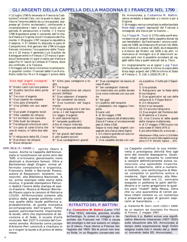 GLI ARGENTI DELLA CAPPELLA DELLA MADONNA E I FRANCESI NEL 1799 SS. Annunziata, p. Costantino M. Battini, venne arrestato e deportato a Livorno e poi a Digione. Il 16 maggio veniva compilata la sottoriportata Nota degli argenti esproprati dai Francesi e consegnati alla Zecca per la fusione ... Il 12 luglio 1790 fu emanata in Francia la Costituzione Civile del Clero, con la quale lo stato, per ridurre l’enorme debito da cui era gravato, soppresse gli Ordini ecclesiastici, confiscando e incamerandone i beni e dando inizio ad un periodo di persecuzioni e rivolte. Il 2 marzo 1796 Napoleone prese il comando dell’Armata d’Italia e il 5 aprile iniziò l’invasione del Piemonte. Il 29 giugno 1797 nacque la repubblica Cisalpina, il 17 ottobre fu stipulata la pace di Campoformio. Nel gennaio del 1799 le truppe francesi iniziarono l’occupazione della Toscana e il 25 marzo il generale Luis Gaultier de Kerkeguen entrò in Firenze. Il 27 marzo il granduca Ferdinando III partì in esilio per Vienna e papa Pio VI lasciò la Certosa di Firenze, dove era confinato, e la Toscana. Il 6 maggio ad Arezzo iniziarono le sollevazioni popolari contro i Francesi dette Viva Maria. Nella notte tra l’8 e il 9 maggio il priore della Nota degli argenti consegnati alla Zecca N° Dodici calici con loro patena N° Quattro borchie delle porte del Coro N° Tre croci d’argento N° Due coperte da messale N° Uno paio d’ampolle N° Una pilletta con suo aspersorio N° Due piatti d’argento tondi N° Otto cassette da reliquie N° Un torribolo con navicella N° Otto busti da reliquie N° Tre reliquiari a forma di calici N° Un paio di carte Gloria che una di mezzo, e l’altre due laterali N° Il reliquiario della SS. Croce N° Due bracci da reliquie N° Nove reliquiari Il p. Filippo M. Tozzi († 1775) nelle sue Memorie descrive gli argenti della cappella donati da vari benefattori: da Ferdinando I ancora cardinale nel 1589, da Ottaviano Marinari nel 1604, da Cristina di Lorena nel 1620, da Alessandro e Antonio dei Medici nel 1636 e da altri. In mancanza di immagini e/o di descrizioni accurate però non è possibile accostare gli oggetti della lista a quelli elencati dal p. Tozzi. Un ringraziamento va al signor Luigi Tanzi che ha donato al nostro Archivio la copia della Nota degli argenti del 1799 (Archivio di Stato di Firenze, C. S. 119, n.1010) [P.I.M.]. N° Altro paio carteglorie a foglia N° Tre bugie N° Un baldacchino del ciborio piccolo (biffato) N° Due ostensori d’argento N° Sei candelieri da tavola N° Due lucentori del Sagramento N° Due lampade che 1 del Soccorso, e 1 del Sagramento Un leggio d’argento Si volti (secondo foglio) N° lampade quattordici Altra di mezzo indorata N° Venticinque vasi della balaustra N° Sei grandi dell’altare E altri quattro piccoli N° Due candeglieroni grandi N° Due candeglieri da tavola di casa Medici N° Sei candeglieri indorati Un mesciroba con piatto dorato Una croce indorata con suo piede N° Sei gigli Un piattino dell’ampolle Il piedestallo che reggeva l’ampolle Diversi voti A dì 16 maggio 1799 (Segue la recevuta del direttore della Zecca di Firenze, e l’annotazione del peso di libbre 1318) Segue la nota degli argenti consegnati alla Zecca (terzo foglio) 1. Un ciborio grande con sua croce, e baldacchino 2. Una cassetta dorata con cali- cont. da p. 4 - Lauda ... spirito libero e nuovo. Anche la Cappella dell'Annunziata si ricostituisce nei primi anni del '500: vi si trovano, giovanissimi, nomi destinati a diventare famosi. Oltre a Bartolomeo degli Organi, ormai affermato compositore e organista, Francesco Aiolle e Bernardo Pisano, autore di Responsori, esistenti, manoscritti, alla Biblioteca Nazionale. A lui, primo esempio nella storia della musica, il grande stampatore Petrucci dedicò l'onore della stampa di opera d'autore: Musica di Messer Bernardo Pisano sopra le canzoni di Petrarca (1520). All'Annunziata insieme alla pratica della grande polifonia continua quella della laude polifonica e, probabilmente, di quella monodica accompagnata dall'organo. Fatto questo particolarmente importante: la laude, oltre che espressione di devozione e di fede, è scuola d'arte musicale. Nel 1537 il cronista del Convento annota: Richordo come Jacopo d'Antonio Peri cominciò a chantare in su li organi la laude a di primo di detto mese. 6 ce, e piedino. Il tutto per il Sepolcro 3. Una pisside. 4. Reliquiario per le feste della B.ma Vergine 5. Due guancialini ad uso delle reliquie di S. Filippo Benizi 6. Un reliquiario 9.(sic) Una lampada 10. Un piccolo reliquiario 11 Due angioli del frontone della Madonna e Corona 12. Una Corona di sette spade della Vergine Addolorata. A dì 17 maggio 1799 (nuova ricevuta e peso di libbre 1474.1) E più altre libbre 25, e once sei ... libbratoscana=339gr.; oncia=1/12dilibbra; nella foto uno scorcio della cappella come appariva in P. M. Bernardi, Applausi ..., 1672. La Cappella continuò la sua ininterrotta e prestigiosa attività fino agli anni del recente dopoguerra. Quando negli anni sessanta fu costretta a cessare definitivamente aveva conosciuto una splendida rinascita. Aveva in repertorio, oltre a numerosi mottetti, una venticinquina di Messe complete in polifonia antica e moderna. Ogni domenica, alla Messa solenne delle ore 11, venivano eseguite in polifonia le parti dell'Ordinario e in canto gregoriano le quattro parti "mobili" della Messa. Oltre che su una quarantina di coristi poteva infatti contare su un numeroso e preparato gruppo di giovani aspiranti al Sacerdozio ... ». RITRATTO DEL P. BATTINI Il p. Costantino M. Battini (Lerici 1757 - Pisa 1832), latinista, grecista, erudito archeologo, fu preso in ostaggio e deportato dai Francesi nel 1799 a causa del prestigio e del suo essere un religioso di rilievo. Fece ritorno a Firenze nell'agosto del 1800. Ma le prove non erano finite. In un Registro conservato nel- p. Valente M. Gori, osm (1921 † 1999) da un depliant del Quartetto Pro Musica di Firenze, 2 maggio 1987. l’arc