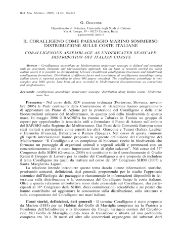 Biol. Mar. Mediterr. (2007), 14 (2): 126-143 G. Giaccone Dipartimento di Botanica, Università degli Studi di Catania Via A. Longo, 19 - 95125 Catania, Italia. g.giaccone@ unict.it IL CORALLIGENO COME PAESAGGIO MARINO SOMMERSO: DISTRIBUZIONE SULLE COSTE ITALIANE CORALLIGENOUS ASSEMBLAGE AS UNDERWATER SEASCAPE: DISTRIBUTION OFF ITALIAN COASTS Abstract – Coralligenous assemblage as Mediterranean underwater seascape is defined and presented with an ecosystem, bionomic and phytosociologic approach. On the basis of research carried out along Italian coasts it is possible to distinguishing between circalittoral coralligenous biocenosis and infralittoral coralligenous formations. Distribution of different facies and associations of coralligenous assemblage along Italian coasts is reported according to about 800 papers consulted. The coralligenous assemblage is very complex and 1666 species have been till now recorded in Mediterranean bioconstructions as concretions and conglomerates. Key-words: coralligenous assemblage, underwater seascape, distribution along Italian coasts, Mediterranean Sea. Premessa - Nel corso della XIV riunione ordinaria (Portorose, Slovenia, novembre 2005) le Parti contraenti della Convenzione di Barcellona hanno programmato di approntare un Piano di Azione per la protezione del Coralligeno e delle altre biocostruzioni calcaree del Mediterraneo, in quanto poli della biodiversità di questo mare. In maggio 2006 il RAC/SPA ha riunito a Tabarka in Tunisia un gruppo di esperti per approfondire le tematiche utili a formulare il Piano di Azione nell’ambito del SAP/BIO nella Regione del Mediterraneo. Dai Paesi della Comunità Europea sono stati invitati a partecipare come esperti tra altri Giaccone e Tunesi (Italia), Laubier e Harmelin (Francia), Ballesteros e Ramos (Spagna). Nel corso di questa riunione gli esperti internazionali hanno proposto la seguente definizione del Coralligeno del Mediterraneo: “Il Coralligeno è un complesso di biocenosi ricche in biodiversità che formano un paesaggio di organismi animali e vegetali sciafili e perennanti con un concrezionamento più o meno importante fatto di alghe calcaree”. Nel corso del 37° Congresso della SIBM (Grosseto, 2006) si è costituito sotto il coordinamento di Giulio Relini il Gruppo di Lavoro per lo studio del Coralligeno e si è proposto di includere il tema Coralligeno tra quelli da trattare nel corso del 38° Congresso SIBM (2007) a Santa Margherita Ligure. La relazione intende introdurre questo tema dando alcune informazioni storiche, precisando concetti, definizioni, dati generali, proponendo per lo studio l’approccio sistemico dell’Ecologia del paesaggio e riassumendo le informazioni disponibili in letteratura sulla distribuzione e la conoscenza del Coralligeno lungo le coste italiane. Oltre a questa relazione introduttiva sono state presentate sul Coralligeno, dai partecipanti al 38° Congresso della SIBM, dieci comunicazioni scientifiche e sei poster che hanno contribuito ad aggiornare le conoscenze sulla distribuzione, sulla struttura e sulla composizione del Coralligeno nei mari italiani. Cenni storici, definizioni, dati generali - Il termine Coralligeno è stato proposto da Marion (1883) per un Habitat del Golfo di Marsiglia compreso tra la Prateria a Posidonia dell’Infralitorale e la Biocenosi dei Fanghi terrigeni costieri del Circalitorale. Nel Golfo di Marsiglia questa zona di transizione è situata ad una profondità compresa tra 30 e 70 metri ed oltre alle concrezioni organogene dei substrati duri 127 comprende anche ghiaie coralligene e sabbie infangate con Rodoliti (Corallinacee e Squamariacee). Questo Habitat nel Golfo di Marsiglia al tempo di Marion aveva un notevole valore economico per i pescatori che lo chiamavano “broundo”. Negli attrezzi da pesca debitamente modificati si raccoglievano anche rami di Corallo rosso e Marion denominò questa formazione, ritenuta generatrice di Corallo, Coralligeno. Come è noto Corallium rubrum vive in un Habitat differente caratterizzato dai biotopi semioscuri spesso presenti a mosaico nel Coralligeno. Più tardi Pérès e Picard (1951 e 1964) precisarono sia la bionomia sia la struttura e la composizione della Biocenosi del Coralligeno nel Golfo di Marsiglia e nel resto del Mediterraneo. Secondo questi fondatori della Scuola di Endoume il Coralligeno è caratterizzato da due aspetti fondamentali: 1 - La costruzione organogena è fatta prevalentemente da alghe calcaree, in condizioni ambientali caratterizzate da irradianza debole, ma sufficiente per la fotosintesi di alghe sciafile, da temperatura relativamente bassa e costante, da salinità uniforme, da acque pulite, da idrodinamismo debole; 2 - La biocostruzione si sviluppa sia sui substrati rocciosi (Coralligeno dell’orizzonte inferiore della roccia litorale) sia sui substrati mobili del Detritico Costiero a partire generalmente da una formazione a grosse Rodoliti, a ghiaie e sabbie organogene (Coralligeno di piattaforma). Il Coralligeno oltre che nel suo aspetto primario con dominanza di alghe calcaree (Feldmann, 1937) dell’associazione Lithophyllo-Halimedetum tunae Giaccone 1965, si può presentare con dominanza di animali biocostruttori e formare varie facies. Le specie algali maggiormente responsabili della biocostruzione appartengono ai generi Lithophyllum, Lithothamnion, Mesophyllum, Neogoniolithon, Peyssonnelia, Halimeda. Le principali facies con dominanza animale sono caratterizzati da: 1 - Grandi Briozoi ramificati (Coralligeno di piattaforma); 2 - Madreporari coloniali e Asteroidei (Coralligeno della roccia inferiore del litorale); 3 - Gorgonacei su formazioni rocciose con differenti inclinazione, profondità e idrodinamismo. Il Coralligeno è il risultato dell’equilibrio dinamico tra gli organismi costruttori e gli organismi demolitori; la loro composizione è riassunta da Ballesteros (2006). Gli studi principali sul Coralligeno, oltre a quelli sopra citati, sono stati realizza