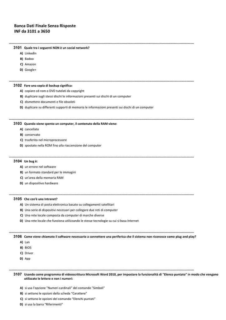 Banca Dati Finale Senza Risposte INF da 3101 a 3650 --------------------------------------------------------------------------------------------------------------------------------------------------------------------------------3101 Quale tra i seguenti NON è un social network? A) LinkedIn B) Badoo C) Amazon D) Google+ --------------------------------------------------------------------------------------------------------------------------------------------------------------------------------3102 Fare una copia di backup significa: A) copiare cd-rom o DVD tutelati da copyright B) duplicare sugli stessi dischi le informazioni presenti sui dischi di un computer C) dismettere documenti e file obsoleti D) duplicare su differenti supporti di memoria le informazioni presenti sui dischi di un computer --------------------------------------------------------------------------------------------------------------------------------------------------------------------------------3103 Quando viene spento un computer, il contenuto della RAM viene: A) cancellato B) conservato C) trasferito nel microprocessore D) spostato nella ROM fino alla riaccensione del computer --------------------------------------------------------------------------------------------------------------------------------------------------------------------------------3104 Un bug è: A) un errore nel software B) un formato standard per le immagini C) un'area della memoria RAM D) un dispositivo hardware --------------------------------------------------------------------------------------------------------------------------------------------------------------------------------3105 Che cos’è una Intranet? A) Un sistema di posta elettronica basato su collegamenti satellitari B) Una serie di dispositivi necessari per collegare due reti di computer C) Una rete locale composta da computer di marche diverse D) Una rete locale che funziona utilizzando le stesse tecnologie su cui si basa Internet --------------------------------------------------------------------------------------------------------------------------------------------------------------------------------3106 Come viene chiamato il software necessario a connettere una periferica che il sistema non riconosce come plug and play? A) Lan B) BIOS C) Driver D) App --------------------------------------------------------------------------------------------------------------------------------------------------------------------------------3107 Usando come programma di videoscrittura Microsoft Word 2010, per impostare la funzionalità di "Elenco puntato" in modo che vengano utilizzate le lettere e non i numeri: A) si usa l'opzione "Numeri cardinali" del comando "Simboli" B) si settano le opzioni della scheda “Carattere” C) si settano le opzioni del comando “Elenchi puntati” D) si usa la barra “Riferimenti” --------------------------------------------------------------------------------------------------------------------------------------------------------------------------------3108 In Microsoft Office Excel, la notazione “$A$11” inserita in una formula indica: A) un riferimento assoluto B) un intervallo C) un tasso di cambio D) tutta la riga 11 --------------------------------------------------------------------------------------------------------------------------------------------------------------------------------3109 In un documento di Microsoft Office Word viene utilizzata l'intestazione al fine: A) di modificare i bordi della prima pagina del documento B) esclusivamente di scrivere nella prima pagina del testo con un carattere diverso dal testo dell’intero documento C) di creare il logo aziendale D) di far ripetere automaticamente un testo o un’immagine in ogni pagina del documento --------------------------------------------------------------------------------------------------------------------------------------------------------------------------------3110 Un banner è: A) un provider gratuito B) un’inserzione pubblicitaria su Internet C) un bonifico elettronico D) un software per la ricerca in Internet --------------------------------------------------------------------------------------------------------------------------------------------------------------------------------3111 Il modem di un computer è una periferica: A) integrata B) di input/output C) volatile D) solo di input --------------------------------------------------------------------------------------------------------------------------------------------------------------------------------3112 I file creati con Microsoft PowerPoint vengono chiamati: A) grafici B) screens C) slide D) presentazioni --------------------------------------------------------------------------------------------------------------------------------------------------------------------------------3113 Nel programma di videoscrittura Microsoft Word, è possibile tagliare una parte selezionata di un testo e incollarla in un altro punto del documento? A) Sì, utilizzando il comando Ctrl+G e poi il comando Ctrl+I B) Sì, utilizzando il comando Ctrl+X e poi il comando Ctrl+V C) Sì, utilizzando il comando Ctrl+C e poi il comando Ctrl+V D) Sì, utilizzando il comando Ctrl+C e poi il comando Ctrl+X --------------------------------------------------------------------------------------------------------------------------------------------------------------------------------3114 Individuare l'indirizzo email corretto. A) http://www.esercito.italiano.it B) [email protected] C) www.esercito.italiano.it D) esercito@[email protected] --------------------------------------------------------------------------------------------------------------------------------------------------------------------------------3115 Per connettersi a Internet è indispensabile avere: A) Internet Explorer B) un motore di ricerca C) un modem D) Outlook ----------------------------------------------------------------------------------------------