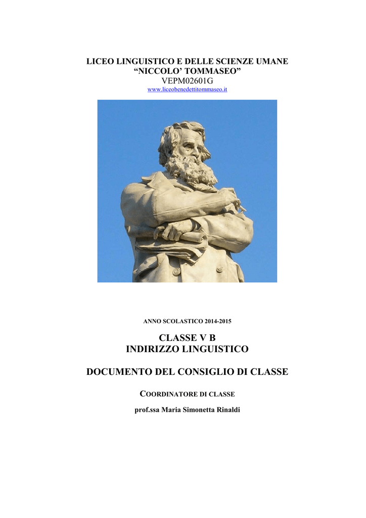 LICEO LINGUISTICO E DELLE SCIENZE UMANE “NICCOLO’ TOMMASEO” VEPM02601G www.liceobenedettitommaseo.it ANNO SCOLASTICO 2014-2015 CLASSE V B INDIRIZZO LINGUISTICO DOCUMENTO DEL CONSIGLIO DI CLASSE COORDINATORE DI CLASSE prof.ssa Maria Simonetta Rinaldi SOMMARIO I. Informazioni di carattere generale 1. Quadro orario annuale degli insegnamenti 2. Finalità del Liceo Linguistico Storia della classe: 1. variazioni nella composizione del Consiglio di classe nel triennio 2. flussi degli studenti nel triennio II. Le attività di competenza del Consiglio di Classe A. Sintetica presentazione della classe B. Programmazione collegiale e sua realizzazione a cura Consiglio di classe: 1. obiettivi raggiunti dal Consiglio di classe con particolare riguardo all'ultimo anno di corso 2. attività programmate e realizzate dal Consiglio di classe e ritenute particolarmente significative 3. eventuali esperienze di ricerca, di progetto, d'area professionalizzante, ecc. p.3- 4 p.5 p. 5 p. 6 del p.7 p.7 p.8 C. GRIGLIA VALUTAZIONE GENERALE p.9 GRIGLIA VALUTAZIONE 1a PROVA SCRITTA p.10 GRIGLIA VALUTAZIONE 2a PROVA SCRITTA GRIGLIA VALUTAZIONE 3a PROVA SCRITTA p. 11 GRIGLIA VALUTAZIONE COLLOQUIO p.11 D. Appendice 1 Esempi di prove pluridisciplinari effettuate in preparazione della 3° prova pp.13-15 III. Attività di competenza dei singoli docenti A. Relazioni finali relative alle discipline dell'ultimo anno di corso a cura dei singoli docenti: Religione p.17 Lingua e Letteratura Italiana p.20 Inglese p.31 Francese Spagnolo pp.37-53 Tedesco p.54 Storia p. 61 Filosofia p.65 Matematica p.69 Fisica p.72 Scienze naturali p.76 Storia dell’Arte p.79 Scienze motorie e sportive p.83 2 DOCUMENTO DEL CONSIGLIO DELLA CLASSE 5°sez.B a.s. 2014-2015 I. Informazioni di carattere generale Il liceo linguistico fornisce una formazione globale, con un curriculum che attiva competenze sia in ambito umanistico, con lo studio dell'italiano, del latino, di tre lingue straniere, della storia, la filosofia e la storia dell'arte, sia in ambito scientifico, con lo studio della matematica, la fisica e le scienze. Nel suo percorso specifico il liceo linguistico guida lo studente ad approfondire e sviluppare le conoscenze, le abilità e le competenze necessarie per acquisire la padronanza comunicativa di tre lingue, oltre l’italiano, e per comprendere criticamente l’identità storica e culturale di tradizioni e civiltà diverse. L'offerta linguistica comprende l’inglese come prima lingua e il francese, lo spagnolo o il tedesco come seconde e terze lingue, con pari ore di studio. La formazione linguistica è sostenuta in ognuna delle tre lingue straniere con la presenza un'ora alla settimana di un docente curricolare di madrelingua, per tutti gli anni di corso. Inoltre, per valorizzare l'integrazione dei saperi, nella classe terza è previsto l’insegnamento in lingua straniera di una disciplina non linguistica e nella classe quarta l’insegnamento di una disciplina non linguistica viene tenuto in una lingua straniera diversa dalla precedente. Al di là dell'indirizzo specifico, come tutti i percorsi liceali il Liceo linguistico fornisce allo studente gli strumenti culturali e metodologici per una comprensione approfondita della realtà, che gli consenta di porsi con un atteggiamento razionale, critico e creativo di fronte alle situazioni, ai fenomeni, ai problemi, mettendolo in grado di continuare in modo efficace il naturale proseguimento negli studi superiori e di aggiornarsi poi adeguatamente, lungo l'intero arco della propria vita. Quadro orario annuale degli insegnamenti MATERIE Lingua e Letteratura Italiana Lingua latina Lingua e cultura straniera 1 Lingua e cultura straniera 2 Lingua e cultura straniera 3 Storia e geografia Storia Filosofia Matematica Fisica Scienze naturali Storia dell‘arte Scienze motorie e sportive I 4 2 4 3 3 3 Religione cattolica o attività alternative II 4 2 4 3 3 3 III 4 IV 4 V 4 3 4 4 3 4 4 3 4 4 2 2 2 2 2 2 2 2 2 2 2 2 2 2 1 1 3 3 2 2 2 2 2 2 2 2 2 2 2 1 1 1 Finalità del Liceo Linguistico “Il percorso del liceo linguistico è indirizzato allo studio di più sistemi linguistici e culturali. Guida lo studente ad approfondire e a sviluppare le conoscenze e le abilità, a maturare le competenze necessarie per acquisire la padronanza comunicativa di tre lingue, oltre l’italiano e per comprendere criticamente l’identità storica e culturale di tradizioni e civiltà diverse”. Gli studenti, a conclusione del percorso di studio, oltre a raggiungere i risultati di apprendimento comuni, dovranno: • avere acquisito in due lingue moderne strutture, modalità e competenze comunicative corrispondenti almeno al Livello B2 del Quadro Comune Europeo di Riferimento; • avere acquisito in una terza lingua moderna strutture, modalità e competenze comunicative corrispondenti almeno al Livello B1 del Quadro Comune Europeo di Riferimento; • saper comunicare in tre lingue moderne in vari contesti sociali e in situazioni professionali utilizzando diverse forme testuali; • riconoscere in un’ottica comparativa gli elementi strutturali caratterizzanti le lingue studiate ed essere in grado di passare agevolmente da un sistema linguistico all’altro; • essere in grado di affrontare in lingua diversa dall’italiano specifici contenuti disciplinari; • conoscere le principali caratteristiche culturali dei paesi di cui si è studiata la lingua, attraverso lo studio e l’analisi di opere letterarie, estetiche, visive, musicali, cinematografiche, delle linee fondamentali della loro storia e delle loro tradizioni; • sapersi confrontare con la cultura degli altri popoli, avvalendosi delle occasioni di contatto e di scambio Storia della classe 1. Variazioni nella composizione del Consiglio di Classe nel triennio 4 DISCIPLINE DEL CURRICOLO 2 Religione o Altro Italiano Latino Lingua Straniera 1 Inglese Lingua Straniera 2 FranceseSpagnolo Lingua Straniera 2 SpagnoloFrancese Lingua Straniera 3 Tedesco( prof.ssa