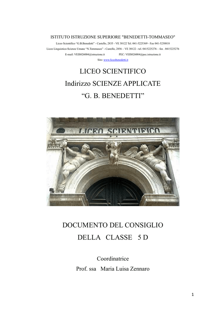 ISTITUTO ISTRUZIONE SUPERIORE "BENEDETTI-TOMMASEO" Liceo Scientifico “G.B.Benedetti” - Castello, 2835 - VE 30122 Tel. 041-5225369 - Fax 041-5230818 Liceo Linguistico-Scienze Umane “N.Tommaseo” - Castello, 2856 – VE 30122 - tel. 0415225276 – fax . 0415225276 E-mail: [email protected] PEC: [email protected] Sito: www.liceobenedetti.it LICEO SCIENTIFICO Indirizzo SCIENZE APPLICATE “G. B. BENEDETTI” DOCUMENTO DEL CONSIGLIO DELLA CLASSE 5 D Coordinatrice Prof. ssa Maria Luisa Zennaro 1 Componenti del consiglio di Classe 5 D Materia Italiano Storia e Filosofia Lingua Straniera (Inglese) Docenti Laura Montagnaro M. Carmela Giuliani Sandra Somma Matematica Fisica Informatica Scienze Disegno e Storia dell'Arte Educazione Fisica Religione M. Luisa Zennaro M. Luisa Zennaro Fabio Saffi Alessandra Rossi M. Gabriella Troilo Fausto Filippis Michele Darisi firma 2 I.I.S “G. B. BENEDETTI – N. TOMMASEO” VENEZIA DOCUMENTO DEL CONSIGLIO DI CLASSE Classe 5D – opzione Scienze Applicate 2014/2015 Anno scolastico Coordinatrice di classe: prof.ssa Maria Luisa Zennaro Presentazione sintetica della classe: a) Storia del triennio della classe A.S. 2012/13: in terza, la classe risulta composta da 22 alunni, tra i quali uno proveniente da altra città. A giugno 6 studenti non sono ammessi alla classe successiva. Sono promossi alla classe successiva 5 alunni a giugno, 11 a settembre. A.S. 2013/14: in quarta, la classe risulta composta solo da 14 alunni, per il trasferimento ad altri Istituti. Nel corso dell’anno si ritira uno studente. A giugno non sono ammessi alla classe successiva 3 studenti. Sono promossi a giugno 5 alunni, 5 a settembre. A.S. 2014/15 all’inizio del quinto anno la classe risulta composta da 10 unità: 3 femmine e 7 maschi; alla fine di ottobre si inserisce un’altra studentessa. b) Continuità didattica nel triennio Materia Italiano Storia e Filosofia Lingua Straniera (Inglese) Anna Mezzaroba Vincenzo Piani Sandra Somma 2012/13 Anna Mezzaroba Aurelia Sandullo Sandra Somma 2013/2014 Laura Montagnaro Maria Carmela Giuliani Sandra Somma 2014/2015 Matematica Fisica Informatica Scienze Disegno e Storia dell'Arte Educazione Fisica Religione Maria Luisa Zennaro Maria Luisa Zennaro Stefano Lissandron Alessandra Rossi M. Gabriella Troilo Fausto Filippis Michele Darisi Maria Luisa Zennaro Maria Luisa Zennaro Fabio Saffi Alessandra Rossi M. Gabriella Troilo Fausto Filippis Michele Darisi Maria Luisa Zennaro Maria Luisa Zennaro Fabio Saffi Alessandra Rossi M. Gabriella Troilo Fausto Filippis Michele Darisi E’ da segnalare che durante il triennio l’insegnamento dell’italiano, di storia, di filosofia e di informatica ha visto l’avvicendarsi di diversi docenti. c) Situazione di partenza della classe e sua evoluzione nell’anno in corso La classe, la prima ad arrivare alla conclusione del nuovo ciclo riformato, inizialmente era costituita da un numero più consistente di studenti, ma negli anni è andata riducendosi fino alla configurazione attuale. Per questo motivo gli studenti rimasti, anno dopo anno, hanno dovuto riequilibrare le dinamiche interne, cercando di sviluppare rapporti tra personalità diverse, di norma molto insicure e poco propense ad esporsi. Comunque il gruppo classe, acquisendo sicurezza, si è dimostrato sufficientemente disponibile al dialogo educativo nelle diverse discipline, partecipando e a volte reagendo con curiosità, secondo i propri interessi, alle proposte dei docenti. L’impegno nello studio è stato profuso in modo e qualità diverse, nelle varie discipline. 3 Non proprio omogenee invece sono risultate le capacità. Alcuni allievi si sono distinti per le buone capacità logiche, per la curiosità intellettuale. Un gruppo ha sviluppato la propria capacità di rielaborazione dei contenuti in modo personale, anche se non sempre critico, conseguendo risultati nel profitto apprezzabili Un gruppo più ampio di studenti ha evidenziato ancora un profilo di fragilità, soprattutto in ambiti specifici. . Per motivi di privacy al presente documento si allega una parte riservata. In generale, la classe ha tenuto un comportamento corretto sia a scuola, con gli insegnanti, che durante le varie uscite didattiche e le iniziative sportive e culturali in cui è stata coinvolta. 2. Obiettivi generali (educativi e formativi) raggiunti La maggior parte degli studenti ha conseguito in misura diversa, ma almeno in modo sufficiente i seguenti obiettivi, comuni a tutte le discipline: complessiva acquisizione ed utilizzazione dei contenuti delle singole discipline e del lessico specifico capacità di analisi di un testo o di un fenomeno, di una costruzione analitica o concettuale, di un modello teorico; capacità di organizzazione delle attività di studio in modo autonomo; La maggioranza degli studenti ha competenze sufficienti nella maggior parte delle discipline. La capacità di trasferire in ambiti diversi le proprie conoscenze e competenze è invece propria di un numero limitato di discenti. 3. Conoscenze, competenze e capacità raggiunte Per quanto concerne conoscenze, competenze e capacità raggiunte nell’ambito delle singole discipline si veda l'Allegato A. 4. Attività extra/para/intercurricolari effettivamente svolte Anno scolastico 2012/13: Alcuni studenti hanno partecipato alle Olimpiadi di Matematica ed altri alle Olimpiadi di Fisica. Uno studente, già impegnato a livello agonistico, ha partecipato ai campionati interistituti di calcio ottenendo buoni risultati. Uno studente ha partecipato ai tornei di scacchi. Uno studente si è impegnato a livello agonistico alle arti marziali. Anno scolastico 2013/14: Galleria dell’Accademia a Venezia Mostra di Vermeer a Bologna Parecchi studenti, già impegnati a livello agonistico, hanno partecipato ai campionati interistituti di calcio, ottenendo buoni risultati. Uno studente ha partecipato ai tornei di scacchi. Uno studente si è impegnato a livello agonistico alle arti marziali. 4 Anno scolastico 2014/15: - 