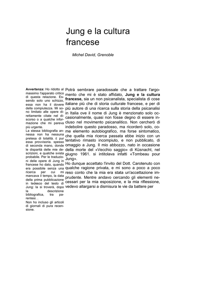 Jung e la cultura francese Michel David, Grenoble Avvertenza: Ho ridotto al massimo l'apparato critico di questa relazione. Essendo solo uno schizzo, essa non ha il dovere della compiutezza. Mi sono limitato alle opere direttamente citate nel discorso o a qualche informazione che mi pareva più urgente. La stessa bibliografia annessa non ha nessuna pretesa di totalità. È pur essa provvisoria. spesso di seconda mano, donde le disparità delle mie descrizioni, e qualche svista probabile. Per le traduzioni delie opere di Jung in francese ho dato, quando era possibile senza una ricerca per cui mi mancava il tempo, la data della prima pubblicazione in tedesco del testo di Jung: la si troverà, dopo la descrizione bibliografica, tra parentesi. . Non ho incluso gli articoli di giornali di pura recensione. Potrà sembrare paradossale che a trattare l'argomento che mi è stato affidato, Jung e la cultura francese, sia un non psicanalista, specialista di cose italiane più che di storia culturale francese, e per di più autore di una ricerca sulla storia della psicanalisi in Italia ove il nome di Jung è menzionato solo occasionalmente, quasi non fosse degno di essere incluso nel movimento psicanalitico. Non cercherò di indebolire questo paradosso, ma ricorderò solo, come elemento autobiografico, ma forse sintomatico, che quella mia ricerca passata ebbe inizio con un tentativo rimasto incompiuto, e non pubblicato, di omaggio a Jung. Il mio abbozzo, nato in occasione della morte del «Vecchio saggio» di Küsnacht, nel giugno 1961. si intitolava infatti «Tombeau pour Jung». Ho dunque accettato l'invito del Dott. Carotenuto con qualche ragione privata, e mi sono a poco a poco reso conto che la mia era stata un'accettazione imprudente. Mentre andavo cercando gli elementi necessari per la mia esposizione, e la mia riflessione, vedevo allargarsi a dismisura le vie da battere per essere esatto, completo e giusto. Da un lato, i frammenti della mia informazione su Jung in Italia mi si ri presentavano come rimorsi per averli trascurati, e mi apparivano troppo inferiori a quello che ormai vedevo essere stato il vero passaggio di Jung nel mondo italiano, d'altra parte il campo francese (e meglio ancora francofono, o francografo) mi rivelava un vastissimo terreno d'indagine, quasi vergine di ricerche preliminari, e da esplorare a lungo. Anzi, mi accorgevo che sarebbe impresa urgente, e bell'argomento di «thèse d'état» universitaria, lo studio sistematico dell'apporto junghiano ad una cultura sempre divisa e fermentante. Il mio sarà dunque un molto provvisorio sguardo su quanto io abbia potuto radunare in breve tempo e brevissimo spazio. Potesse essere almeno una traccia per l'augurata impresa. Jung non ha provocato affatto le reazioni che Freud suscitò nel primo apparire delle sue teorie, e per parecchie ragioni. Freud ebbe la funzione di portare, per primo, la «peste» e lo scandalo, di venire assunto dalle mitologie come una specie di papa nero con scomuniche è definizioni di ortodossia, di formulare sin dal primo testo importante i principali termini della sua dottrina e del suo metodo, di appoggiarsi su delle istituzioni quasi subito internazionali oltre che nazionali, su delle riviste rigidamente ortodosse, su una casa editrice. La sua psicanalisi fu ben presto trasformata in una «rappresentazione» sociale schematica ed efficace (Serge Moscovic l'ha analizzata con maestria per il campo francese, ed è significativo che Jung sia assente dalle rappresentazioni cosi ricostruite). Jung ebbe tutt’altra condotta nel pubblicarsi: scritti dispersi, riprese, ritocchi, poca organizzazione istituzionale, almeno prima del 1940, non una rivista propria, deboli nuclei nazionali, fuorché in Svizzera e nei paesi anglosassoni, una teoria in fieri e fluida. Insomma, non ci fu un terremoto junghiano. Anzi, Jung fu soprattutto, ed è tuttora, ricordato nelle volgarizzazioni di ogni tipo, come quello che si separò dal Fondatore per offrire alla cultura moderna alcune parole (complesso, archetipo, Animus/Anima, Intro/extraversione, Persona, ombra, in- conscio collettivo) ed altrettanti concetti, di uso più facile perché apparentemente ripresi dalla cultura greco-latina tradizionale. Non seppe,— e forse non lo cercò —, drammatizzare. Cosi, la sua introduzione in una cultura appare più difficile a seguirsi, perché egli non pare averla modificata radicalmente, ma solo aver dato ad essa una certa nuova luce, e direi come un nuovo profumo. Ma poi con la cultura francese Jung aveva dei problemi specifici. Mi permetterò di riprendere qui il discorso che nel 1943. Roland CahenSalabelle, il più noto oggi degli junghiani francesi, premetteva alla sua antologia sintetica di Jung (L'homme a la découverte de soi-mème), mentre iniziava la seconda fase della divulgazione francese del maestro zurighese: «All'origine di questo volume e dell'ambizione di presentare questa traduzione al pubblico francese sta uno stupore. Ci siamo stupiti che l'opera di Jung, la quale gode nei paesi di lingua inglese e tedesca di una fama sempre crescente, sia cosi poco conosciuta in Francia, dove. quand'anche venga conosciuta, è, raramente intesa ed apprezzata come merita [...]. Bisognava attribuire la causa a Jung stesso, a uno stato mentale del pubblico francese o allo spirito francese tout court? Si doveva forse accusare qualche antinomia o qualche incompatibilità radicale? [...] Jung, cui il silenzio fatto nel nostro paese intorno alla sua opera non è sfuggito, ha acconsentito a indicarci le ragioni che gli parevano esserne causa. I Francesi, a suo parere, nelle cose dello spirito, sono poco aperti al punto di vista empirico e alle esigenze della fenomenologia. O appartengono alla Chiesa, la quale risponde alle domande che le sembrano lecite e ostacola le altre, oppure sono usciti dalla Chiesa e tentano quindi, dal di fuori, di darle assalto. Ma, nei due casi, la Chiesa occupa un posto d'onore nello spirito francese che 
