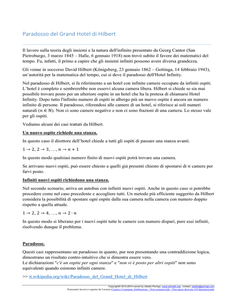 Paradosso del Grand Hotel di Hilbert Il lavoro sulla teoria degli insiemi e la natura dell'infinito presentato da Georg Cantor (San Pietroburgo, 3 marzo 1845 β Halle, 6 gennaio 1918) non trovò subito il favore dei matematici del tempo. Fu, infatti, il primo a capire che gli insiemi infiniti possono avere diversa grandezza. Gli venne in soccorso David Hilbert (Königsberg, 23 gennaio 1862 β Gottinga, 14 febbraio 1943), unβautorità per la matematica del tempo, cui si deve il paradosso dell'Hotel Infinity. Nel paradosso di Hilbert, si fa riferimento a un hotel con infinite camere occupate da infiniti ospiti. Lβhotel è completo e sembrerebbe non esservi alcuna camera libera. Hilbert si chiede se sia mai possibile trovare posto per un ulteriore ospite in un hotel che ha la pretesa di chiamarsi Hotel Infinity. Dopo tutto l'infinito numero di ospiti in albergo più un nuovo ospite è ancora un numero infinito di persone. Il paradosso, riferendosi alle camere di un hotel, si riferisce ai soli numeri naturali (π β β). Non ci sono camere negative e non ci sono frazioni di una camera. Lo stesso vale per gli ospiti. Vediamo alcuni dei casi trattati da Hilbert. Un nuovo ospite richiede una stanza. In questo caso il direttore dellβhotel chiede a tutti gli ospiti di passare una stanza avanti. 1 β 2, 2 β 3, β¦, π β π + 1 In questo modo qualsiasi numero finito di nuovi ospiti potrà trovare una camera. Se arrivano nuovi ospiti, può essere chiesto a quelli già presenti chiesto di spostarsi di π camere per farvi posto. Infiniti nuovi ospiti richiedono una stanza. Nel secondo scenario, arriva un autobus con infiniti nuovi ospiti. Anche in questo caso si potrebbe procedere come nel caso precedente e accogliere tutti. Un metodo più efficiente suggerito da Hilbert considera la possibilità di spostare ogni ospite dalla sua camera nella camera con numero doppio rispetto a quella attuale. 1 β 2, 2 β 4, β¦, π β 2 β π In questo modo si liberano per i nuovi ospiti tutte le camere con numero dispari, pure essi infiniti, risolvendo dunque il problema. Paradosso. Questi casi rappresentano un paradosso in quanto, pur non presentando una contraddizione logica, dimostrano un risultato contro-intuitivo che si dimostra essere vero. Le dichiarazioni "c'è un ospite per ogni stanza" e "non vi è posto per altri ospiti" non sono equivalenti quando esistono infiniti camere. >> it.wikipedia.org/wiki/Paradosso_del_Grand_Hotel_di_Hilbert Copyright© 2012-2014 owned by Ubaldo Pernigo, www.ubimath.org - contact: [email protected] Il presente lavoro è coperto da Licenza Creative Commons Attribuzione - Non commerciale - Non opere derivate 4.0 Internazionale Copyright© 2012-2014 owned by Ubaldo Pernigo, www.ubimath.org - contact: [email protected] Il presente lavoro è coperto da Licenza Creative Commons Attribuzione - Non commerciale - Non opere derivate 4.0 Internazionale