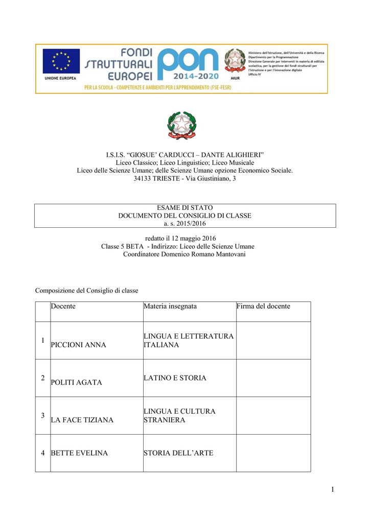 I.S.I.S. “GIOSUE’ CARDUCCI – DANTE ALIGHIERI” Liceo Classico; Liceo Linguistico; Liceo Musicale Liceo delle Scienze Umane; delle Scienze Umane opzione Economico Sociale. 34133 TRIESTE - Via Giustiniano, 3 ESAME DI STATO DOCUMENTO DEL CONSIGLIO DI CLASSE a. s. 2015/2016 redatto il 12 maggio 2016 Classe 5 BETA - Indirizzo: Liceo delle Scienze Umane Coordinatore Domenico Romano Mantovani Composizione del Consiglio di classe 1 2 3 Docente Materia insegnata PICCIONI ANNA LINGUA E LETTERATURA ITALIANA POLITI AGATA LA FACE TIZIANA 4 BETTE EVELINA Firma del docente LATINO E STORIA LINGUA E CULTURA STRANIERA STORIA DELL’ARTE 1 5* MANTOVANI DOMENICO SCIENZE UMANE E FILOROMANO SOFIA 6 * BALSAMO CONSIGLIA 7 LOI ELISA 8 * CESCHIA MONICA MATEMATICA E FISICA SCIENZE NATURALI SCIENZE MOTORIE E SPORTIVE 9 PORZIO ELENA RELIGIONE CATTOLICA 10 BILARDO SIMONA SOSTEGNO AREA UMANISTICA 11 FLORA LINDA SOSTEGNO AREA UMANISTICA 12 ULCIGRAI PIERPAOLO SOSTEGNO AREA SCIENTIFICA 13 CIANCIMINO CALOGERO SOSTEGNO AREA SCIENTIFICA (*) commissario interno Il Dirigente Scolastico Prof.ssa Oliva Quasimodo 2 ALUNNI DELLA CLASSE 5 B/SU 1. ALTIN CATERINA 2. BOSTICCO JESSICA 3. CAVALLINI DESIREE 4. CAVALLO ANTONELLA MAILA 5. COCCHI GIACOMO 6. COLLICA CELESTE 7. ELZERI JENNIFER 8. GARDINA ALESSIA 9. GASPERINI ANNASOFIA 10. LIVERIS LARA 11. MEREGALLI MARGHERITA 12. PERINI DANIELA 13. SIMONESCHI ARIANNA 14. SPANGHERO FRANCESCA 15. TAMIMI SARA Presentazione sintetica della classe La classe è composta da quindici alunni (quattordici femmine e un maschio). Nella progettazione del Consiglio di Classe sono state adottate due Programmazioni Educative Individualizzate. Nell’arco del secondo biennio e nell’ultimo anno, la composizione numerica del gruppo classe ha subito le seguenti oscillazioni, attribuite a ritiri, nuovi inserimenti, non ammissioni e cambi di sezione. Nello specifico: • alla fine del terzo anno, su un totale di ventuno studenti, vi è stata una non ammissione alla classe quarta; • alla fine del quarto anno, su un totale di diciassette studenti, la situazione è stata la seguente: tre studenti non sono stati ammessi alla classe quinta; tre studenti non sono stati ammessi per mancata validità dell’anno scolastico, avendo superato il numero di assenze consentito; • all'inizio del quinto anno sono state inserite nella classe quattro studentesse, di cui una proveniente dal nostro istituto e tre giunte da istituti esterni. Nel corso del triennio è stata mantenuta la continuità didattica nelle seguenti discipline: italiano, matematica e fisica, scienze naturali, inglese, storia dell’arte, scienze umane, filosofia, scienze motorie, storia. Dal quarto anno, latino è stato assegnato alla docente di storia. 3 La competenza relazionale degli studenti ha subito un processo evolutivo, al variare della composizione numerica della classe e all’inserimento di nuove studentesse, portatrici di diverse esperienze personali e formative. Così, si è giunti al quinto anno, in cui si rileva un discreto equilibrio socio-ambientale e una maturazione in merito alla responsabilità nello studio, alla frequenza scolastica, alla messa in comune delle proprie esperienze. In questo ha sicuramente influito la continuità didattica e la varietà dei metodi e degli approcci proposti dai docenti. Sebbene il gruppo si presenti eterogeneo per competenze e per capacità di rielaborazione autonoma dei contenuti, soprattutto sotto l’aspetto formale, è stata rilevata una buona disponibilità all’impegno scolastico, richiesto nelle singole discipline; e un soddisfacente grado di motivazione e di partecipazione, rispetto agli obiettivi didattici e formativi. Un cenno particolare va fatto all’aspetto espressamente relazionale, nel quale si è notato un progressivo superamento di alcune divergenze negli atteggiamenti. Obiettivi educativi e formativi generali raggiunti La maggiore o minore attitudine nelle aree formative ha allargato la forbice delle prestazioni sui tre livelli standard formalmente richiesti (alto, medio, basso). Per ulteriori aspetti, e per un riscontro mirato su alcune debolezze d’area, si rimanda alle singole relazioni dei docenti. La classe ha complessivamente raggiunto i seguenti obiettivi generali, con alcune differenze individuali. • Elaborazione personale dei contenuti; • Capacità relazionali nei contesti interpersonali e nei gruppi di lavoro; • Propensione al confronto con teorie e strumenti, utili a comprendere la diversità della realtà scientifica, sociale e umana. • Strategie autonome o guidate, per confrontarsi con discipline di studio, strumenti, ambienti e persone. Alcuni alunni hanno raggiunto chiarezza nell’esposizione di giudizi autonomi e capacità logiche di astrazione (analisi e sintesi) e di collegamento con altre materie di studio. Abilità e competenze raggiunte Nel corso del secondo biennio e nell’ultimo anno di studi, gli studenti hanno raggiunto mediamente le seguenti abilità e competenze, pur diversificandosi i soggetti per attitudine, impegno e stile cognitivo. · usare la lingua italiana in vari contesti comunicativi e attraverso registri linguistici diversi per comprendere e produrre documenti e testi di varia tipologia in riferimento all’attività svolta; · comunicare in una prima lingua comunitaria almeno a livello B1/B2 ; · riferire ai diversi contesti le conoscenze dei principali campi d’indagine delle scienze umane mediante gli apporti specifici e interdisciplinari della cultura pedagogica, psicologica e socioantropologica; · utilizzare le tecnologie dell’informazione e della comunicazione per studiare, fare ricerca, comunicare; · utilizzare le procedure tipiche del pensiero matematico e il linguaggio formale specifico per descrivere fenomeni reali e analizzarli; · riconoscere i contenuti fondamentali delle scienze fisiche e delle scienze naturali, le procedure e i metodi di indagine propri. Esperienze progettuali significative realizzate nel cors