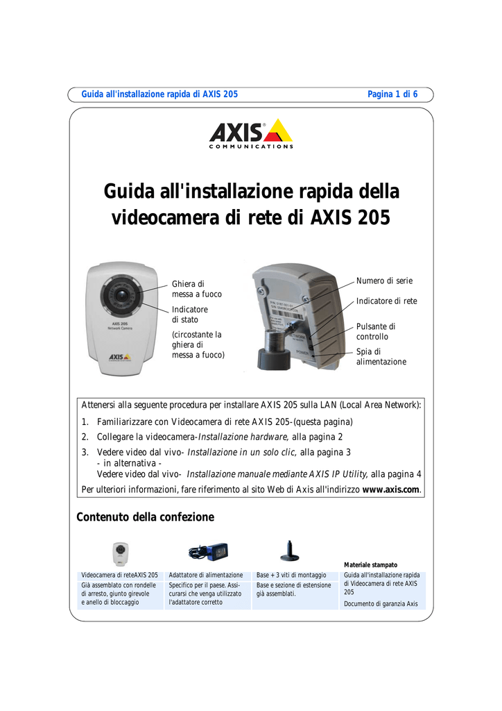 Guida all`installazione rapida della videocamera di rete di AXIS 205