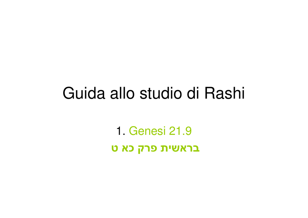 Guida allo studio di Rashi 1. Genesi 21.9 בראשית פרק כא ט Genesi 21.9 בראשית פרק כא ט Il verso di cui ci occupiamo è il nono di Genesi 21, che racconta lo scontro tra Sara e Hagar ותרא שרה את בן הגר המצרית אשר ילדה לאברהם :מצחק Genesi 21.9 בראשית פרק כא ט בראשית פרק כא ט ותרא שרה את בן הגר המצרית אשר ילדה לאברהם :מצחק watère Sarà et ben Hagar hamitzrìt ashèr yaledà leAvrahàm metzachèq Sara vide scherzare il figlio di Hagar l’egiziana, che aveva procreato ad Abramo Genesi 21.9 בראשית פרק כא ט Sara era la moglie legittima di Abramo, che in vecchiaia gli partorisce Itzchaq Hagar era la schiava egiziana di Sara da lei data ad Abramo per fargli un figlio Questo figlio, il primo che nasce è Ishmael Quando nasce Itzchaq la rivalità si scatena. Genesi 21.9 בראשית פרק כא ט Di questo verso רש"יcommenta la parola metzacheq מצחק Genesi 21.9 בראשית פרק כא ט מצחק Come premessa dobbiamo sapere che la parola deriva dalla radice צחקtz-ch-q, nella forma pi’èl al presente (come medabèr, mevarèkh ecc.) La radice può significare varie cose, ma prima di tutto indica il riso, lo scherzo... Genesi 21.9 בראשית פרק כא ט .... il riso, lo scherzo. Quindi sembrerebbe che Ishmaèl stia solo scherzando. Ma dal racconto della Torà apprendiamo che Sarà non apprezza affatto questo comportamento e chiede che madre e figlio siano cacciati via. Evidentemente non c’è solo lo scherzo. Cosa c’è? Arriva il commento a dircelo. Genesi 21.9 בראשית פרק כא ט רש"יcommentando la parola metzacheq מצחק suggerisce tre interpretazioni: בראשית פרק כא ט Genesi 21.9 Ecco Rashì per intero: רש"י בראשית פרק כא )ט( מצחק -לשון עבודה זרה ,כמו שנאמר )שמות לב ו( ויקומו לצחק .דבר אחר לשון גילוי עריות ,כמה דתימא )להלן לט יז( לצחק בי .דבר אחר לשון רציחה כמו )ש"ב ב יד( יקומו נא הנערים וישחקו לפנינו וגו': Genesi 21.9 בראשית פרק כא ט La prima intepretazione: כמו שנאמר )שמות לב, לשון עבודה זרה- )ט( מצחק .ו( ויקומו לצחק Leshon ‘avodà zarà, kemo sheneemàr (Shemot lamed bet waw) “wayaqumu letzacheq” L’espressione indica un culto estraneo, come è detto (Esodo 32:6) “si alzarono letzacheq” Genesi 21.9 בראשית פרק כא ט La seconda interpretazione: ( כמה דתימא )להלן לט יז,דבר אחר לשון גילוי עריות ..לצחק בי Davar acher, leshòn ghilùi ‘arayòt, kèma detèma (lehalan lamed tet yod zain) “letzacheq bi” Altra spiegazione: L’espressione indica un rapporto sessuale proibito, come è detto (Genesi, 39:17) “letzacheq con me” Genesi 21.9 בראשית פרק כא ט La terza interpretazione: דבר אחר לשון רציחה כמו )ש"ב ב יד( יקומו נא :'הנערים וישחקו לפנינו וגו Davar acher, leshòn retzichà, kemò (Shemuel bet, bet yod dalet) “yaqùmu na hane’arim weischaqu lefanenu” Altra spiegazione: L’espressione indica l’omicidio, come (2 Sam. 2:14) “vengano i ragazzi weischaqù davanti a noi” Genesi 21.9 בראשית פרק כא ט La tecnica di Rashi, a prima vista è questa: 1. La parola è enigmatica e può essere spiegata in vari modi. 2. Per spiegarla si può vedere che senso ha in altri contesti. 3. Quindi si va a cercare qualche esempio, se ne ricava il significato e si applica al nostro verso. Genesi 21.9 בראשית פרק כא ט Vediamo che succede nel primo caso: In Esodo 32:6 si parla del vitello d’oro. La Torà racconta che dopo averlo costruito “si alzarono letzacheq” ויקומו לצחק. Potrebbe significare che “usarono comportamenti disinvolti”, fecero una specie di orgia... Genesi 21.9 בראשית פרק כא ט .... una specie di orgia. Rashi se ne serve per dire che il verbo indica genericamente il comportamento di chi segue un culto estraneo. Genesi 21.9 בראשית פרק כא ט “un culto estraneo” E’ la traduzione letterale di ‘ עבודה זרהavodà zarà, genericamente, ma non esattamente “idolatria”: ogni culto differente dal puro monoteismo ebraico. Quindi Ishmaèl in quel momento si comportava da idolatra. Genesi 21.9 בראשית פרק כא ט Attenzione alla lingua di Rashi (1): quando dà una spiegazione linguistica, come in questo caso, la introduce con il termine לשון leshòn, forma costrutta (semikhùt) di lashòn che significa letteralmente “lingua di”, come per dire: “l’espressione indica...”. Genesi 21.9 בראשית פרק כא ט Vediamo il secondo caso: In Genesi 39:17 si racconta della moglie di Potifar che denuncia Yosef per quelle che oggi chiameremmo “molestie sessuali”: לצחק ביletzacheq bi. Quindi il verbo indica comportamenti sessuali disinvolti. E’ la seconda possibile accusa nei confronti di Ishmaèl. Genesi 21.9 בראשית פרק כא ט E ora il terzo caso: In 2 Samuele 2:14 si racconta dello scontro tra 12 fedeli di David e 12 fedeli di Saul, che porta a una reciproca strage. Il verbo che lo introduce è וישחקו לפנינו wischequ lefanenu , letteralmente “giochino davanti a noi”... Genesi 21.9 בראשית פרק כא ט ...“giochino davanti a noi” Il termine è equivoco, potrebbe trattarsi di giochi, ma sono giochi di guerra e la partita finisce tragicamente. Tra l’altro non è esattamente la radice tz-chq, ma quella simile s-ch-q. In ogni caso Rashi se ne serve per formulare la terza accusa a Ishmael: comportamento omicida Genesi 21.9 בראשית פרק כא ט Attenzione alla lingua di Rashi (2): quando deve dimostrare qualcosa sulla base di un verso, prima di citarlo usa una di tre espressioni diverse: kemo sheneemaàr, come è detto כמו שנאמר, kema detema (idem),