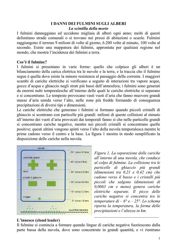 I DANNI DEI FULMINI SUGLI ALBERI La scintilla della morte I fulmini danneggiano ed uccidono migliaia di alberi ogni anno; molti di questi delimitano strade comunali o si trovano nei pressi di abitazioni o scuole. Fulmini raggiungono il terreno 9 milioni di volte al giorno, 6.200 volte al minuto, 100 volte al secondo. Esiste una mappatura dei fulmini, approntata per qualsiasi regione nel mondo, che mostra l’incidenza dei fulmini a terra. Cos’è il fulmine? I fulmini si presentano in varie forme: quello che colpisce gli alberi è un bilanciamento della carica elettrica tra le nuvole e la terra, e la traccia che il fulmine segue è quella dove esiste la minore resistenza al passaggio della corrente. I maggiori scambi di cariche elettriche si verificano a seguito di interazioni tra vapore acque, gocce d’acqua e ghiaccio negli strati più bassi dell’atmosfera; i fulmini sono generati da enormi nubi temporalesche all’interno delle quali le cariche elettriche si separano e si concentrano. Le tempeste provocano vasti vuoti d’aria che fanno muovere grandi masse d’aria umida verso l’alto, nelle zone più fredde formando di conseguenza precipitazioni di diversi tipi e dimensioni. Le cariche elettriche che generano i fulmini si formano quando piccoli cristalli di ghiaccio si scontrano con particelle più grandi: milioni di queste collisioni al minuto all’interno dei vuoti d’aria provocati dai temporali fanno sì che nelle particelle grandi si concentrano cariche negative, mentre nei piccoli cristalli si concentrano quelle positive; questi ultimi vengono spinti verso l’alto della nuvola temporalesca mentre le prime cadono verso il centro e la base. La figura 1 mostra in modo semplificato la disposizione delle cariche nella nuvola. _______________________________ Figura 1. La separazione delle cariche all’interno di una nuvola, che conduce al colpo di fulmine. La collisione tra le particelle di ghiaccio più grandi (dimensioni tra 0,21 e 0,42 cm) che cadono verso il basso e i cristalli più piccoli che salgono (dimensioni di 0,0063 cm e meno) genera cariche elettriche separate. Il picco delle cariche negative si concentra tra le temperature di – 6° e – 25°. Lo schema riporta la temperatura, la forma delle precipitazioni e l’altezza in km. _______________________________ L’innesco (cloud leader) Il fulmine si comincia a formare quando lingue di cariche negative fuoriescono dalla parte bassa della nuvola, dove sono concentrate in grandi quantità, e vi rientrano 1 continuamente. Queste lingue sono come inneschi; si muovono lungo linee dove è più bassa la resistenza elettrica. Il loro percorso è influenzato dalle linee delle precipitazioni, da precedenti percorsi tracciati da altri fulmini e perfino dalle linee dei raggi cosmici. La forma spezzata assunta dal fulmine è data da quello scalettato delle lingue che pendono dalla nuvola. I loro movimenti sono rapidissimi, potendo muoversi verso il terreno a circa 450.000 miglia all’ora (Figura 1). I flussi a terra Poiché le cariche positive e quelle negative si attraggono, un’ondata di cariche positive si espande sotto la base della nuvola; questa ondata segue dal basso la tempesta e si innalza verso il suo bordo inferiore utilizzando ogni oggetto che sia collegato al terreno. Dove il terreno forma dei picchi (come le cime degli alberi), le cariche elettriche positive formano dei flussi, una sorta di bandiere formate da fasci di cariche che sventolano in cima ai punti più alti del terreno o in cima alle costruzioni (Figura 2). _______________________________ Figura 2. Le fasi più importanti nello sviluppo di un fulmine: 1) gli inneschi si spingono al di fuori della nuvola temporalesca verso terra; 2) i fasci di terra fuoriescono dalla sommità di oggetti elevati; 3) inneschi e fasci di terra si uniscono creando un tracciato lungo il quale scorre lo scambio delle cariche; 4) massiccio scambio di cariche ed emissione luminosa. ____________________________________________________________________ Gli alberi isolati ed alti danno la possibilità di concentrare i flussi a terra e possono fungere da conduttori per lo scambio delle cariche. Quando gli inneschi si avvicinano alla terra (tra 100 e 400 miglia da essa o da oggetti elevati) si connettono con i fasci provenienti dal basso, formando il percorso attraverso il quale si produce un rapido e massiccio scambio di cariche; la luce che viene liberata nello scambio forma il fulmine (Figura 2). Il colpo Quando il percorso è chiuso, la luce del fulmine è visibile perché viaggia ad una velocità pari ad un terzo di quella della luce, illuminando e riscaldando istantaneamente l’aria; solitamente in un unico fulmine si verificano diversi scambi di cariche elettriche (con una media di tre o quattro colpi). Ogni colpo può durare alcuni 2 millisecondi; la durata complessiva del fulmine, inclusi gli spazi tra i colpi, è di circa un mezzo secondo. L’occhio umano può appena distinguere i vari lampi di un unico colpo, ricevendo l’impressione che il fulmine lampeggi. Poiché la resistenza dell’aria varia con rapidità, i lampi di un unico colpo non sempre seguono lo stesso percorso; inoltre, i punti del terreno con i quali il fulmine scambia le cariche elettriche possono essere distanti più di un miglio l’uno dall’altro, ma di solito sono abbastanza raggruppati. In una fila di alberi si possono verificare danni provenienti dai diversi colpi di un solo fulmine; in qualunque punto del percorso di una scarica, il fulmine può saltare da un oggetto all’altro, passando ad esempio da un albero ad una costruzione o una persona. Lo scambio di carica trasportato da un fulmine può variare molto, attestandosi comunque su una media di 100 milioni di volt e 35.000 ampere; il nocciolo interno ha dimensioni che vanno da 2 a 12 pollici di diametro con un luminoso alone circostante largo da 3 a 15 piedi ed una temperatura interna di oltre 30.000 gradi Fahrenheit. Il calore svilup
