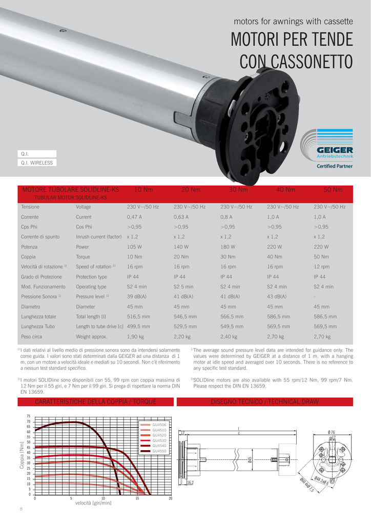 motors for awnings with cassette MOTORI PER TENDE CON CASSONETTO Q.I. Q.I. WIRELESS Certified Partner MOTORE TUBOLARE SOLIDLINE-KS 10 Nm 20 Nm 30 Nm 40 Nm 50 Nm TUBULAR MOTOR SOLIDLINE-KS Tensione Voltage 230 V~/50 Hz 230 V~/50 Hz 230 V~/50 Hz 230 V~/50 Hz 230 V~/50 Hz Corrente Current 0,47 A 0,63 A 0,8 A 1,0 A 1,0 A Cps Phi Cos Phi >0,95 >0,95 >0,95 >0,95 >0,95 Corrente di spunto Inrush current (factor) x 1,2 x 1,2 x 1,2 x 1,2 x 1,2 Potenza Power 105 W 140 W 180 W 220 W 220 W Coppia Torque 10 Nm 20 Nm 30 Nm 40 Nm 50 Nm Velocità di rotazione 2) Speed of rotation 2) 16 rpm 16 rpm 16 rpm 16 rpm 12 rpm Grado di Protezione Protection type IP 44 IP 44 IP 44 IP 44 IP 44 Mod. Funzionamento Operating type S2 4 min S2 5 min S2 4 min S2 4 min S2 4 min Pressione Sonora 1) Pressure level 1) 39 dB(A) 41 dB(A) 41 dB(A) 43 dB(A) - Diametro Diameter 45 mm 45 mm 45 mm 45 mm 45 mm Lunghezza totale Total length [l] 516,5 mm 546,5 mm 566,5 mm 586,5 mm 586,5 mm Lunghezza Tubo Length to tube drive [c] 499,5 mm 529,5 mm 549,5 mm 569,5 mm 569,5 mm Peso circa Weight approx. 2,20 kg 2,40 kg 2,70 kg 2,70 kg 1,90 kg 1) I dati relativi al livello medio di pressione sonora sono da intendersi solamente come guida. I valori sono stati determinati dalla GEIGER ad una distanza di 1 m, con un motore a velocità ideale e mediati su 10 secondi. Non c’è riferimento a nessun test standard specifico. 1) The average sound pressure level data are intended for guidance only. The values were determined by GEIGER at a distance of 1 m, with a hanging motor at idle speed and averaged over 10 seconds. There is no reference to any specific test standard. 2) I motori SOLIDline sono disponibili con 55, 99 rpm con coppia massima di 12 Nm per il 55 giri, e 7 Nm per il 99 giri. Si prega di rispettare la norma DIN EN 13659. 2) SOLIDline motors are also available with 55 rpm/12 Nm, 99 rpm/7 Nm. Please respect the DIN EN 13659. GU4506 GU4510 GU4520 l c 17 Ø 76 12 GU4530 GU4540 GU4550 Ø48 xØ 04 16,2 Ø6 7,5 8 75 70 65 60 55 50 45 40 35 30 25 20 15 10 5 0 DISEGNO TECNICO / TECHNICAL DRAW Ø45 Coppia [Nm] CARATTERISTICHE DELLA COPPIA / TORQUE 0 5 10 velocità [giri/min] 15 20 2xØ 6 MOTORE SOLIDline Q.I. SOLIDline Q.I. Q.I. POTENZA / VELOCITÀ ARTICOLO / CODE VERSIONE SILENT 30 Nm/16 rpm M45KS30E/QI M45KS30E/QI/S 40 Nm/16 rpm M45KS40E/QI M45KS40E/QI/S 50 Nm/12 rpm M45KS50E/QI M45KS50E/QI/S 12 Nm/55 rpm M45KS1255E/QI M45KS1255E/QI/S SOLIDline Q.I.: Motore con finecorsa elettronico. Regolazione dei finecorsa: dare input di discesa al sistema fino alla posizione di finecorsa inferiore, dopodiché effettuare il movimento contrario senza fermarsi in modo da posizionare il finecorsa superiore tramite coppia. Autoregolazione del finecorsa superiore perpetua; riconoscimento ostacolo in salita ed in discesa. Disponibile in versione da 30, 40 Nm con velocità 16 Rpm, 50 Nm con velocità 12 Rpm e 12 Nm a 55 Rpm. SOLIDline Q.I.: Tubolar motor with electronic endstop. For setting the enstops: input down the awning until the lower endstop posistion, than move the awning on the opposite side without stopping it, so the upper endstop will be setted by torque. Autoregulation of the endstop; obstacle detection up and down. Available with: 30 Nm/16 rpm, 40 Nm/16 rpm, 50 Nm/12 rpm, 12 Nm/55 rpm. MOTORE SOLIDline Q.I. WIRELESS SOLIDline Q.I. WIRELESS Q.I. WIRELESS POTENZA / VELOCITÀ ARTICOLO / CODE VERSIONE SILENT 30 Nm/16 rpm M45KS30W/QI M45KS30W/QI/S 40 Nm/16 rpm M45KS40W/QI M45KS40W/QI/S 50 Nm/12 rpm M45KS50W/QI M45KS50W/QI/S 12 Nm/55 rpm M45KS1255W/QI M45KS1255W/QI/S SOLIDline Q.I. Wireless: Motore con radio integrata con finecorsa elettronico. Regolazione dei finecorsa tramite radiocomando GEIGER: dare input di discesa al sistema fino alla posizione di finecorsa inferiore, dopodiché effettuare il movimento contrario senza fermarsi in modo da posizionare il finecorsa superiore tramite coppia. Autoregolazione del finecorsa superiore perpetua; riconoscimento ostacolo in salita ed in discesa. Disponibile in versione da 30, 40 Nm con velocità 16 Rpm, 50 Nm con velocità 12 Rpm e 12 Nm a 55 Rpm. SOLIDline Q.I. Wireless: Tubolar motor wireless with electronic endstop. For setting the enstops with GEIGER transmitter: input down the awning until the lower endstop posistion, than move the awning on the opposite side without stopping it, so the upper endstop will be setted by torque. Autoregulation of the endstop; obstacle detection up and down. Available with: 30 Nm/16 rpm, 40 Nm/16 rpm, 50 Nm/12 rpm, 12 Nm/55 rpm. VERSIONE SILENT SILENT VERSION Tutti i motori sono disponibili in versione SILENT: il motore più silenzioso al mondo. Ogni motore viene opportunamente modificato sia nella componentistica interna, che nella scelta dei materiali del tubolare al fine di ridurre le vibrazioni e di conseguenza il rumore generato dal funzionamento. Per poter usufruire della silenziosità massima si consiglia l’utilizzo dell’opportuno supporto (KSSUPP/S) anch’esso progettato per ottenere il massimo delle prestazioni. All the tubolar motors are available on SILENT Version: The most silent motor in the world. Each motor has different inside components for having a reduction of noise and vibrations. For having the maximum silent performance please use the support KSSUPP/S. SOLIDline Ø 51,1 dB(A) 60 55 SOLIDline SILENT Ø 43,2 dB(A) 50 45 35 15 10 5 0 rumore di arresto 20 rumore di funzionamento 25 rumore di arresto 30 rumore di funzionamento dB(A) 40 livello di rumore di fondo Ø 26,0 dB(A) 9