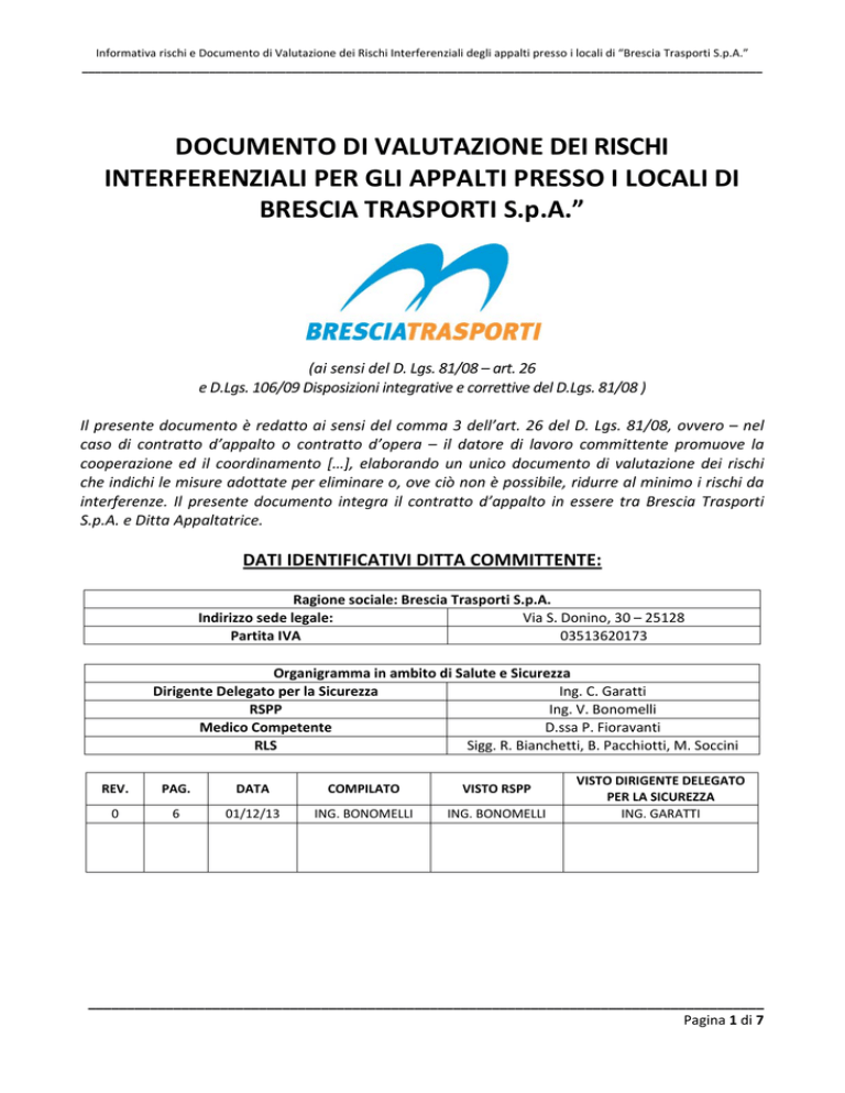 Informativa rischi e Documento di Valutazione dei Rischi Interferenziali degli appalti presso i locali di “Brescia Trasporti S.p.A.” ___________________________________________________________________________________________________________ DOCUMENTO DI VALUTAZIONE DEI RISCHI INTERFERENZIALI PER GLI APPALTI PRESSO I LOCALI DI BRESCIA TRASPORTI S.p.A.” (ai sensi del D. Lgs. 81/08 – art. 26 e D.Lgs. 106/09 Disposizioni integrative e correttive del D.Lgs. 81/08 ) Il presente documento è redatto ai sensi del comma 3 dell’art. 26 del D. Lgs. 81/08, ovvero – nel caso di contratto d’appalto o contratto d’opera – il datore di lavoro committente promuove la cooperazione ed il coordinamento […], elaborando un unico documento di valutazione dei rischi che indichi le misure adottate per eliminare o, ove ciò non è possibile, ridurre al minimo i rischi da interferenze. Il presente documento integra il contratto d’appalto in essere tra Brescia Trasporti S.p.A. e Ditta Appaltatrice. DATI IDENTIFICATIVI DITTA COMMITTENTE: Ragione sociale: Brescia Trasporti S.p.A. Indirizzo sede legale: Via S. Donino, 30 – 25128 Partita IVA 03513620173 Organigramma in ambito di Salute e Sicurezza Dirigente Delegato per la Sicurezza Ing. C. Garatti RSPP Ing. V. Bonomelli Medico Competente D.ssa P. Fioravanti RLS Sigg. R. Bianchetti, B. Pacchiotti, M. Soccini REV. PAG. DATA COMPILATO VISTO RSPP 0 6 01/12/13 ING. BONOMELLI ING. BONOMELLI VISTO DIRIGENTE DELEGATO PER LA SICUREZZA ING. GARATTI _______________________________________________________________________________________ Pagina 1 di 7 Informativa rischi e Documento di Valutazione dei Rischi Interferenziali degli appalti presso i locali di “Brescia Trasporti S.p.A.” ___________________________________________________________________________________________________________ SEDI LAVORATIVE Il personale dell’Appaltatore può accedere alle aree dove svolgere attività, previo accordo con il personale amministrativo e tecnico referente per l’appalto. SEDE INDIRIZZO LUOGHI uffici, officina, capannoni Sede Legale e Via San Donino, 30 (BS) – 25128 rimessaggio, magazzino, zona Deposito Brescia lavaggi, zona rifornimento Locale autisti via XXIV Maggio (BS) saletta ristoro autisti TPL Desenzano Via Faustinella 25 – Desenzano (Bs) uffici, capannone rimessaggio Deposito e sede legale: L’insediamento di via San Donino si compone di uffici; officina per la manutenzione degli autobus e di auto/motoveicoli privati, magazzino per lo stoccaggio dei pezzi di ricambio, capannoni per il rimessaggio degli autobus e piazzali per la movimentazione degli stessi. Presso l’insediamento sono installati anche una centrale interrata di compressione del gas metano, un impianto di distribuzione carburanti (gasolio e metano), un forno di verniciatura ed un impianto di lavaggio autobus. Per l’insediamento il comando dei Vigili del Fuoco ha rilascio il Certificato di Prevenzione Incendi. Locale autisti: Trattasi di locali a disposizione degli autisti. Comprendono una sala ristoro , servizi igienici e un ufficio. TPL Desenzano: L’insediamento si compone di uffici; piccola officina per la manutenzione degli autobus, magazzino per lo stoccaggio dei pezzi di ricambio, capannone per il rimessaggio degli autobus e piazzali per la movimentazione degli stessi. Presso l’insediamento è disponibile un impianto di lavaggio autobus. CONDIZIONI GENERALI La redazione del presente documento è stata preceduta dalla verifica dell’idoneità tecnico professionale delle imprese coinvolte effettuata da Brescia Trasporti S.p.A., ai sensi del comma 1 dell’art. 26 del D.Lgs.81/08. In particolare si ritiene parte integrante del presente documento l’autocertificazione redatta a cura della ditta appaltatrice ai sensi del medesimo articolo. L’appaltatore è tenuto a: Informare il proprio personale che può accedere ai locali, dove svolgere le attività di cui all’incarico, previo accordo giornaliero telefonico con il personale amministrativo Informare il proprio personale che deve esporre il cartellino di riconoscimento per tutta la durata dei lavori presso Brescia Trasporti S.p.A. Trasmettere copia, formare e informare il proprio personale sui contenuti del presente documento ed in particolare sui rischi specifici esistenti nell’ambiente, sui rischi interferenziali, nonché sulle relative misure di prevenzione adottate. L’appaltatore deve farsi carico di trasmettere copia del presente documento a tutti gli eventuali subappaltatori. Fornire al proprio personale i DPI definiti a seguito alla propria valutazione del rischio, oltre che i DPI individuati nel presente documento. _______________________________________________________________________________________ Pagina 2 di 7 Informativa rischi e Documento di Valutazione dei Rischi Interferenziali degli appalti presso i locali di “Brescia Trasporti S.p.A.” ___________________________________________________________________________________________________________ VERBALE DI SOPRALLUOGO Le aree interessate dai lavori oggetto dell’appalto saranno visitate dal delegato del Committente e dell’Appaltatore e/o dal Servizio Prevenzione e Protezione, durante un incontro di coordinamento. Di tale incontro, il Committente redige un verbale, con lo scopo di coordinare gli interventi di protezione e prevenzione previsti nell’ambito del presente DUVRI, ovvero di analizzare eventuali modifiche intervenute dal momento della stesura del DUVRI all’inizio dell’attività. E’ previsto almeno un incontro di coordinamento ad inizio appalto. Il Committente e l’Appaltatore possono richiedere ulteriori incontri ogni qualvolta il presente DUVRI non sia ritenuto esaustivo delle effettive modalità di realizzazione dell’appalto. L’appaltatore può richiedere al Committente modifica formale del DUVRI, indicando le proprie considerazioni in merito. L’appaltatore deve farsi carico di trasmettere copia del presente documento al p