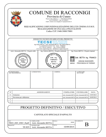 TECSE ENGINEERING Studio Associato - Ing. Franco BETTA - Arch. Alessandro BETTA - Ing. Fabrizio BETTA - TORINO COMUNE DI RACCONIGI Piazza Carlo Alberto n. 1 – 12035 Racconigi (CN) Tel. (+39) 0172 821611 – fax (+39) 0172 85875 e-mail [email protected] LUOGO: Comune di Racconigi (CN) - Via Carlo Costa n. 21-27 CAPITOLATO SPECIALE D’APPALTO PROGETTO DEFINITIVO/ESECUTIVO RIQUALIFICAZIONE E RIFUNZIONALIZZAZIONE DELL'EX CINEMA S.O.M.S. REALIZZAZIONE DI SALA POLIVALENTE Importo per l’esecuzione delle lavorazioni € 655.873,07 Importo per l’attuazione dei piani di sicurezza (non soggetto a ribasso) € 16.126,93 IMPORTO COMPLESSIVO DELL’APPALTO € 672.000,00 COMUNE DI RACCONIGI – RIQUALIFICAZIONE E RIFUNZIONALIZZAZIONE EX CINEMA S.O.M.S. – REALIZZAZIONE SALA POLIVALENTE TS823 - PROGETTO DEFINITIVO/ESECUTIVO – Elab. B – CAPITOLATO SPECIALE D’APPALTO – REVISIONE 01 DEL 10/09/2015. - 1 - TECSE ENGINEERING Studio Associato - Ing. Franco BETTA - Arch. Alessandro BETTA - Ing. Fabrizio BETTA - TORINO SOMMARIO ELENCO DEGLI ELABORATI..................................................................................................................................................................4 CAPO I ......................................................................................................................................................................................................6 DESCRIZIONE SINTETICA DEI LAVORI................................................................................................................................................6 CAPITOLO 1 - FORMA DELL'APPALTO – DESCRIZIONE SOMMARIA DELLE OPERE....................................................................6 CAPITOLO 3 - OGGETTO DELL'APPALTO .........................................................................................................................................12 CAPITOLO 4 – NORMATIVA DI RIFERIMENTO ..................................................................................................................................12 CAPITOLO 5 - AMMONTARE DEI LAVORI ..........................................................................................................................................18 CAPITOLO 6 - VARIAZIONE DELLE OPERE APPALTATE.................................................................................................................20 CAPITOLO 7 - ORDINE DA TENERSI NELL'ESECUZIONE DEI LAVORI E TIPO DI CANTIERE AI SENSI DEL D.LGS. 81/2008 E SUCCESSIVE MODIFICAZIONI ............................................................................................................................................................20 CAPITOLO 8 - RIFERIMENTO AL CAPITOLATO GENERALE PER I LAVORI PUBBLICI ................................................................24 CAPITOLO 9 - DOCUMENTI FACENTI PARTE DEL CONTRATTO ...................................................................................................24 CAPITOLO 10 - DISPONIBILITA' DELLE AREE - DANNI A TERZI .....................................................................................................26 CAPITOLO 11 - CAUZIONE PROVVISORIA ........................................................................................................................................26 CAPITOLO 12 - GARANZIA FIDEIUSSORIA O CAUZIONE DEFINITIVA...........................................................................................26 CAPITOLO 13 - TEMPO UTILE - PENALE DI RITARDO .....................................................................................................................27 CAPITOLO 14 – SOSPENSIONE E PROROGHE ................................................................................................................................28 CAPITOLO 15 - CONSEGNA ED INIZIO DEI LAVORI - TRACCIAMENTI .........................................................................................28 CAPITOLO 16 - DISCIPLINA ECONOMICA DELL’ESECUZIONE DEI LAVORI E REVISIONE PREZZI ..........................................29 CAPITOLO 17 - PAGAMENTI IN ACCONTO........................................................................................................................................29 CAPITOLO 18 - STATO FINALE - CONTO FINALE .............................................................................................................................29 CAPITOLO 19 - MATERIALI ED OGGETTI DI VALORE......................................................................................................................30 CAPITOLO 20 - COLLAUDO DEI LAVORI - PROVVISORIO E DEFINITIVO .....................................................................................30 CAPITOLO 21 - ONERI ED OBBLIGHI DIVERSI A CARICO DELL'APPALTATORE .........................................................................32 CAPITOLO 22 - CONTRATTI COLLETTIVI E DISPOSIZIONI SULLA MANODOPERA .....................................................................33 CAPITOLO 23 - APPROVAZIONE DEI PROGETTI COSTRUTTIVI DI CANTIERE............................................................................34 CAPITOLO 24 - MANUTENZIONE DELLE OPERE IN GENERE ........................................................................................................34 CAPITOLO 25 – DANNI CAUSATI DA FORZA MAGGIORE................................................................................................................35 CAPITOLO 26 - ORDINI DELLA DIREZIONE LAVORI.........................................................................................................................35 CAPITOLO 27 – PROGRAMMA ESECUTIVO DEI LAVORI DELL’APPALTATORE E CRONOPROGRAMMA................................35 CAPITOLO 28 - SUBAPPALTI - CESSIONE CREDITI - PRESENZA DELL'APPALTATORE IN CANTIERE....................................36 CAPITOLO 29 - CONTESTAZIONI - RESCISSIONE DEL CONTRATTO - ARBITRATO....................
